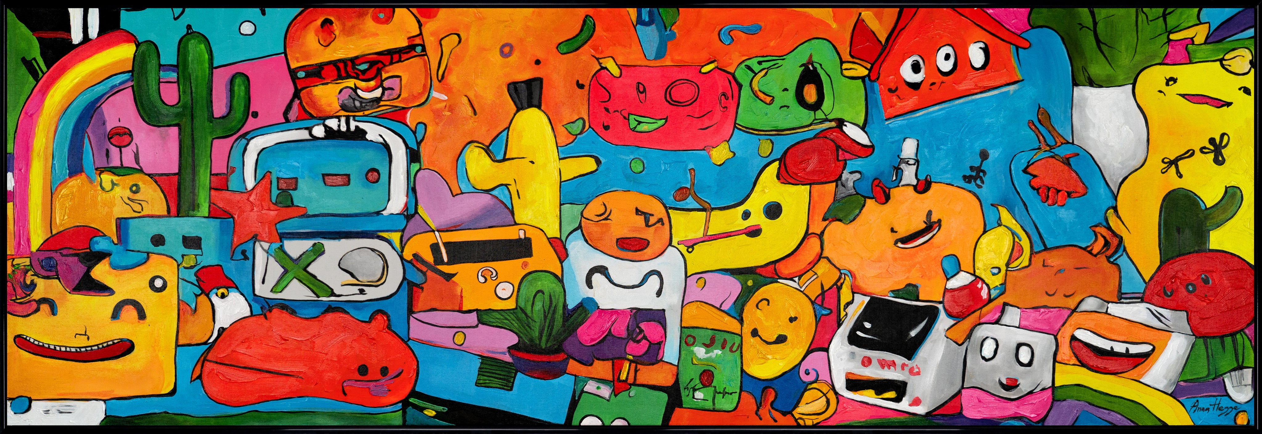 Käsinmaalattu akryylitaideteos kankaalle, joka tuo energiaa ja leikkisyyttä sisustukseen. "Värikäs Maailma" esittää sarjakuvamaisia hahmoja syvällä mustalla taustalla, yhdistäen kirkkaat värit – keltainen, oranssi, pinkki, sininen ja vihreä – strukturoidulla pinnalla, joka luo intensiivisen visuaalisen dynamiikan. Jokainen hahmo tuntuu kertovan oman tarinansa, tehden teoksesta hauskan ja mielenkiintoisen katseenvangitsijan.