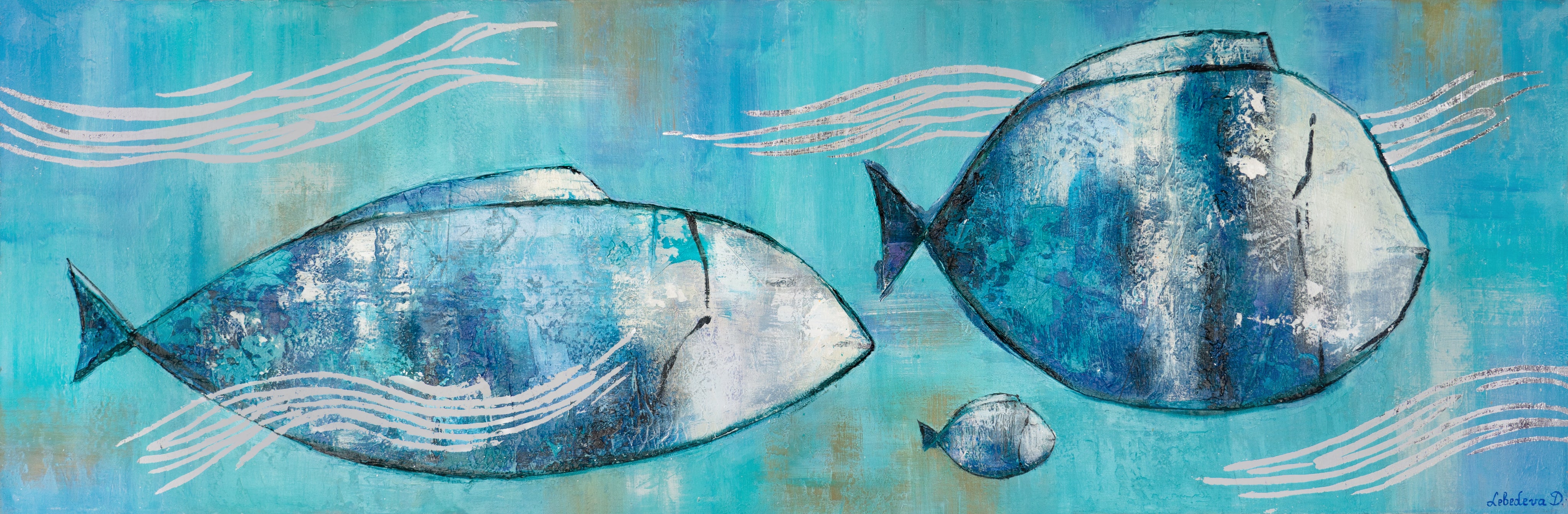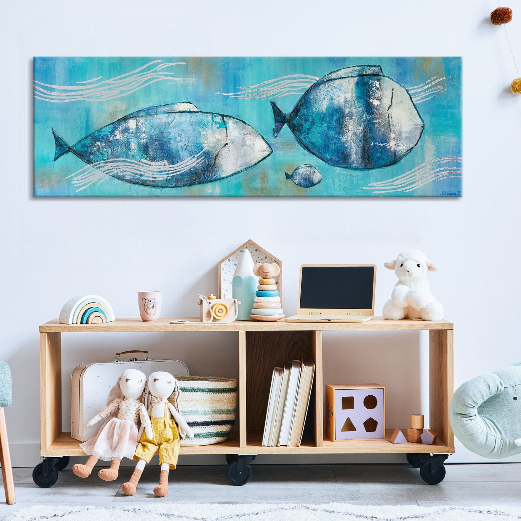 Kangasmaalaus „Matkustavat kalat“ on käsinmaalattu akryylikangasmaalaus, joka luo rauhallisen ja raikkaan tunnelman merellisillä sinisen ja turkoosin sävyillä. Eloisat siveltimenvedot ja teksturoitu pinta antavat maalaukselle syvyyttä ja dynaamisuutta. Virtaavassa liikkeessä kuvattavat kalat symboloivat vapautta ja matkantekoa, tuoden elävää energiaa jokaiseen tilaan.