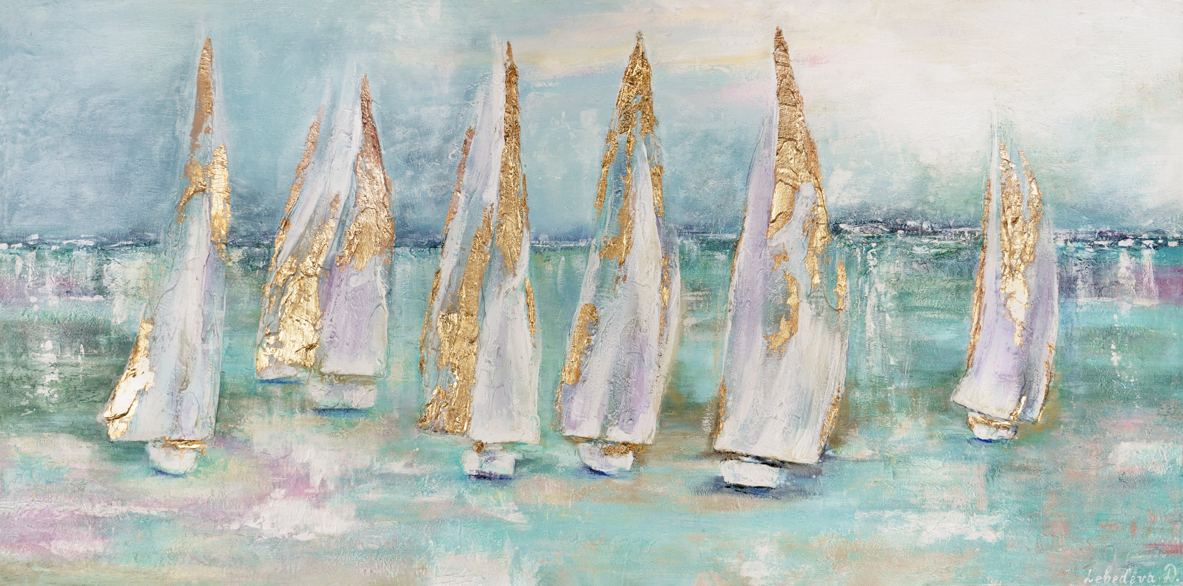 Käsinmaalattu akryylimaalaus „Purjeveneet“ esittää rauhallisen merellisen maiseman purjeveneineen tyynellä vedellä. Herkät pastellivärit yhdistettynä kultakorostuksiin luovat harmonisen ja rauhoittavan tunnelman. Eloisa, teksturoitu pinta tekee tästä canvas taulusta tyylikkään katseenvangitsijan missä tahansa tilassa.