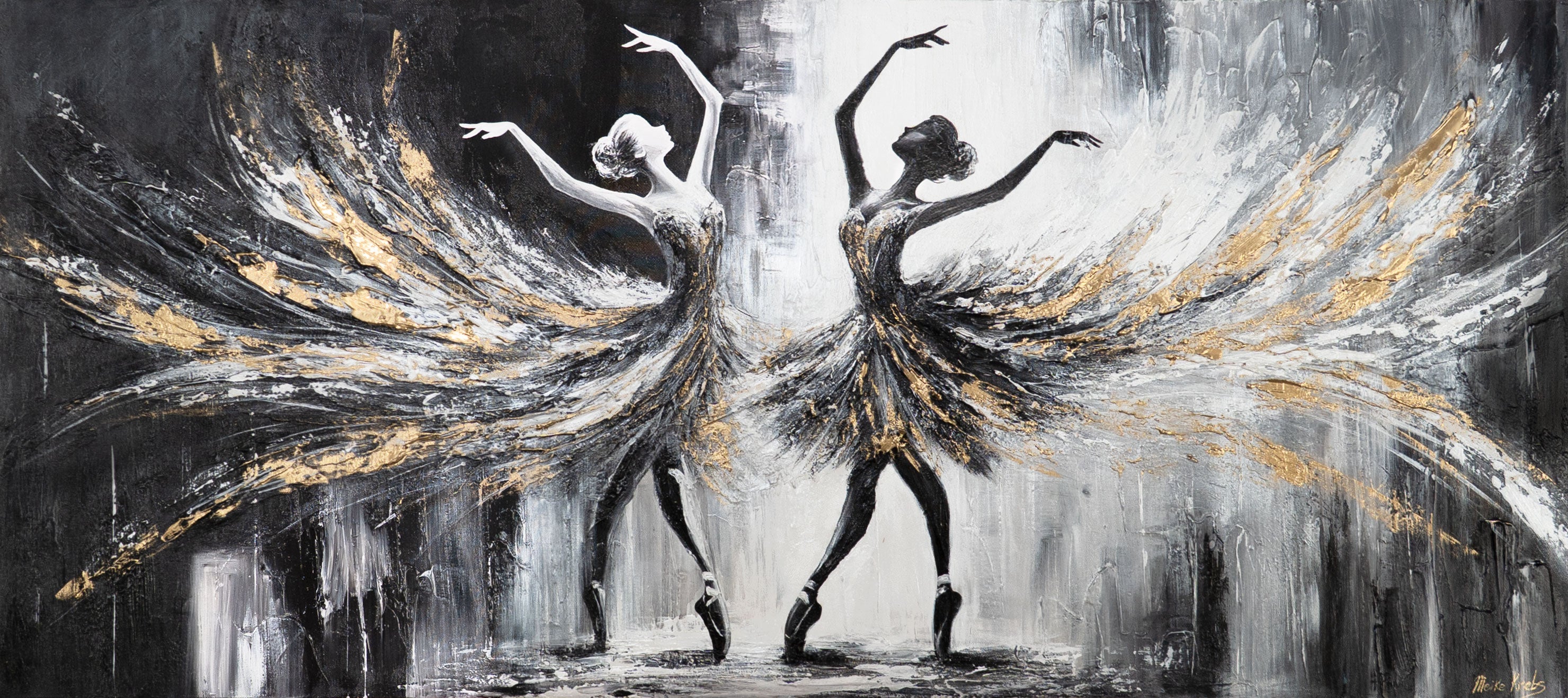 "Baletin Loisto"" on käsinmaalattu akryylimaalaus, joka esittää kahta tanssivaa Diivaa dynaamisessa liikkeessä. Vikkelät siveltimenvedot Musta, Valkoinen, Harmaa ja Kulta luovat abstrakti taide koostumuksen, joka yhdistää eleganssin ja energian.