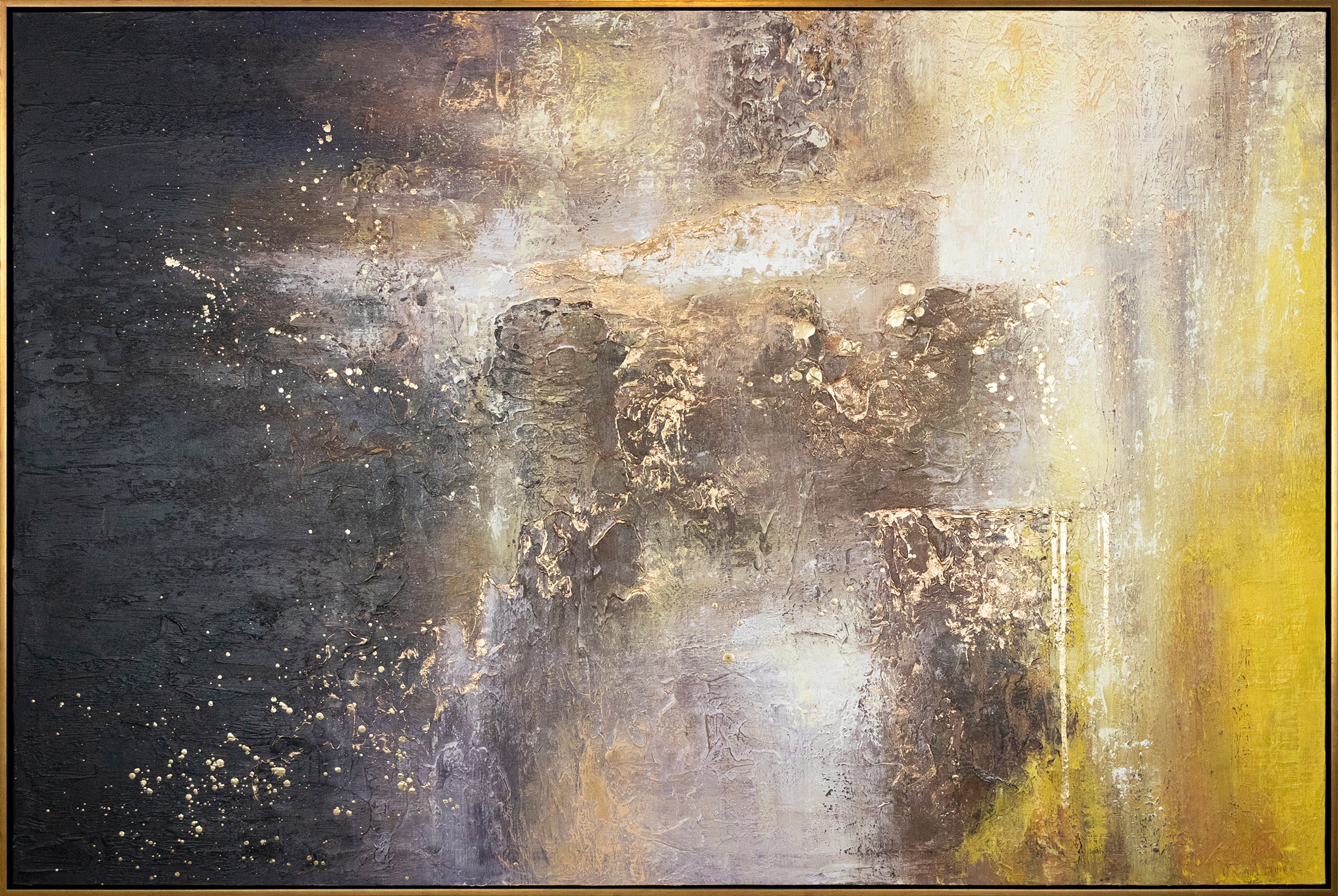 Tämä vaikuttava abstrakti taulu kankaalle yhdistää modernin taiteen kultaisiin ja tummiin yksityiskohtiin, tuoden syvyyttä ja eleganssia jokaiseen tilasuunnitteluun.