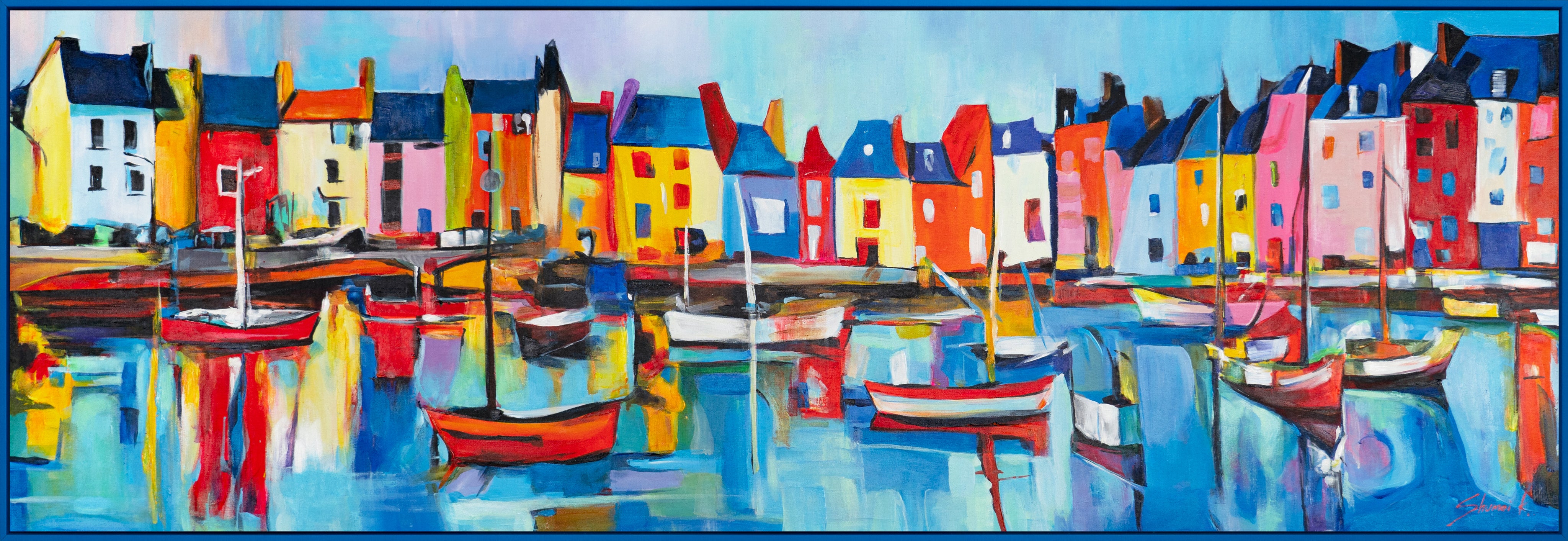 Rikasta kotiasi tai toimistoasi tällä värikkäällä, abstraktilla taululla, joka eloisilla väreillään esittää maalauksellisen satamanäkymän. Tämä maalaus hurmaa vahvoilla kontrasteilla ja ilmaisuvoimaisilla siveltimenvedoilla. Se on 100 % käsinmaalattu ja korostettu elegantilla sinisellä kehyksellä.
