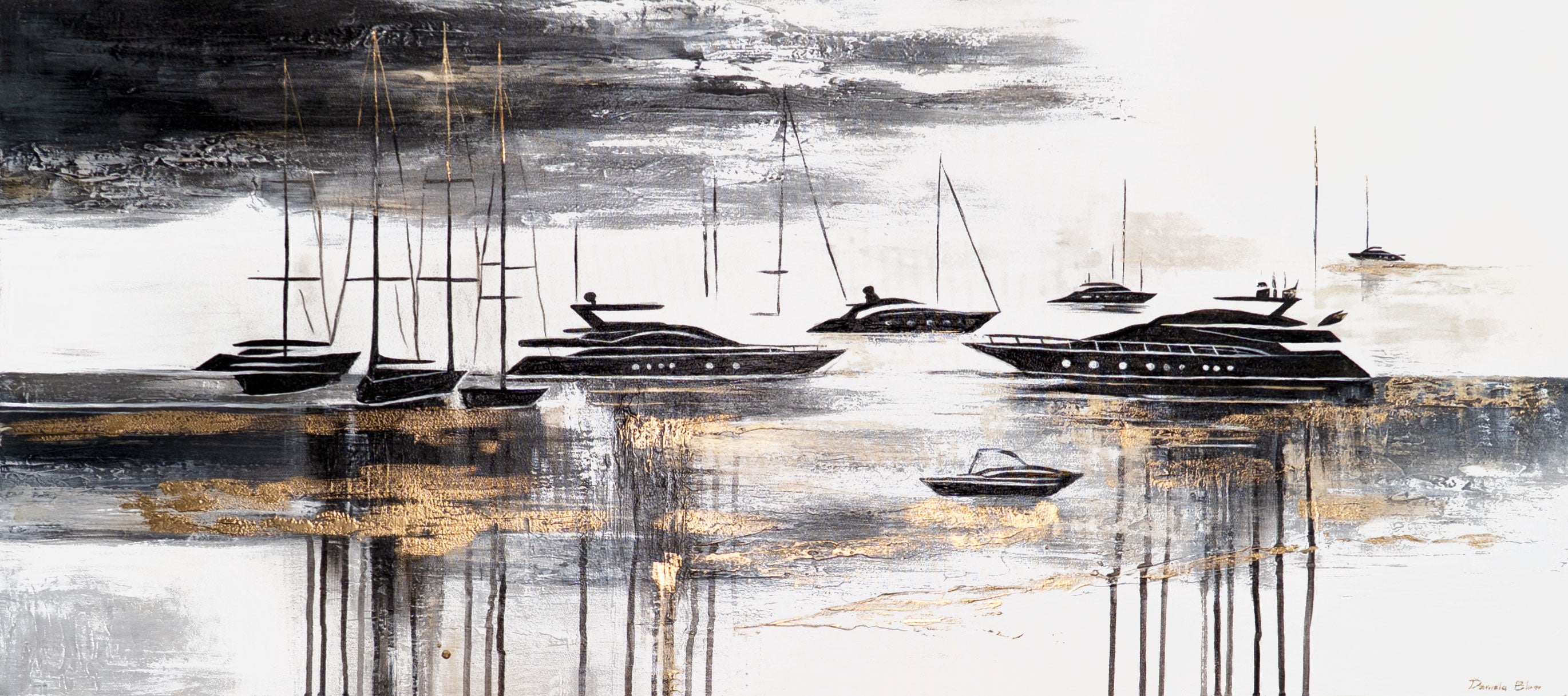 „Jahtit“ on tyylikäs, käsinmaalattu akryylimaalaus, joka esittää rauhallista merimaisemaa eleganttien jahtien kanssa mustan, valkoisen ja kullan sävyissä. Rakenteellinen maalaus abstrakti antaa esitykselle syvyyttä ja kiiltoa, kun taas monochrominen kontrasti kultaisin korostuksin luo modernin, ylellisen ilmapiirin.