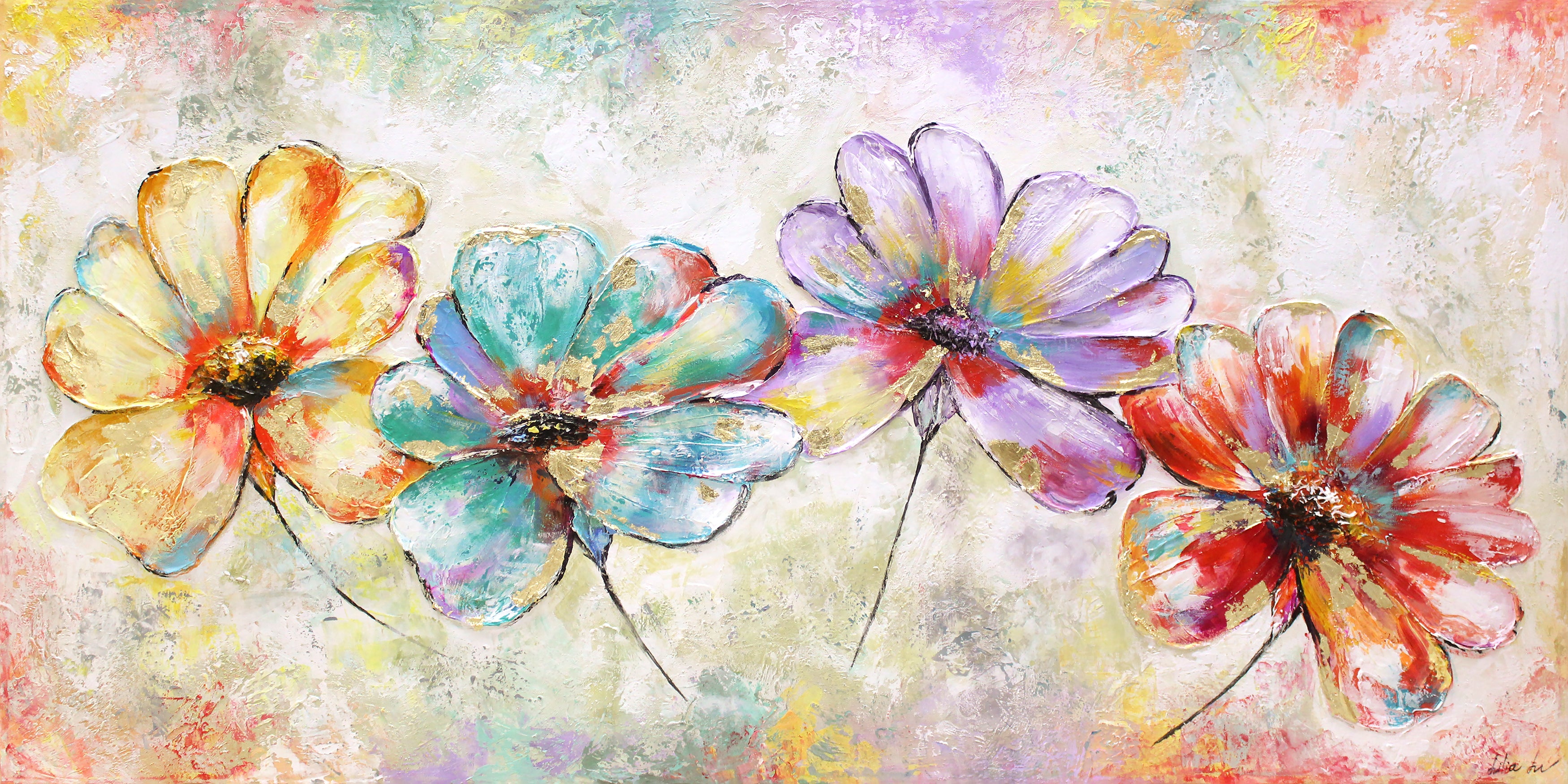 Kolmiulotteinen, käsinmaalattu akryylikangasmaalaus „Kauniit Kukat“ esittelee eloisan ja värikkään kukkaniityn, joka tuo iloa ja raikkautta jokaiseen tilaan. Voimakkaat värit ja dynaamiset siveltimenvedot tekevät tästä värikkäästä taulusta täydellisen sisustustaulun olohuoneeseen, lastenhuoneeseen tai toimistoon.
