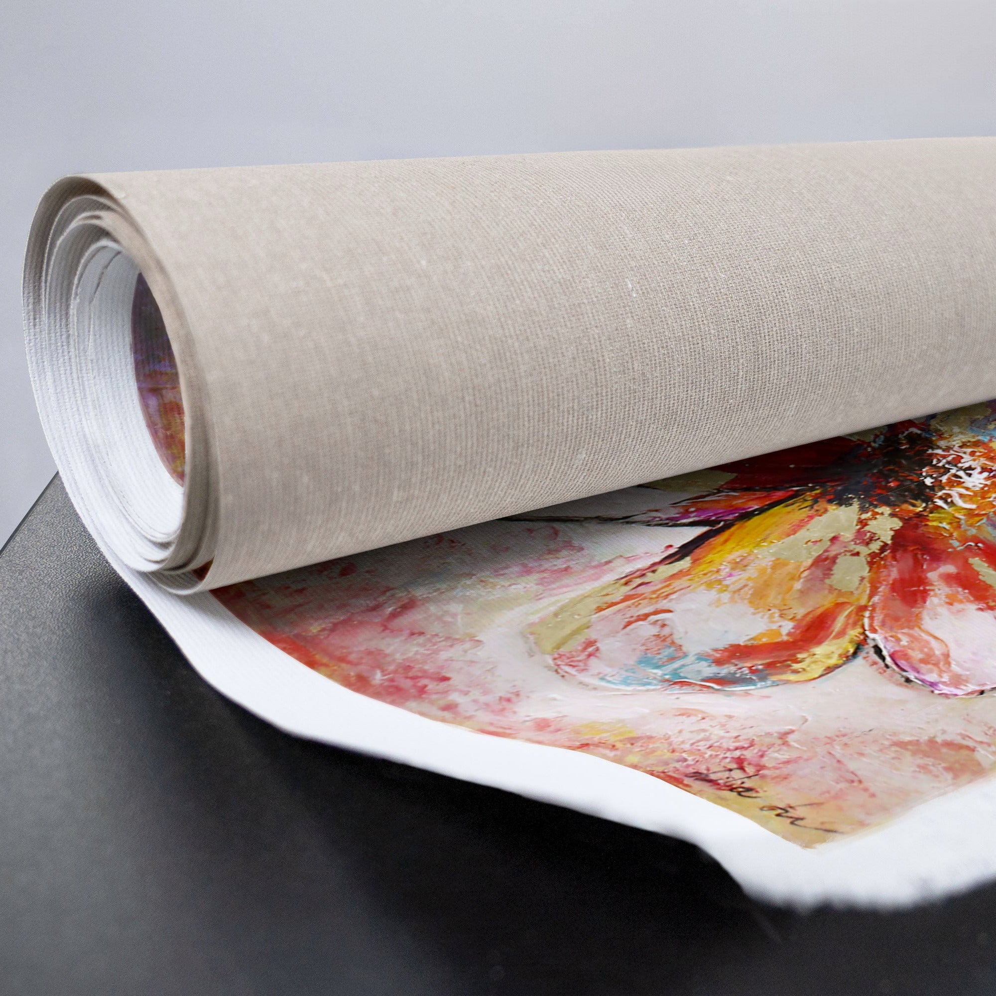 Rakenteellinen pinta tuo maalaukseen syvyyttä ja korostaa sen ainutlaatuista käsityölaatua. Tämä käsinmaalattu taulu sopii myös lahjaksi kukkien ystäville ja toimii upeana koristeena modernissa sisustuksessa.