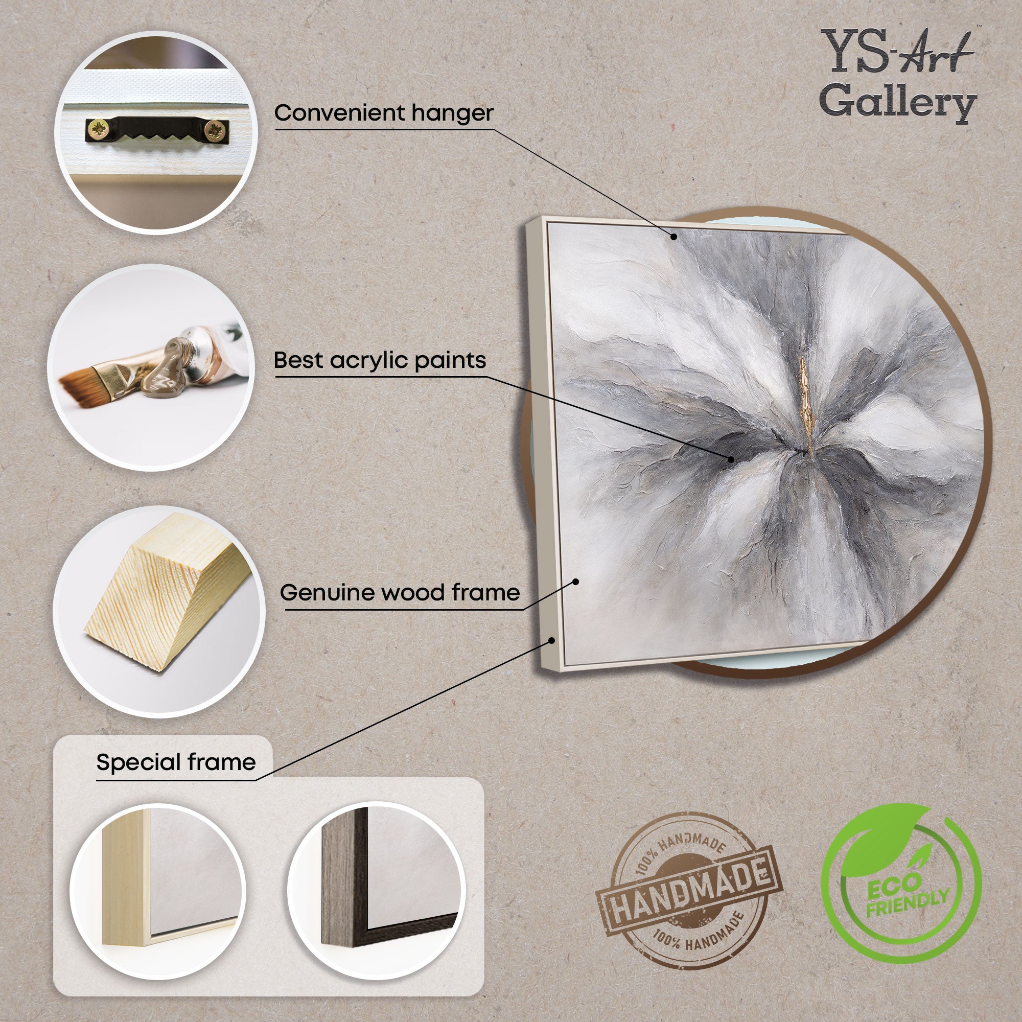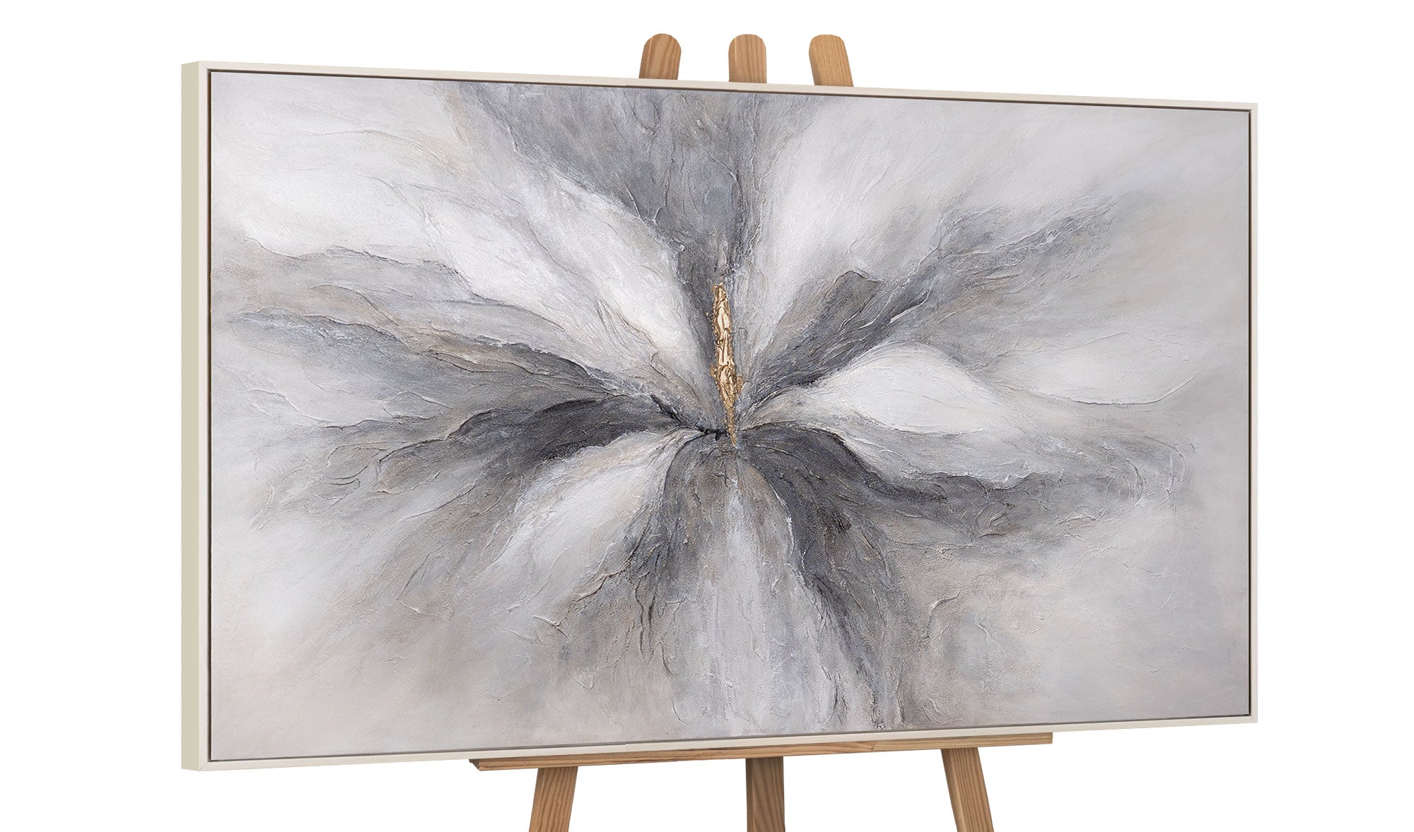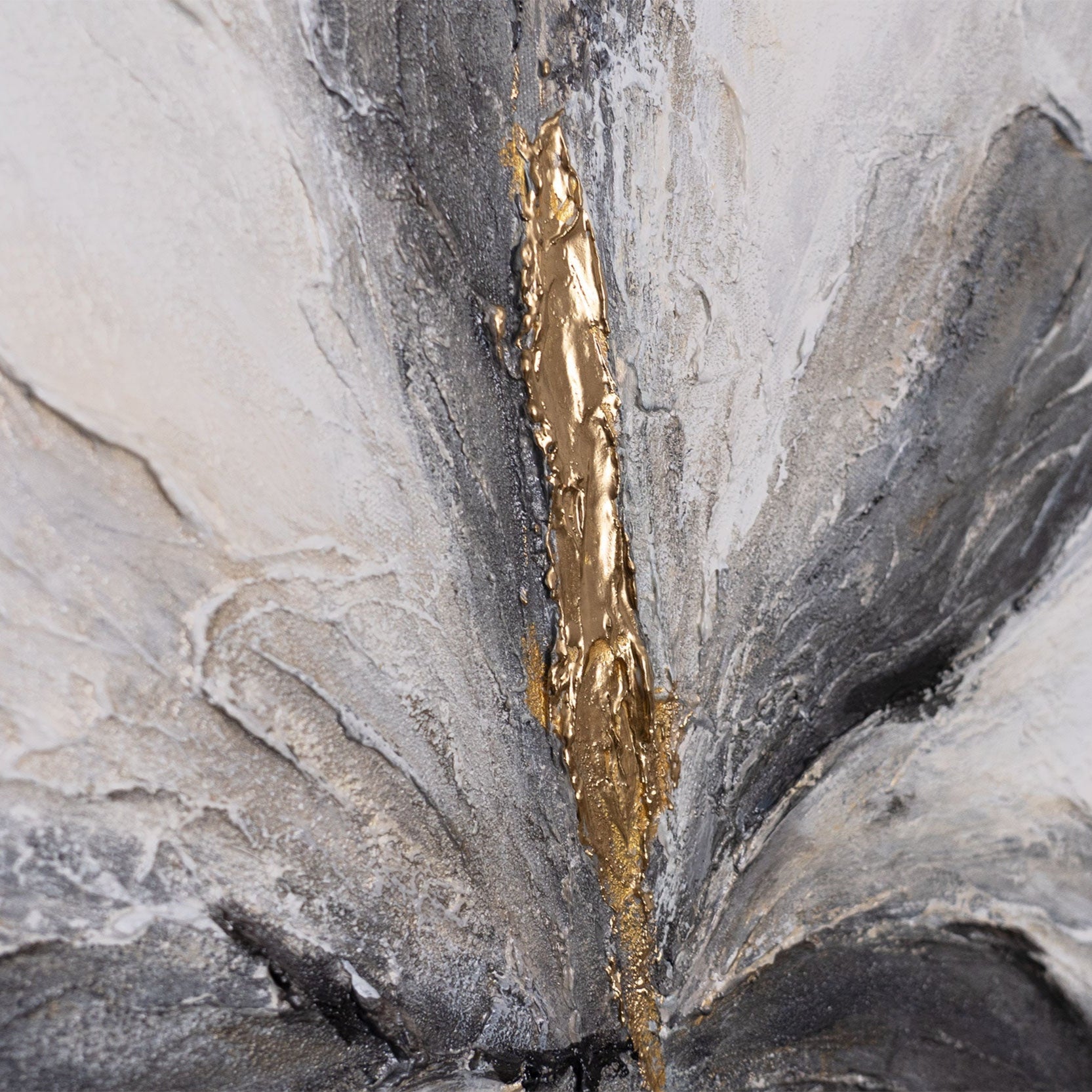 "Kultainen hetki" on elegantti, käsinmaalattu akryyliteos, joka hurmaa ajattomalla harmaan, valkoisen ja beigen väriyhdistelmällä. Teoksen keskellä kulkeva kultainen korostus läpäisee kokonaisuuden jalolla lämmöllä ja saa reliefimäisen pinnan hehkumaan. Plastiset siveltimenvedot antavat työlle syvyyttä ja dynamiikkaa, jolloin sen säteily on harmoninen ja täynnä eleganssia.