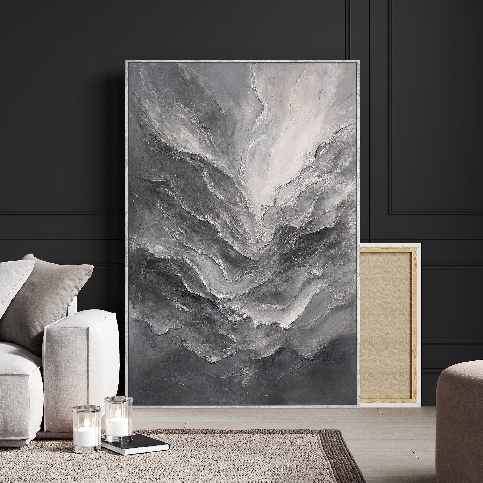 „Kallioiden muisto“ on käsinmaalattu akryylimaalaus, joka heijastaa luonnon voimaa ja pysyvyyttä. Erilaisissa harmaan sävyissä ja kivimäisissä vivahteissa avautuvat abstraktit muodot, jotka muistuttavat kallioiden muodostelmia. Paksu rakenne tuo kuvaan syvyyttä ja elävyyttä ja korostaa sen maanläheistä eleganssia.