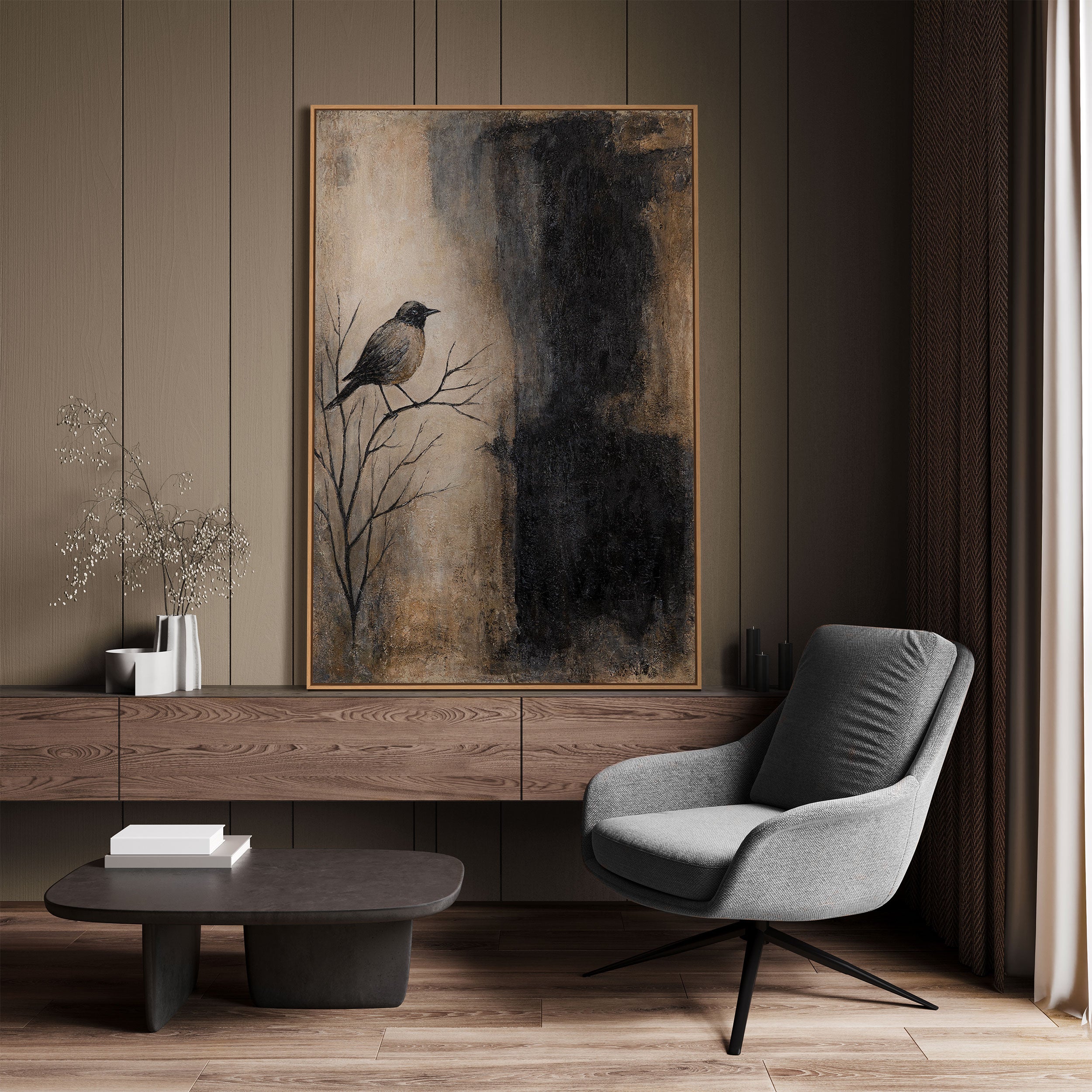 „Oksa ja varjo“ on käsinmaalattu akryylimaalaus, joka hurmaa vahvalla luontoaiheellaan. Yksinäinen lintu istuu paljailla oksilla, upotettuna kontrastiseen sommitelmaan lämpimiä beigen sävyjä, maanläheisiä ruskeita ja syvää mustaa. Rakenteinen pinta antaa teokselle syvyyttä ja elävää tuntua, joka vangitsee katseen.