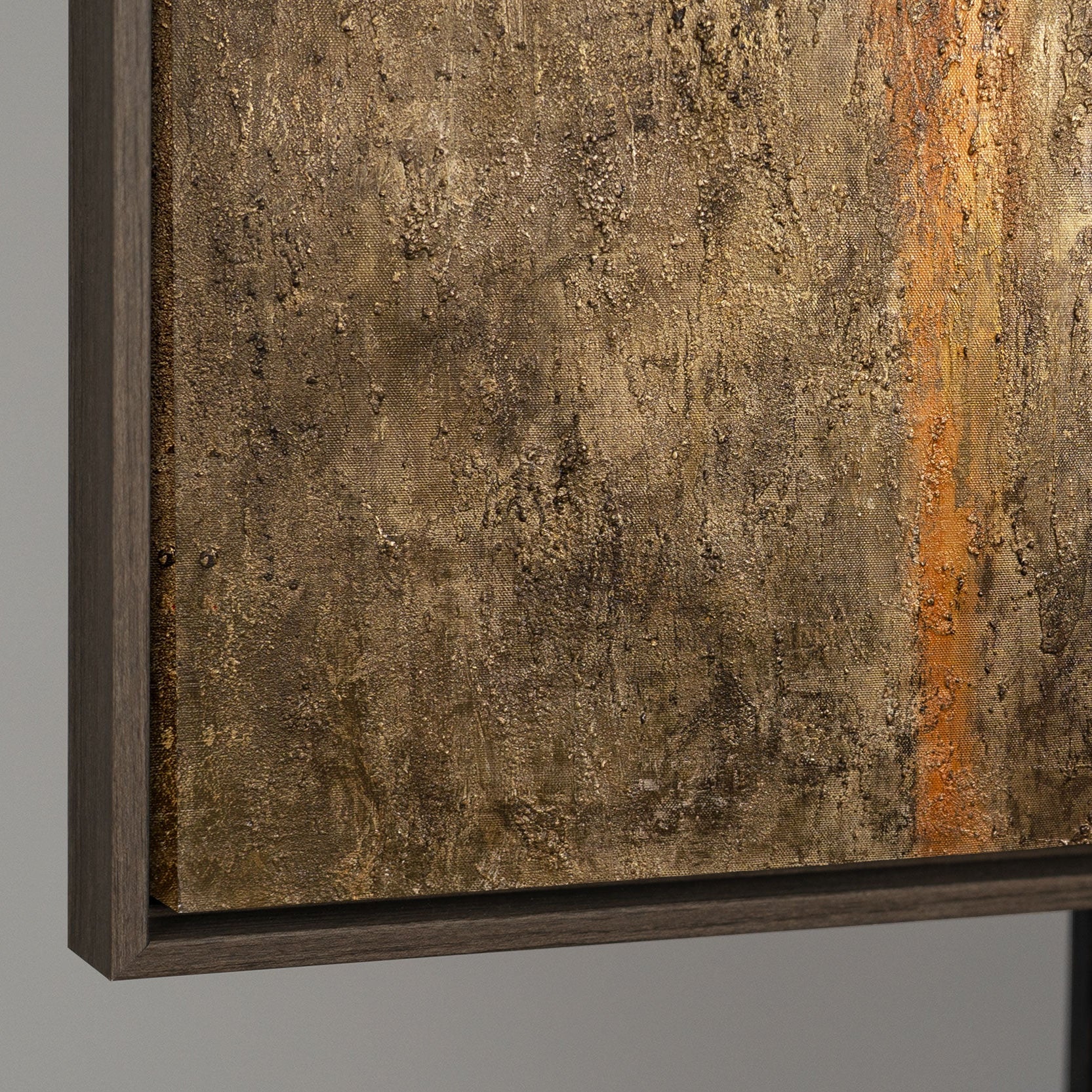 • Detail eines abstrakten Leinwandbildes mit Rosteffekt in Braun und Grau