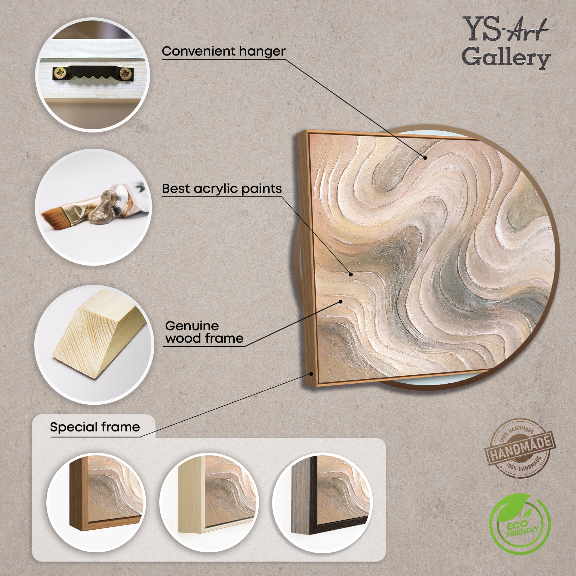 Dieses handgemalte abstrakte Wandbild zeichnet sich durch weich fließende Formen und eine harmonische Naturfarbpalette aus. Sanfte Beige-, Creme- und Grautöne verschmelzen zu einer ruhigen Bewegung, die Tiefe und Leichtigkeit zugleich vermittelt. Die strukturierte Oberfläche verstärkt den plastischen Eindruck und verleiht dem Gemälde eine elegante, hochwertige Wirkung.