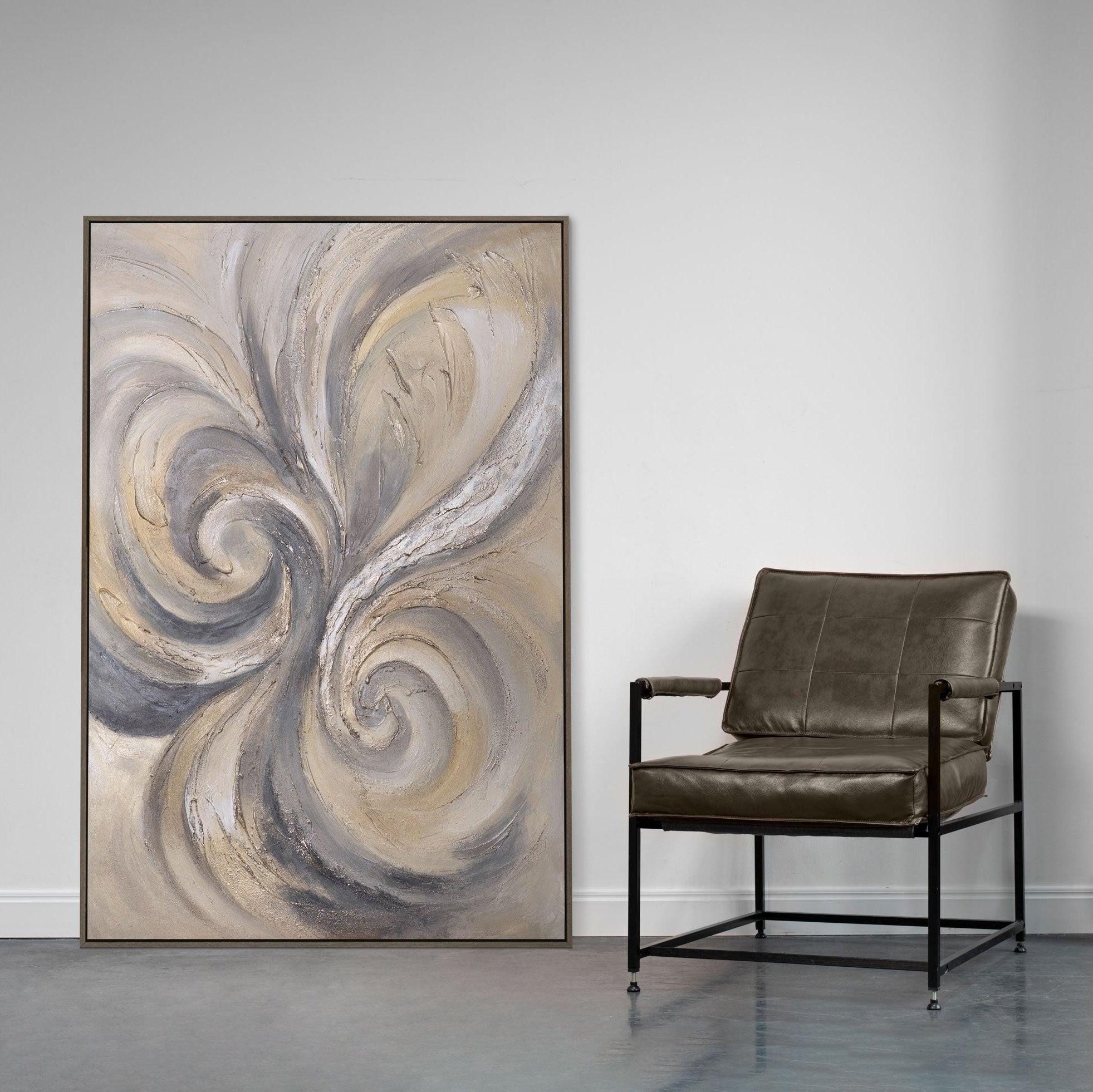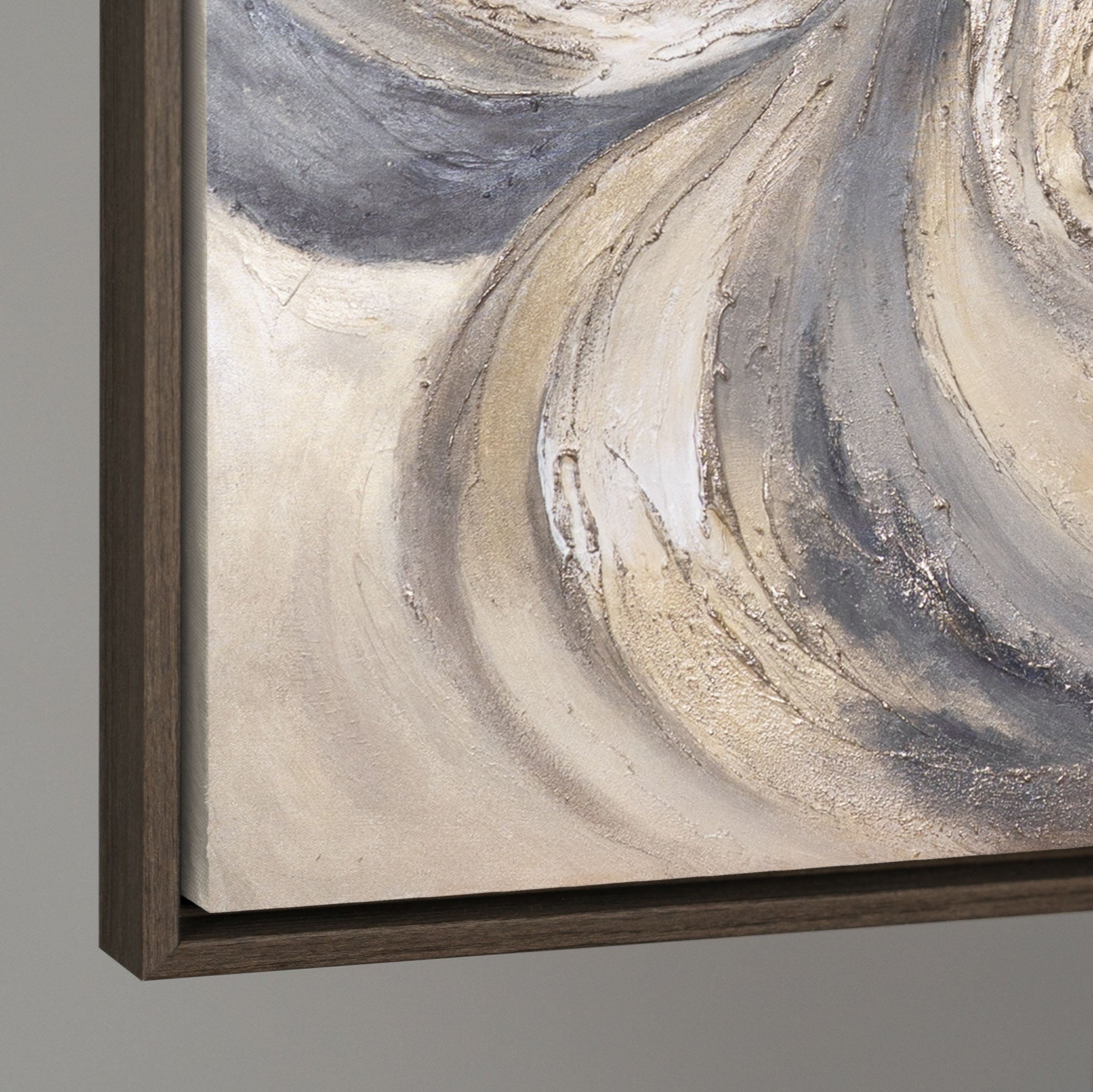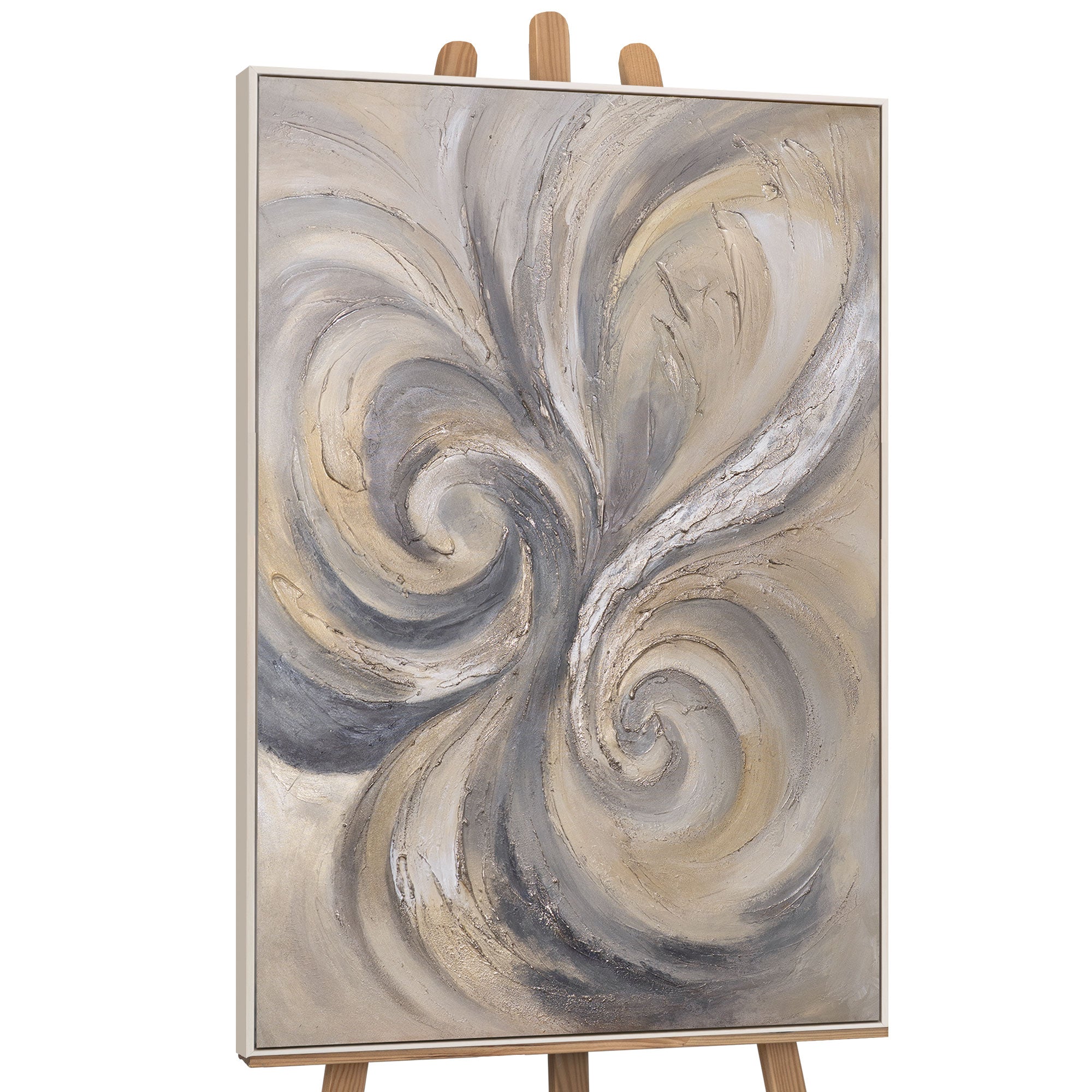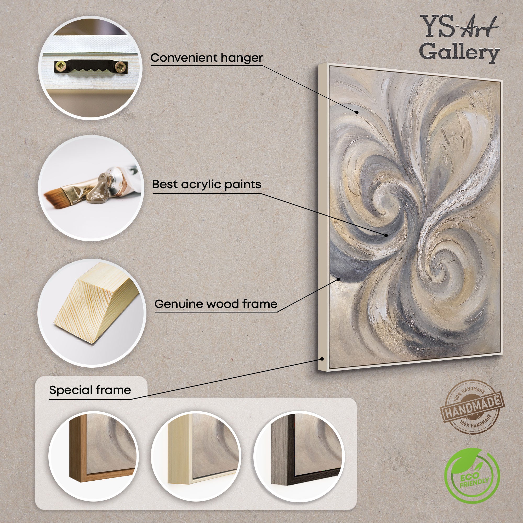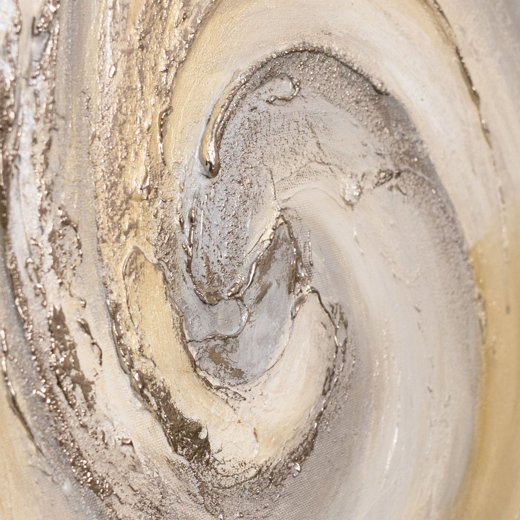 Käsinmaalattu canvas taulu "Hiekka ja pilvet" yhdistää pehmeät beigen ja harmaat sävyt dynaamiseen spiraaliliikkeeseen. Reliefimäinen pinta luo syvyyttä ja tuo mieleen tuulen, hiekan ja pilvien loputtoman liikkeen. Tämä teos kiehtoo energiallaan ja samalla harmonisella rauhallisuudellaan.