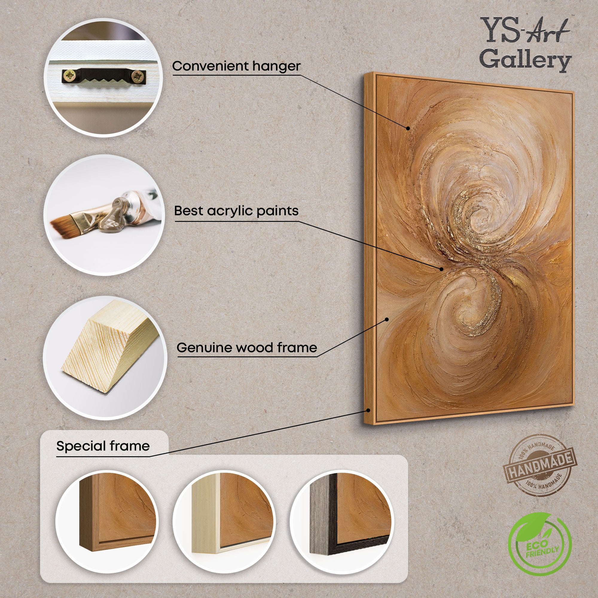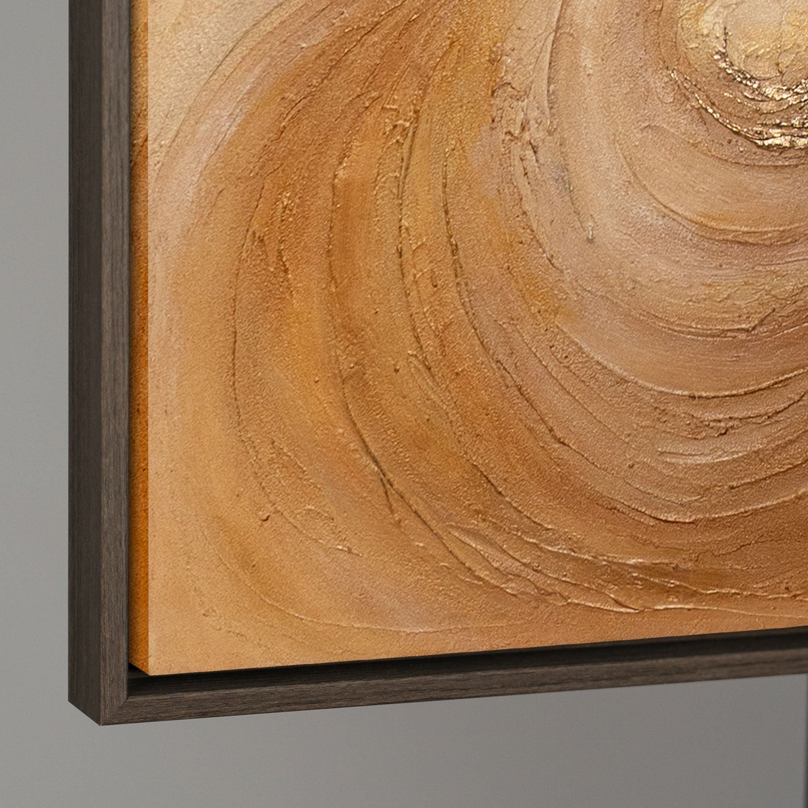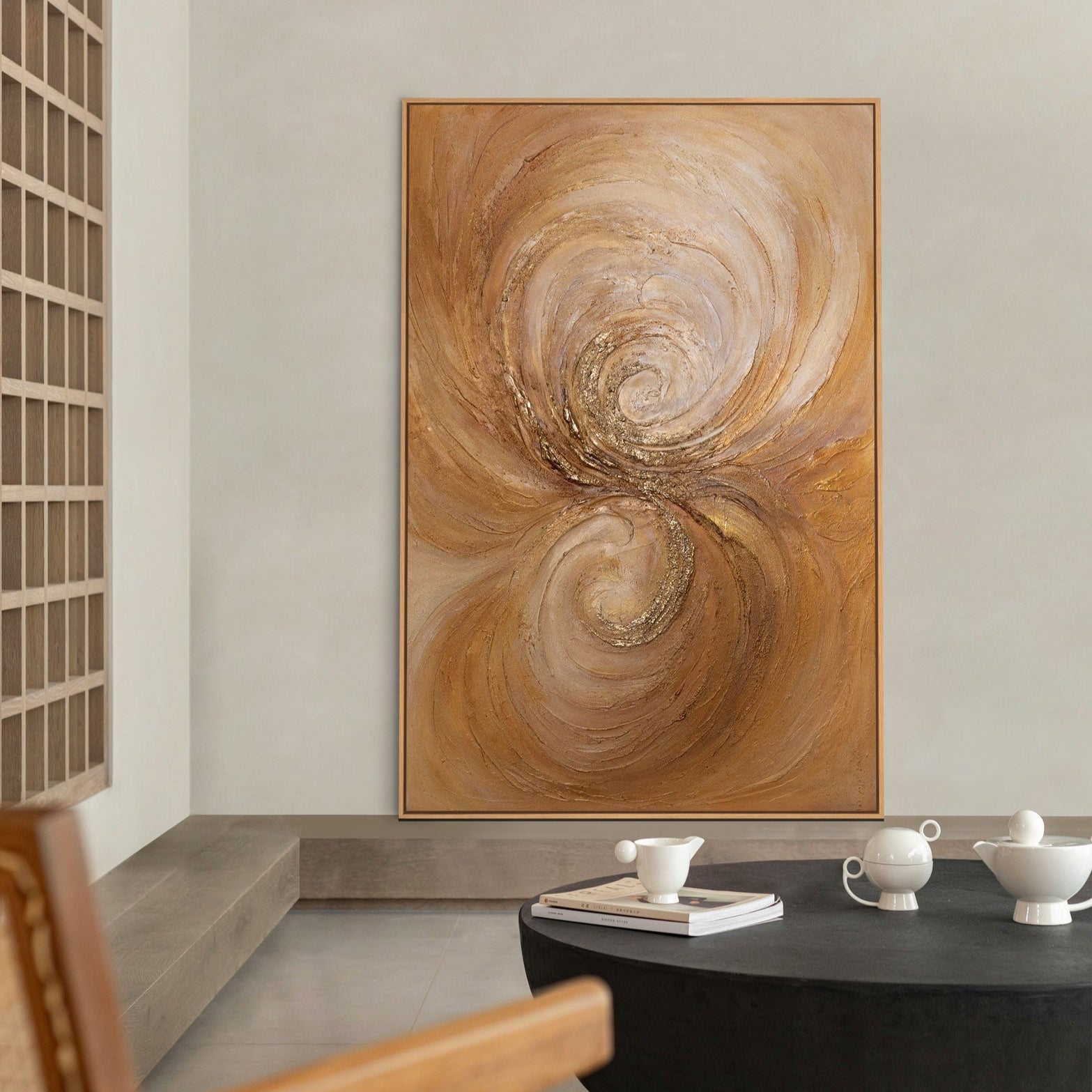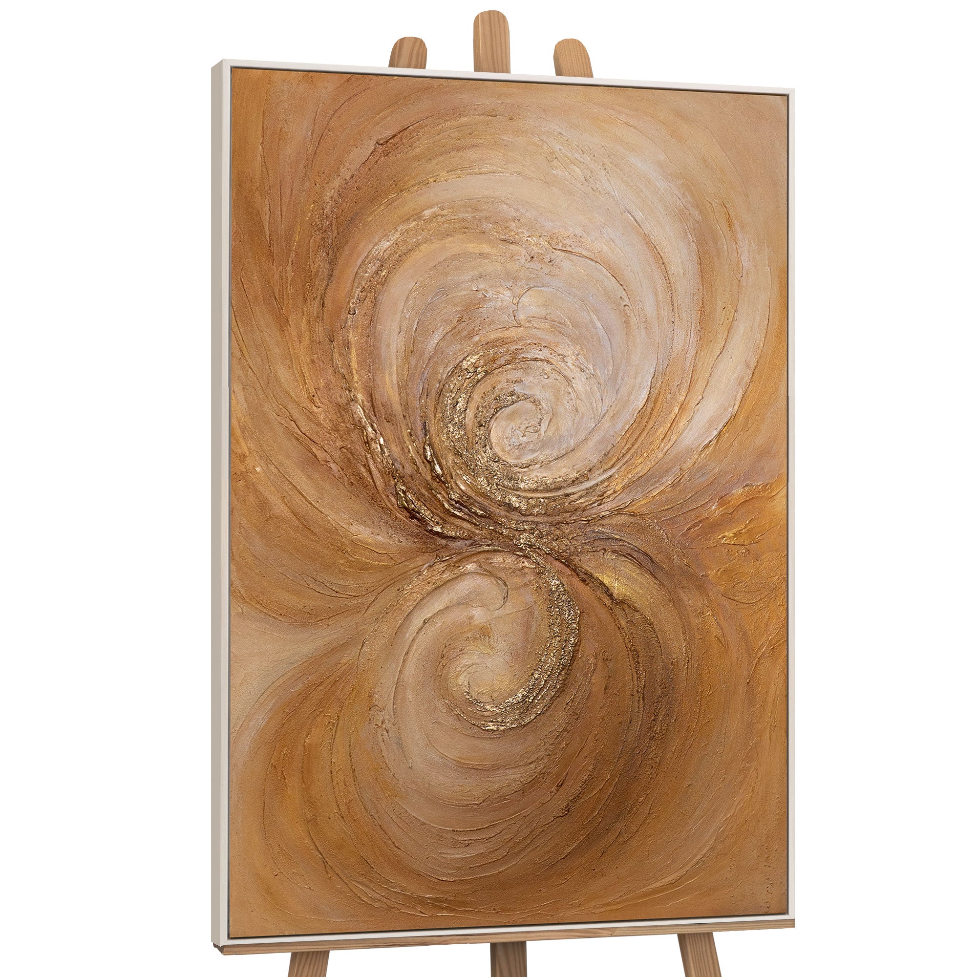 Akryylityö "Lämmön pyörre" avaa voimansa pehmeissä pyörteissä ja kultaisissa korostuksissa. Lämpimät ruskean ja beigen sävyt sulautuvat hienoihin tekstuureihin ja luovat dynaamisen, lähes tanssivan liikkeen, joka täyttää tilan kodikkaalla ja samalla elegantilla ilmapiirillä.