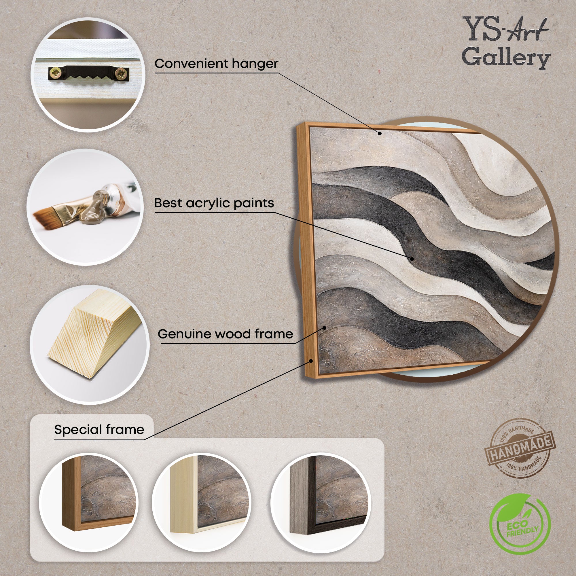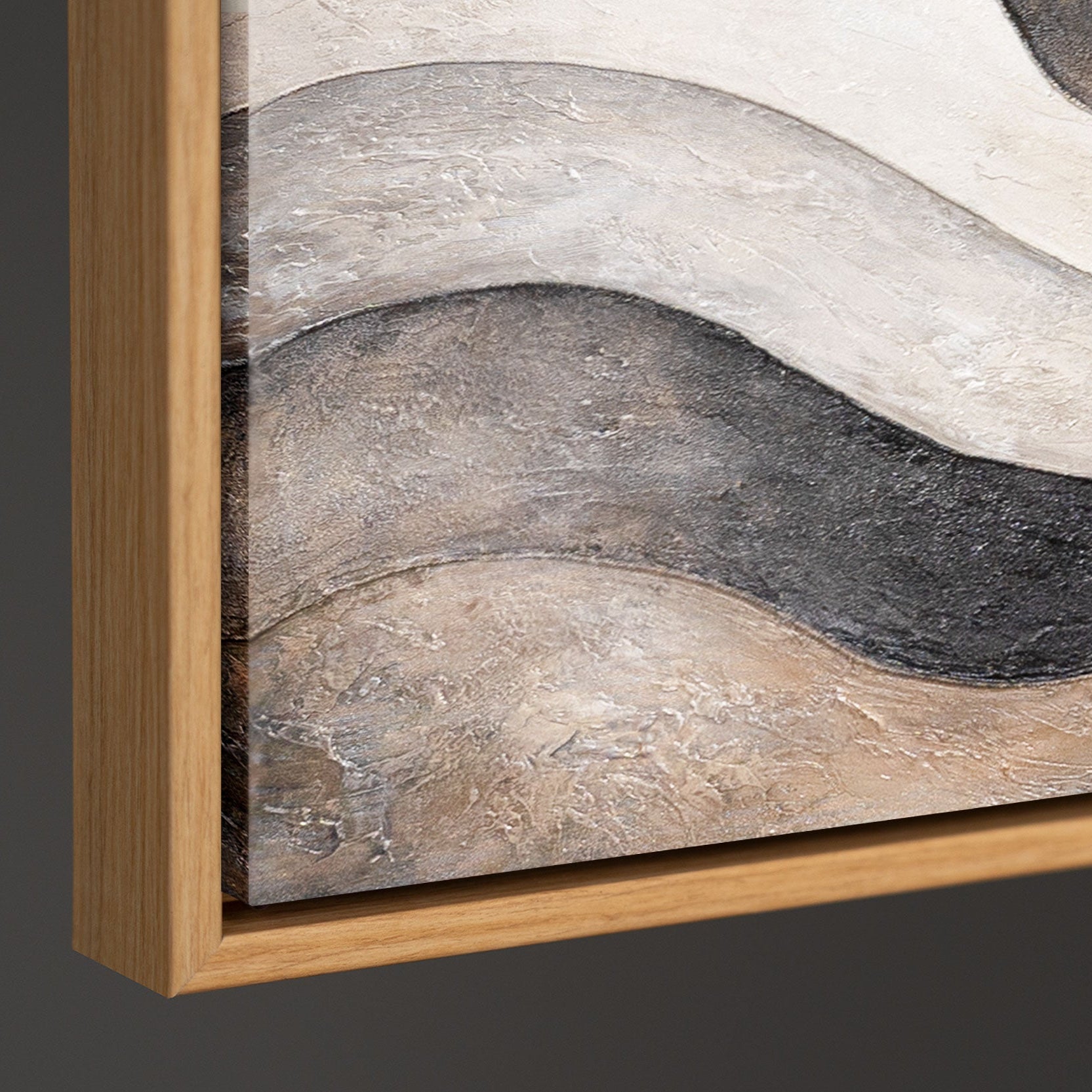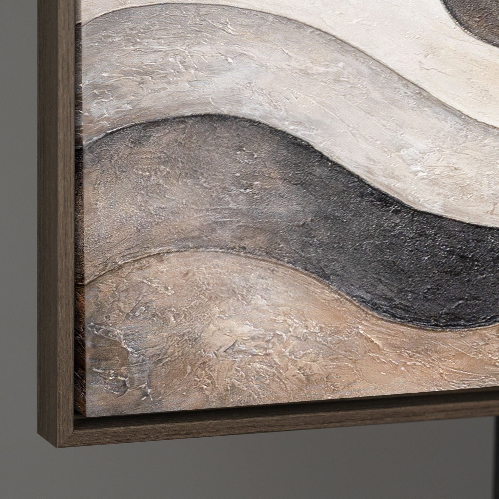 "Hiekkalainetta" on käsinmaalattu akryylimaalaus kankaalle, joka tekee vaikutuksen orgaanisilla muodoillaan ja hienolla reliefirakenteellaan. Pehmeissä sävyissä beigeä, kermaa, harmaata ja mustaa syntyy kaarevia linjoja, jotka muistuttavat luonnollisia dyynimaisemia. Jokainen siveltimen veto tuo syvyyttä ja liikettä sommitelmaan, jolloin syntyy harmoninen leikki valosta ja varjosta.