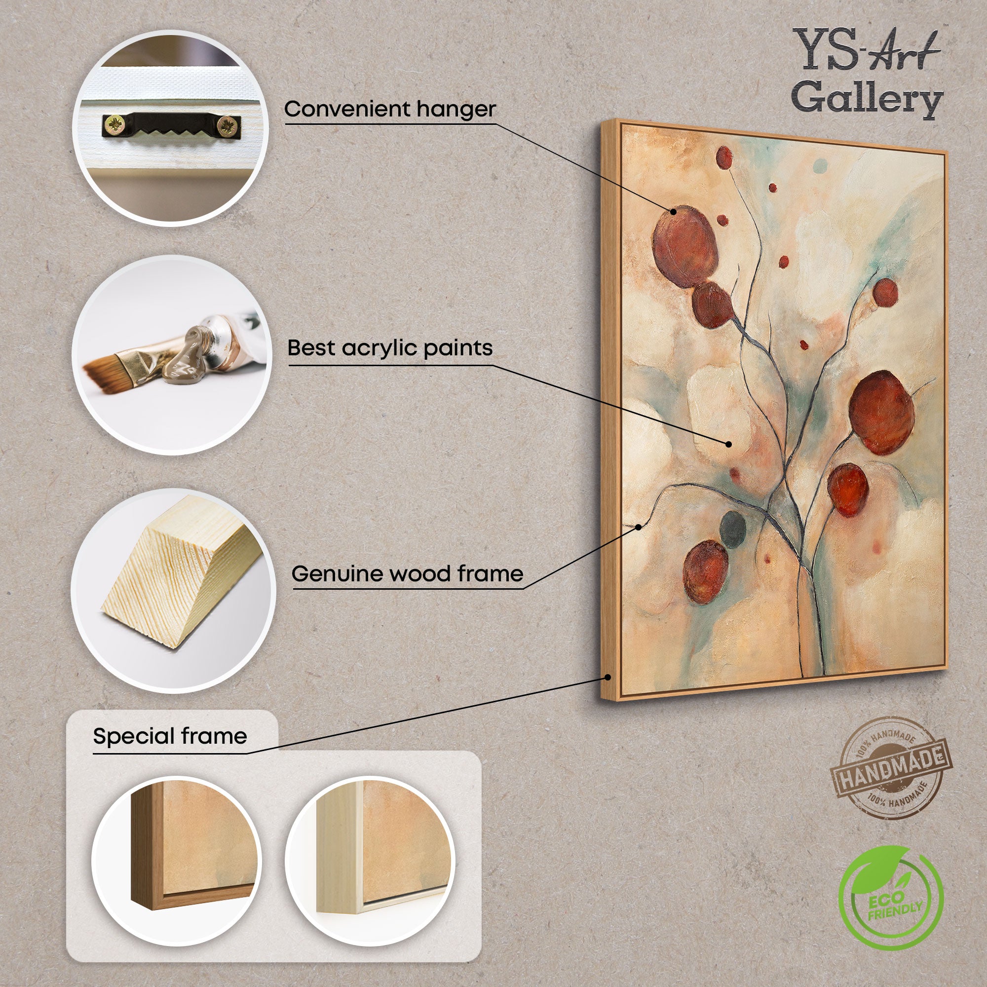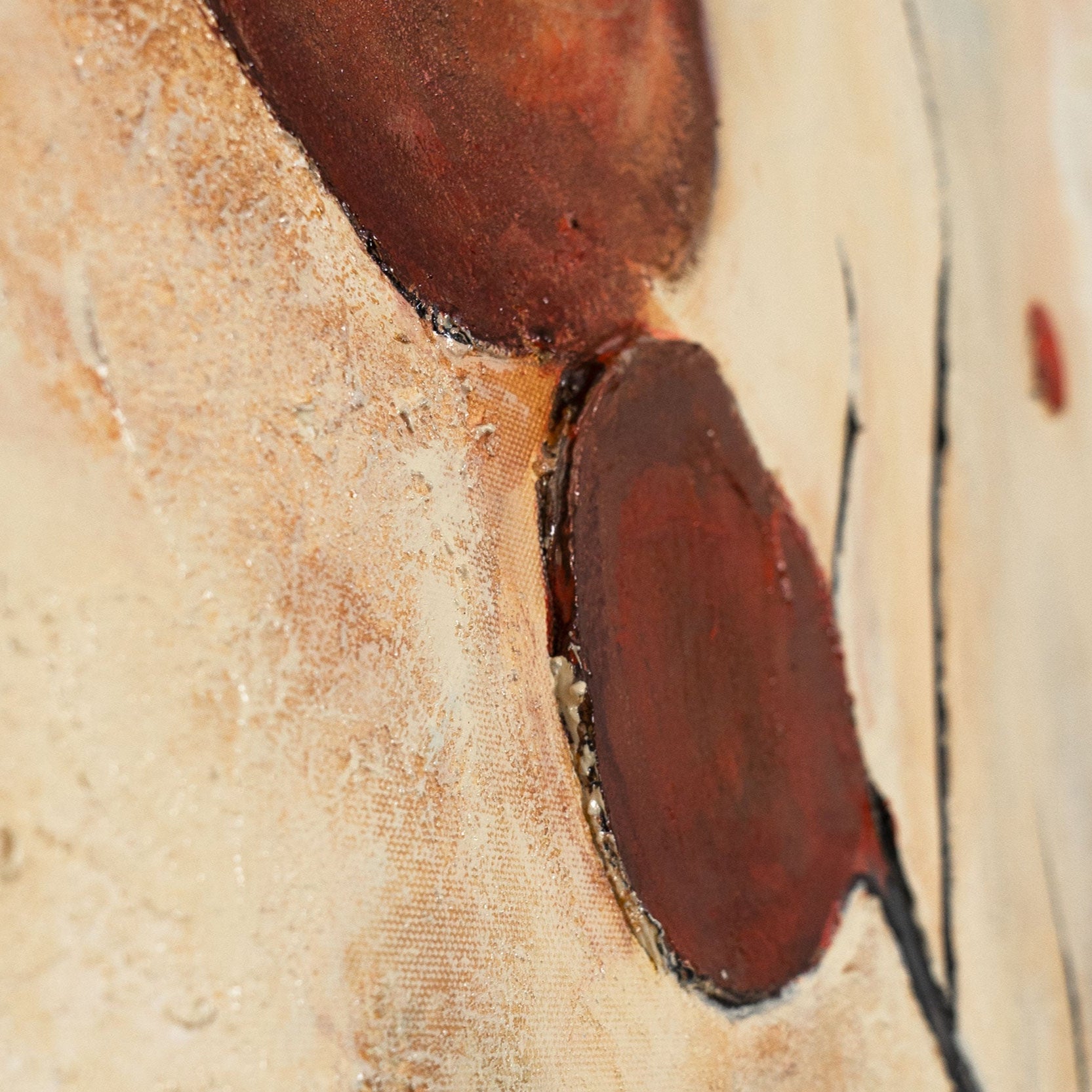 "Scharlakinpunaiset tähtikuviot" on käsinmaalattu akryylityö kankaalle, joka muistuttaa hehkuvia tähtikuvioita voimakkaiden punaisten pallojen ja hienojen linjojen ansiosta. Lämpimät beigen sävyt, pehmeät siniset huntumaiset vivahteet ja intensiiviset punaiset korostukset sulautuvat kiehtovaksi kokonaisuudeksi, joka huokuu sekä rauhaa että energiaa. Rakenteellinen pinta vahvistaa syvyyttä ja tekee jokaisesta yksityiskohdasta käsinkosketeltavan.