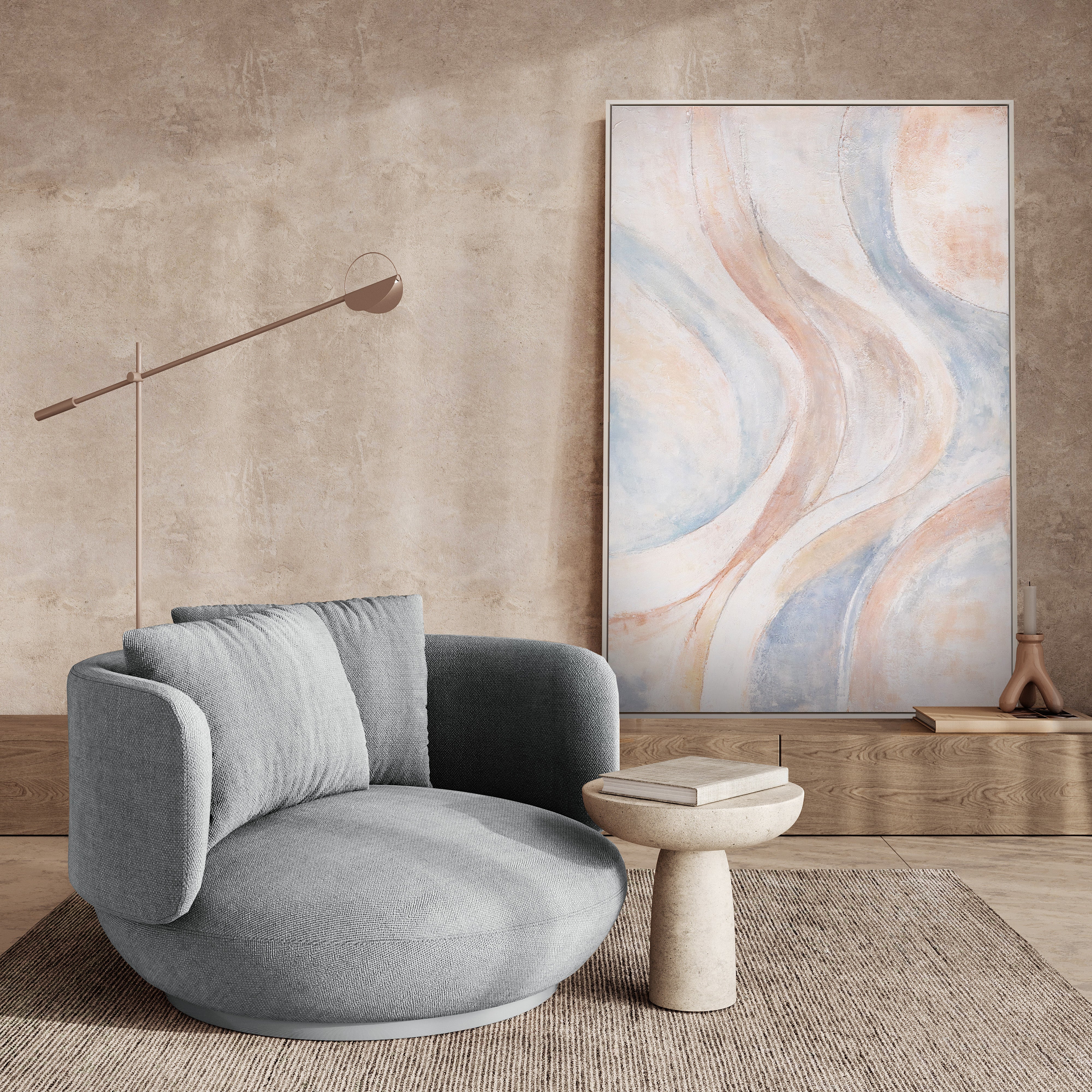 Tämä maalaus sopii erinomaisesti moderneihin, kirkkaisiin ja luonnollisiin sisätiloihin. Se näyttää ilmavalta, seesteiseltä ja hienostuneelta, sulautuen harmonisesti olohuoneisiin, makuuhuoneisiin, toimistoihin tai tyylikkäisiin vastaanottoalueisiin. ”Tuulilinjat” lisää pehmeän, ajattoman silauksen ilman visuaalista raskautta.
