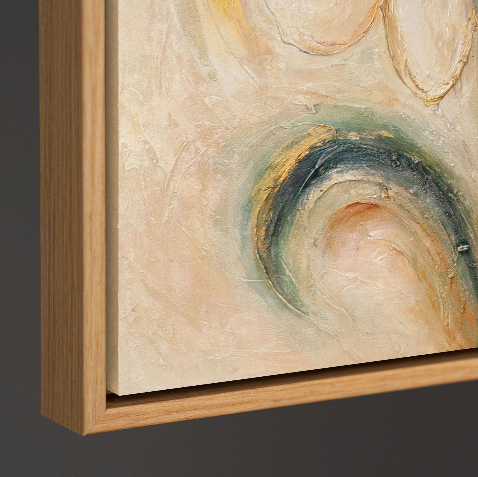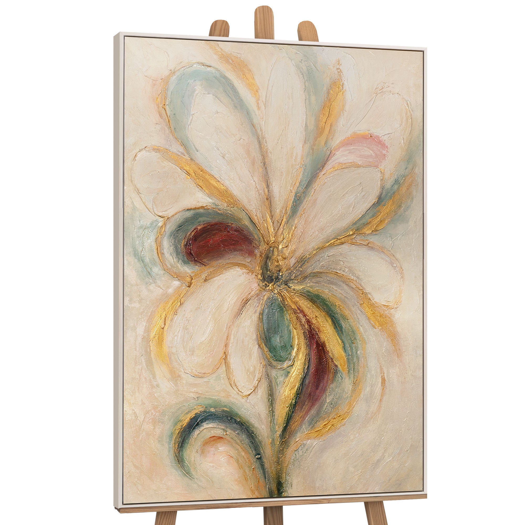 "Kukkiva energia" on käsinmaalattu akryylimaalaus kankaalle, joka luo voimakkaalla värien intensiteetillä ja kaarevilla linjoilla kukkivan dynamiikan. Hehkuvat kullan, vihreän ja punaisen korostukset yhdistyvät pehmeisiin kerman ja beigen sävyihin, jolloin syntyy harmoninen ja samalla elävä kokonaisuus. Plastinen rakenne antaa teokselle syvyyttä ja liikettä, joka muistuttaa tyyliteltyä kukkaa tuulessa.