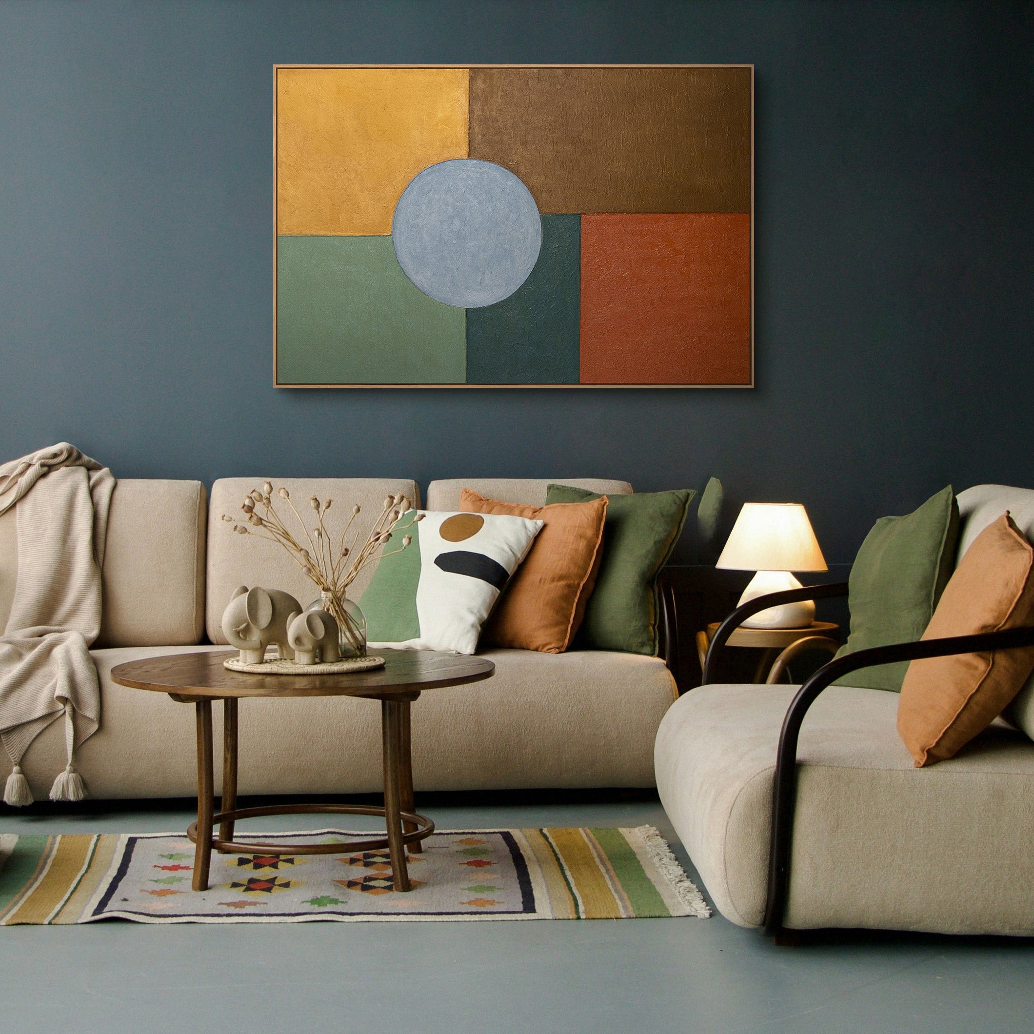 Käsinmaalattu kangasmaalaus on kehystetty ja sopii erinomaisesti moderneihin olohuoneisiin, ruokailutiloihin tai tyylikkäisiin toimistoihin. Rauhallinen värikoostumus luo järjestystä, vakautta ja lämpimän, ajattoman tunnelman tilaan.