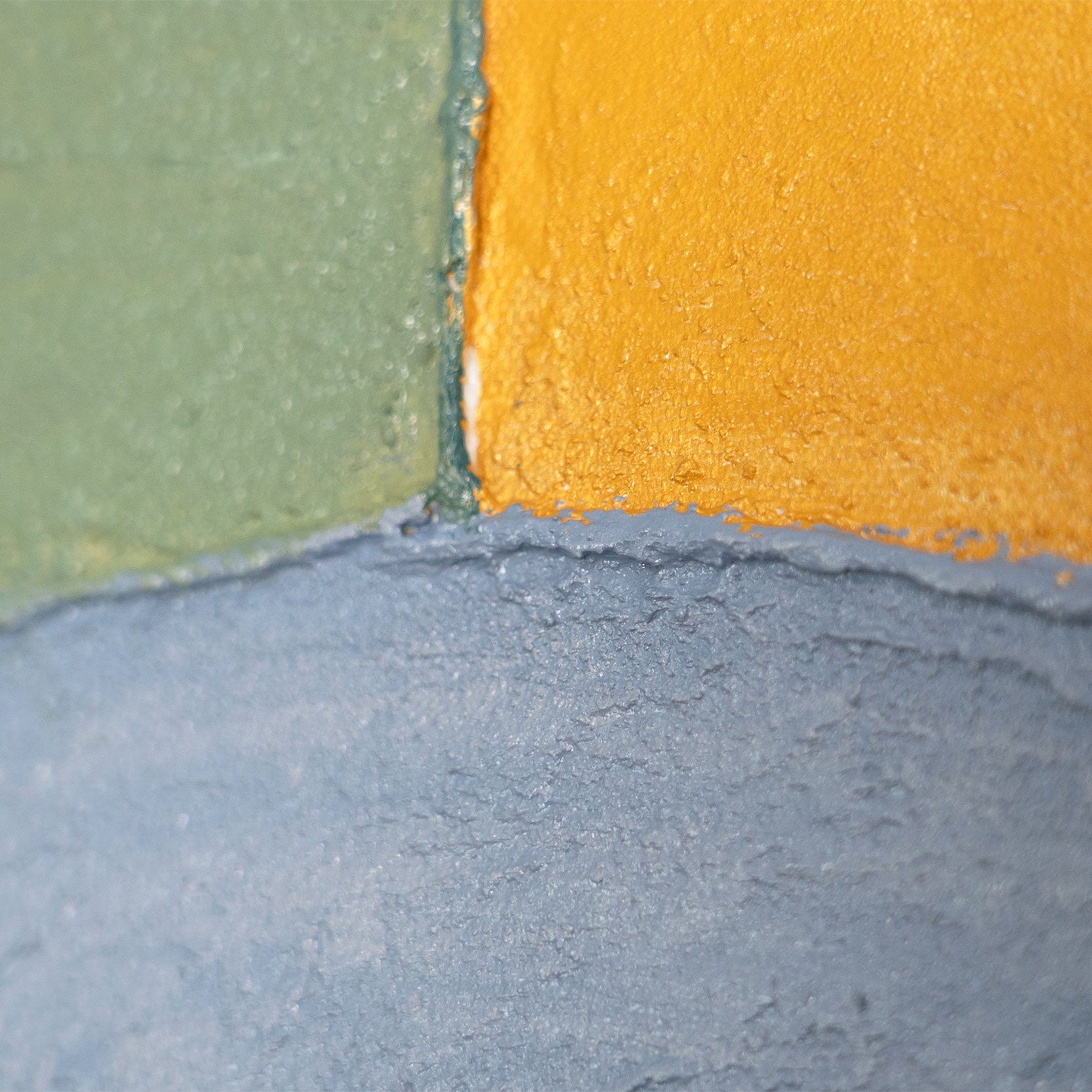 ”Lämmin geometria” on abstrakti akryylimaalaus, jossa on selkeä geometrinen jako ja harmoninen väriyhdistelmä. Rauhalliset okra-, vihreä-, harmaa- ja lämminoranssit pinnat yhdistyvät keskellä olevan ympyrän avulla ja luovat tasapainoisen, jäsennellyn kokonaisvaikutelman.