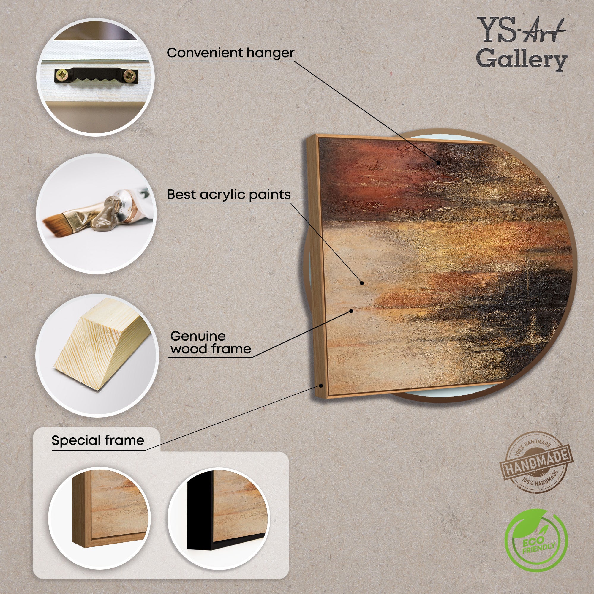 Käsinmaalattu kangasmaalaus esitetään kehyksessä ja sopii moderniksi seinäkoristeeksi olohuoneeseen, toimistoon tai edustustiloihin. Lämmin, tumma värimaailma korostaa korkealaatuisia sisustuksia ja luo vakautta ja rauhallisuutta huokuvaa tunnelmaa.