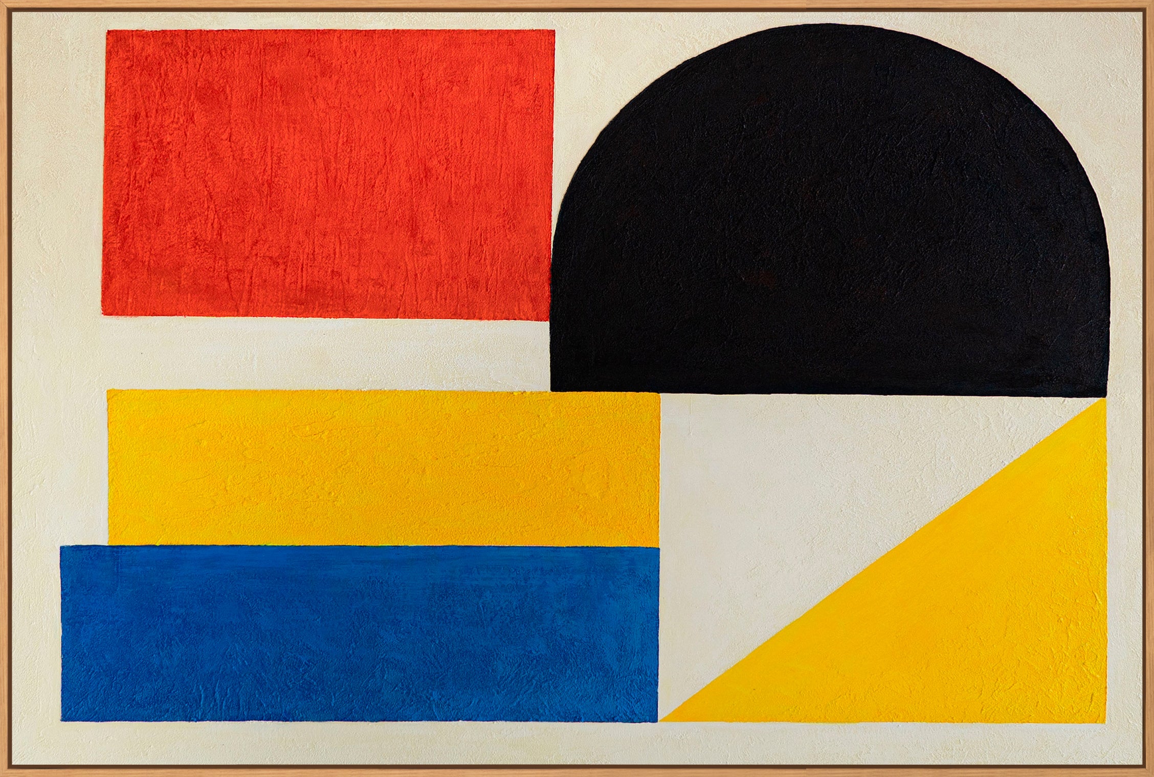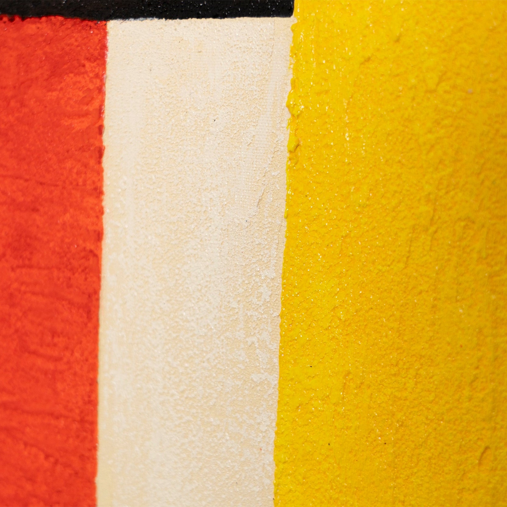 Tämä abstrakti maalaus kukoistaa selkeillä värikentillä ja vahvoilla kontrasteilla. Intensiiviset punaiset, keltaiset ja siniset kohtaavat syvän mustan ja rauhallisten vaaleiden alueiden. Geometrinen sommittelu näyttää tasapainoiselta mutta voimakkaalta, ja teksturoitu akryylipinta korostaa selvästi sen käsinmaalattua luonnetta.