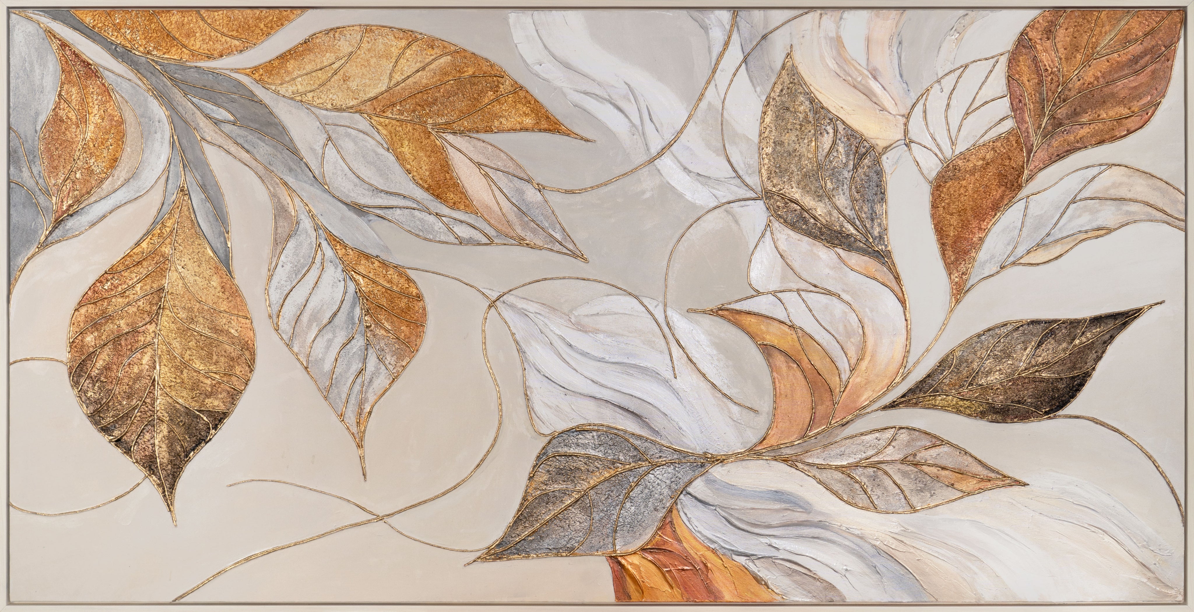 Tämä elegantti käsinmaalattu akryylimaalaus kankaalle tuo luonnon kauneuden seinällesi. Kultaiset ja pronssiset lehdet yhdistyvät rakenteelliselle kankaalle harmoniseksi taideteokseksi, joka säteilee lämpöä ja hienostuneisuutta.