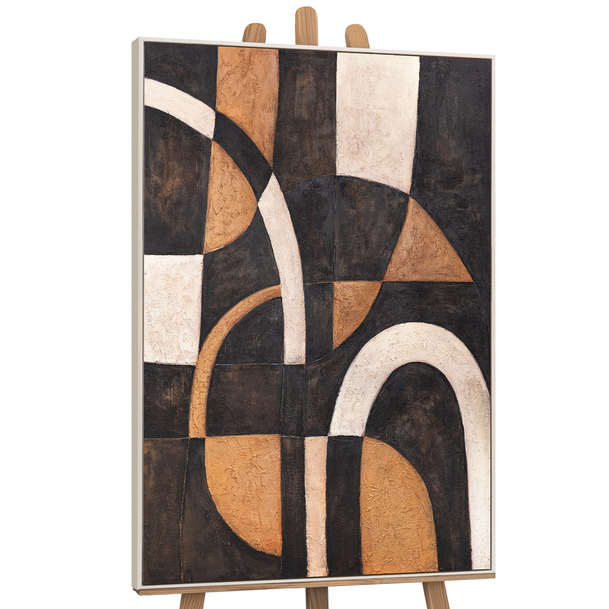 Tämä käsinmaalattu canvas taulu kiehtoo kaarevien linjojen ja geometrisen sommittelun leikillä. Lämpimän ruskean, hienostuneen beigen ja syvän mustan yhdistelmä luo harmonisen kontrastin. Rakenteellinen pinta antaa maalaukselle syvyyttä ja luonnetta, tehden siitä todellisen katseenvangitsijan.