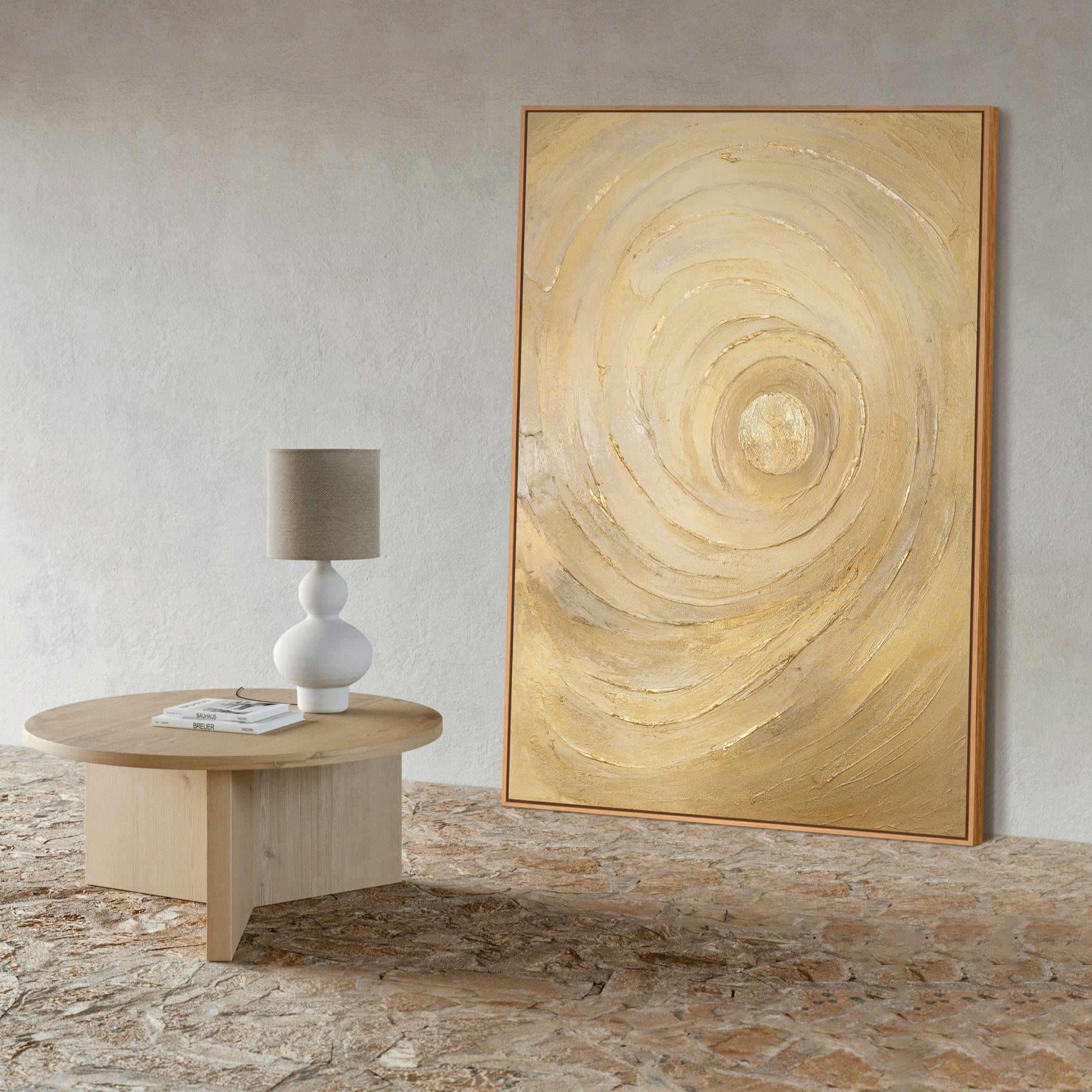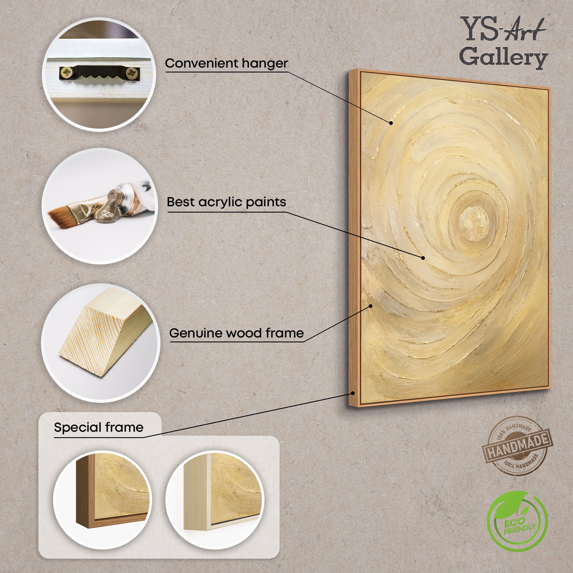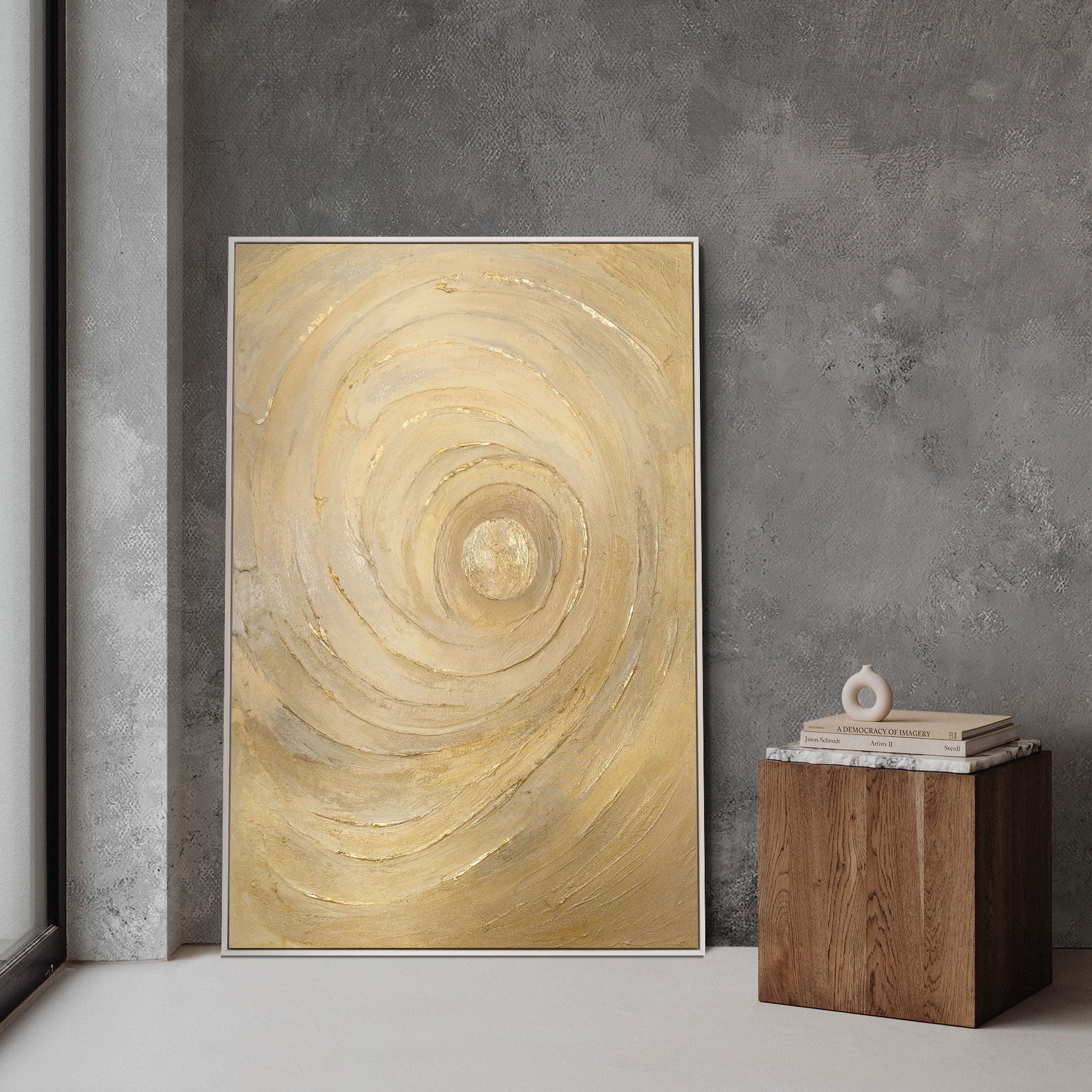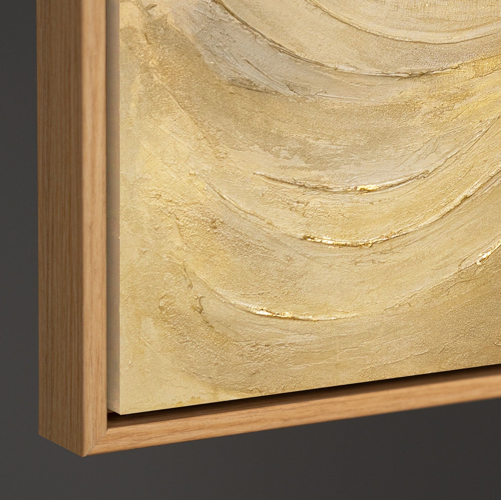 Tämä abstrakti maalaus on tyylikäs katseenvangitsija moderneihin asuin- ja työtiloihin. Elegantin kultaisen ilmeensä ansiosta se antaa jokaiselle sisustukselle ripauksen luksusta ja syvyyttä. Käsinmaalattu ja ainutlaatuinen, se yhdistää taiteellisen ilmaisun ajattomaan eleganssiin.