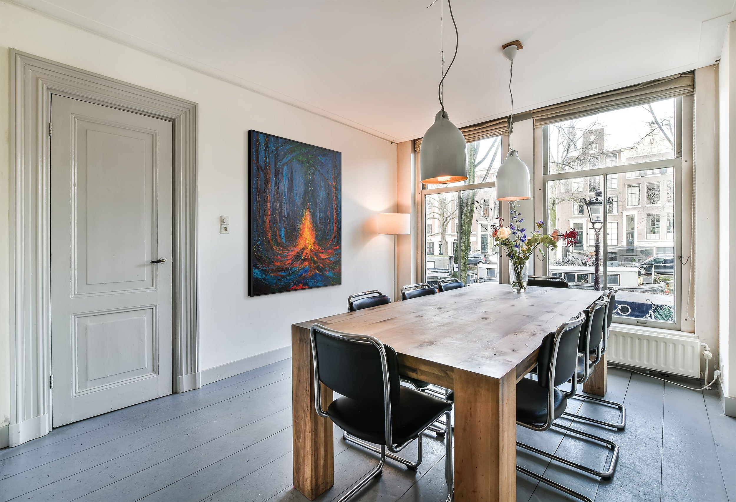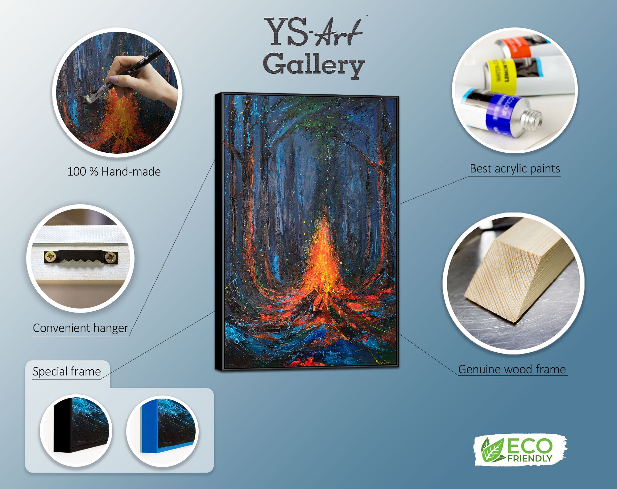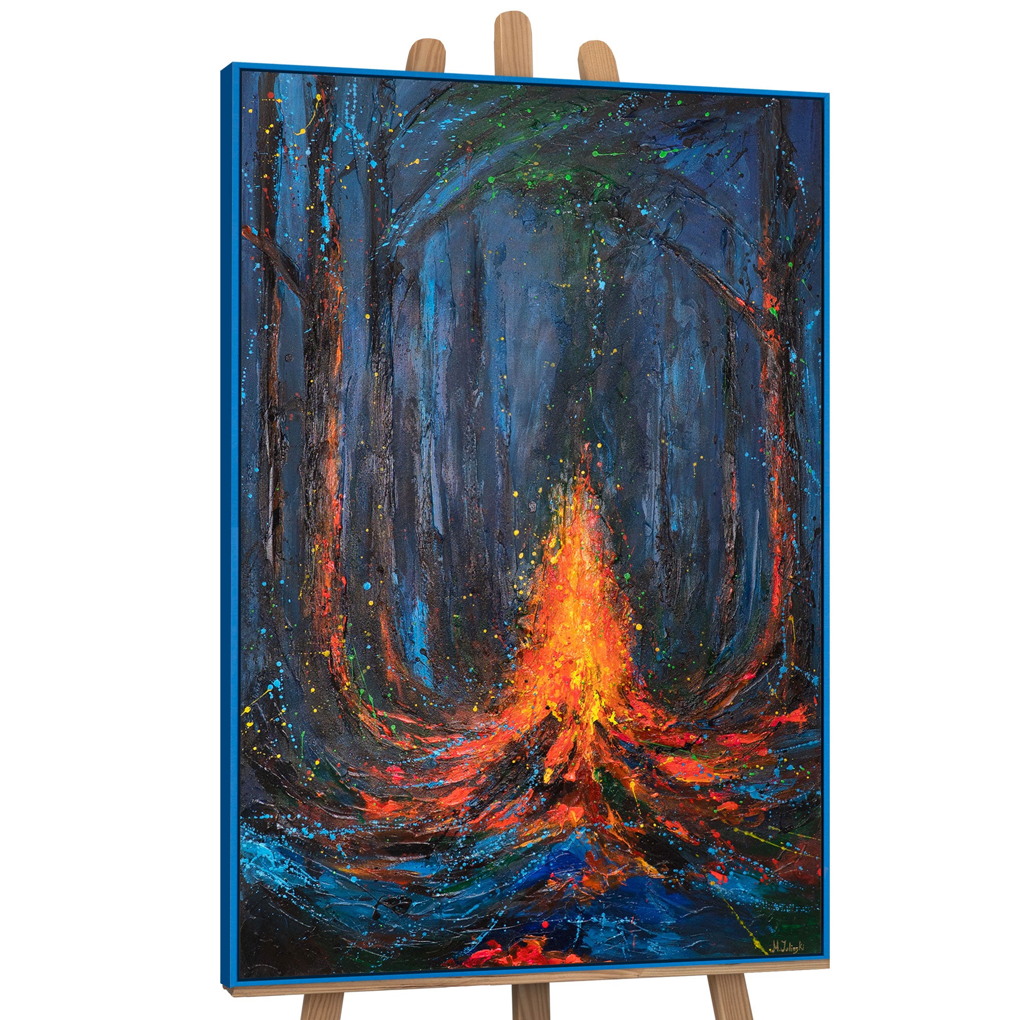 Syvän sinisen ja mustan sävyinen mystisesti valaistu metsä muodostaa taustan keskellä hehkuvalle, liekehtivälle tulelle. Hohtavat oranssit ja punaiset siveltimenvedot tanssivat kipinöiden tavoin pimeydessä ja luovat dramaattisen valon leikin. Fluoresoivat väripisteet antavat teokselle salaperäisen, lähes maagisen tunnelman – erityisen vaikuttavan hämärässä.