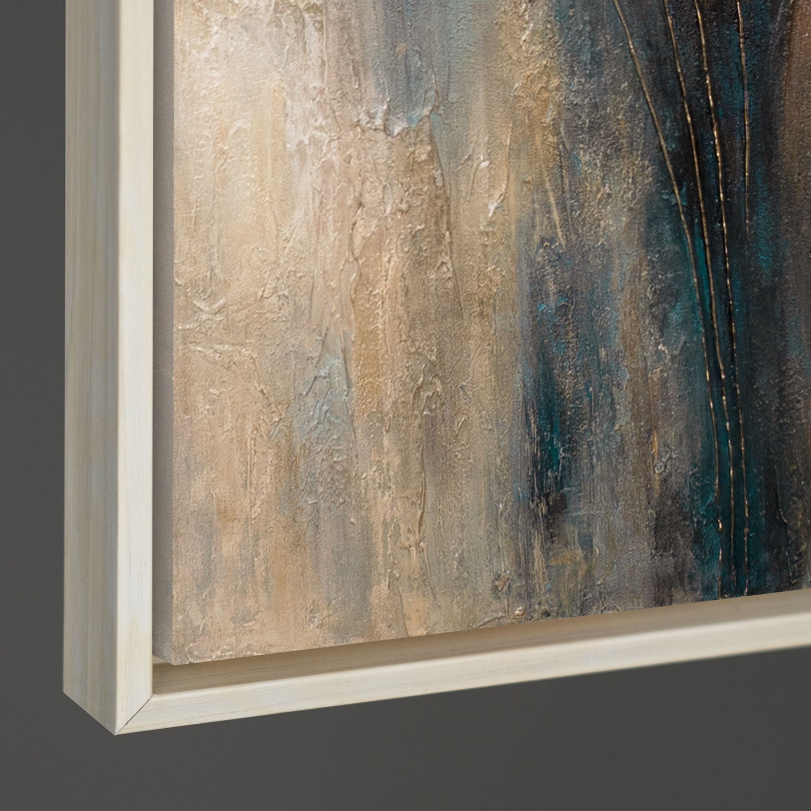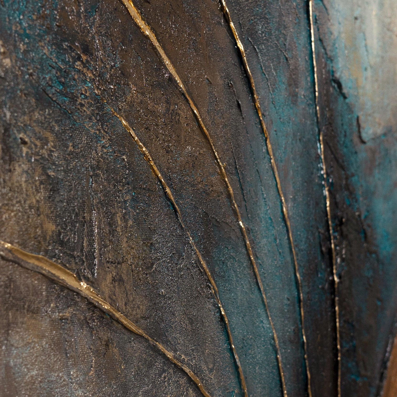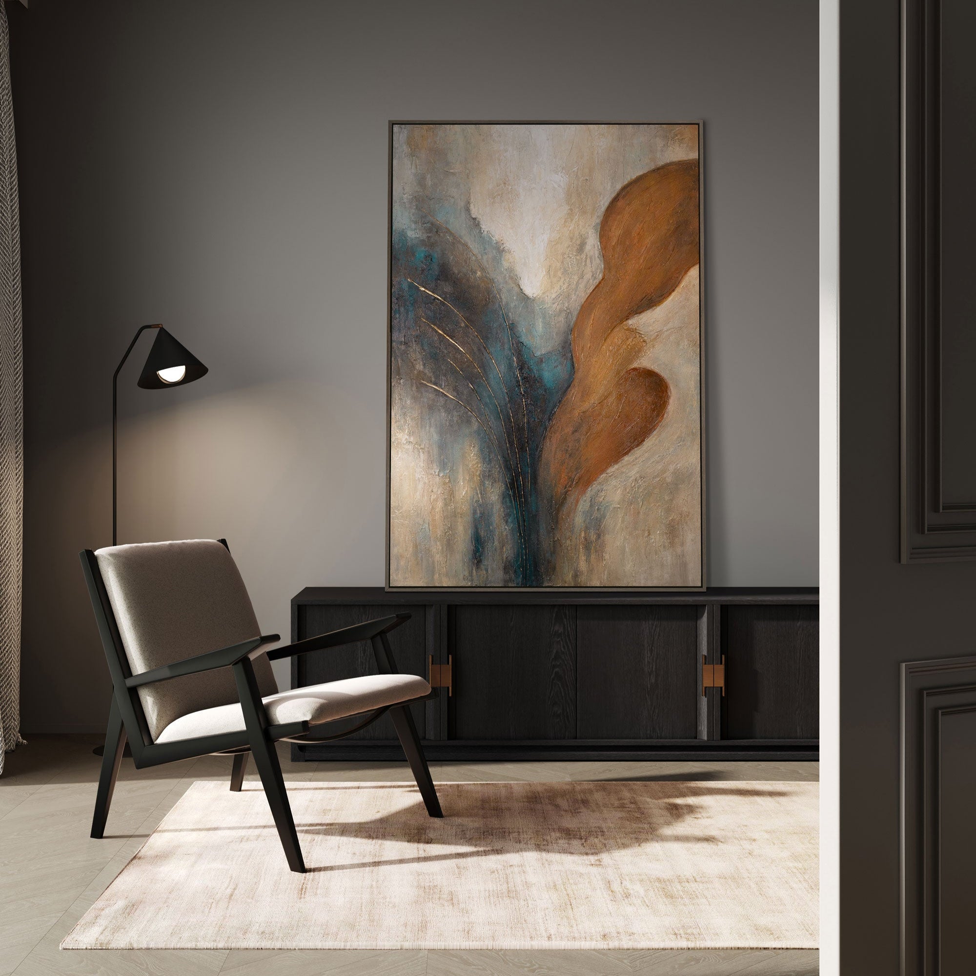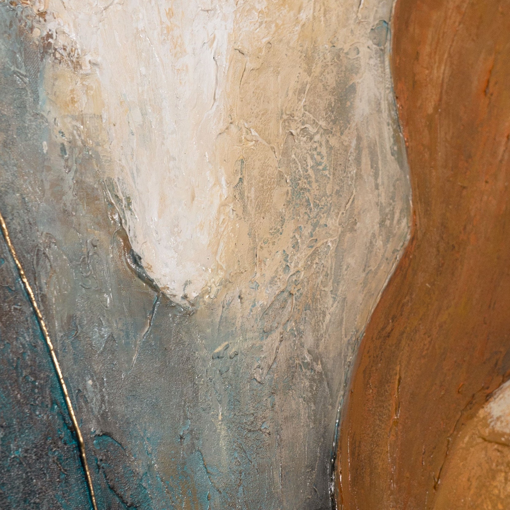 "Tuuli ja kulta" on kiehtova akryylityö, joka lumoaa virtaavilla muodoillaan ja kontrastisella väripaletillaan. Lämpimät ruskeat sävyt kohtaavat syvät siniset varjostukset, ja hienovaraiset kultakorostukset tuovat sommitelmaan liikettä ja eleganssia. Rakenteellinen pinta antaa teokselle syvyyttä ja elävyyttä, jolloin siitä tulee erityinen katseenvangitsija.