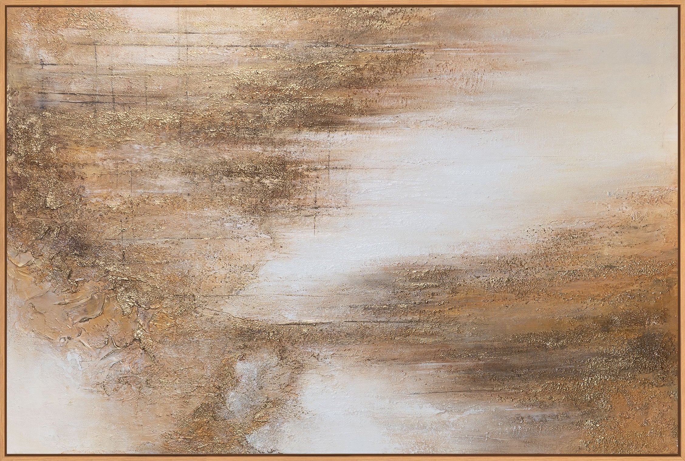 ”Honigdunst” on abstrakti akryylimaalaus lämpimissä beige-, kerma- ja kulta-sävyissä. Hienot vaakasuuntaiset kerrokset ja pehmeät siirtymät luovat rauhallisen, melkein leijuvan vaikutelman, joka muistuttaa valoa, lämpöä ja luonnollisia pintoja.