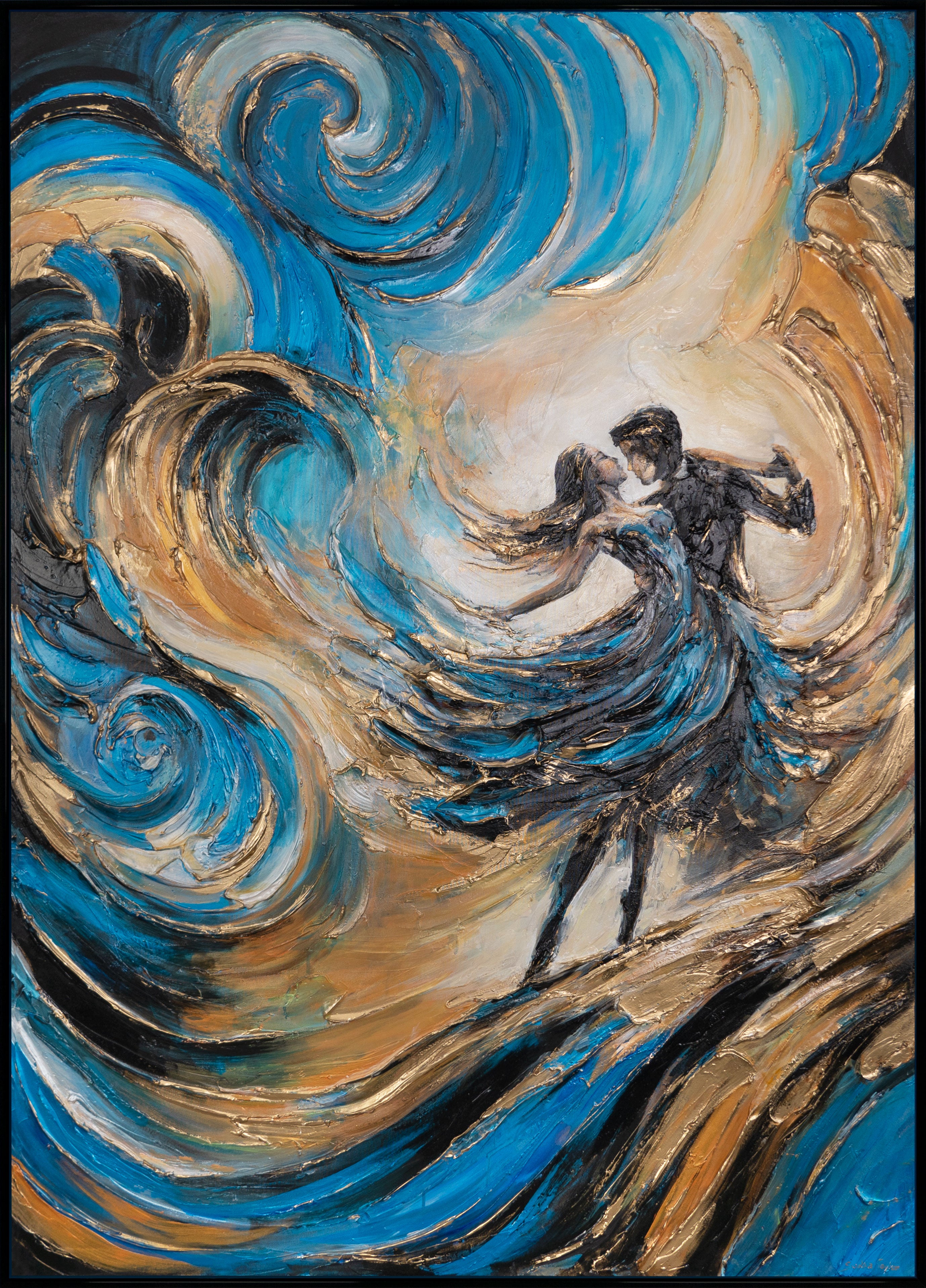 Tämä käsinmaalattu akryylimaalaus kankaalle esittää tanssivaa paria, jota ympäröivät dynaamiset kaaret sinisen, kullan ja beigen sävyissä. Tekstuuri ja kiiltävät aksentit antavat teokselle elävän, lähes maagisen vaikutelman.
