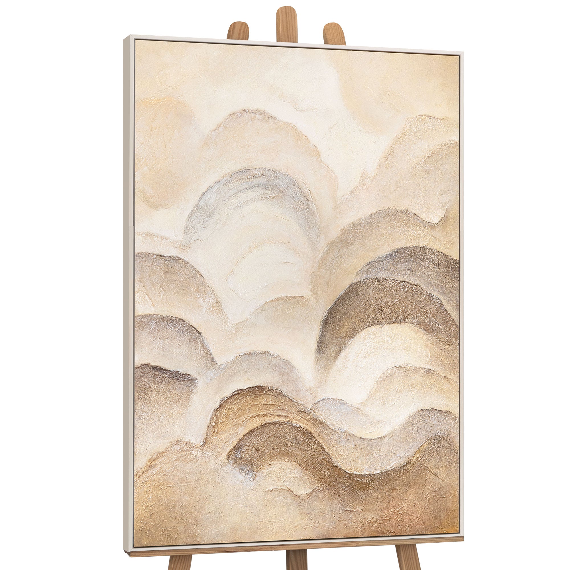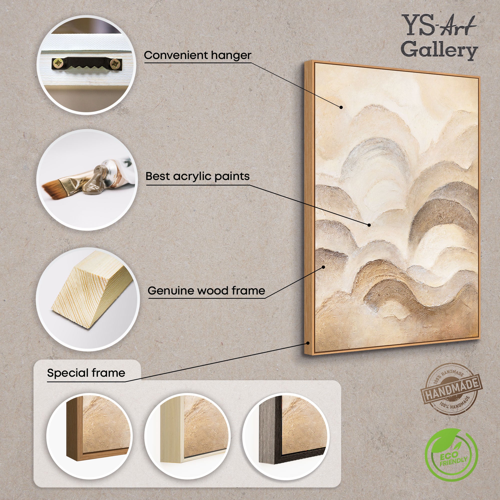 Tuo luonnollista rauhaa kotiisi tällä käsinmaalatulla abstraktilla canvas taulu -teoksella. Pehmeät kerrostumat beigessä, ruskeassa ja kerman sävyissä muistuttavat vuorten tai aaltojen ääriviivoja ja luovat lämpimän, harmonisen tunnelman.