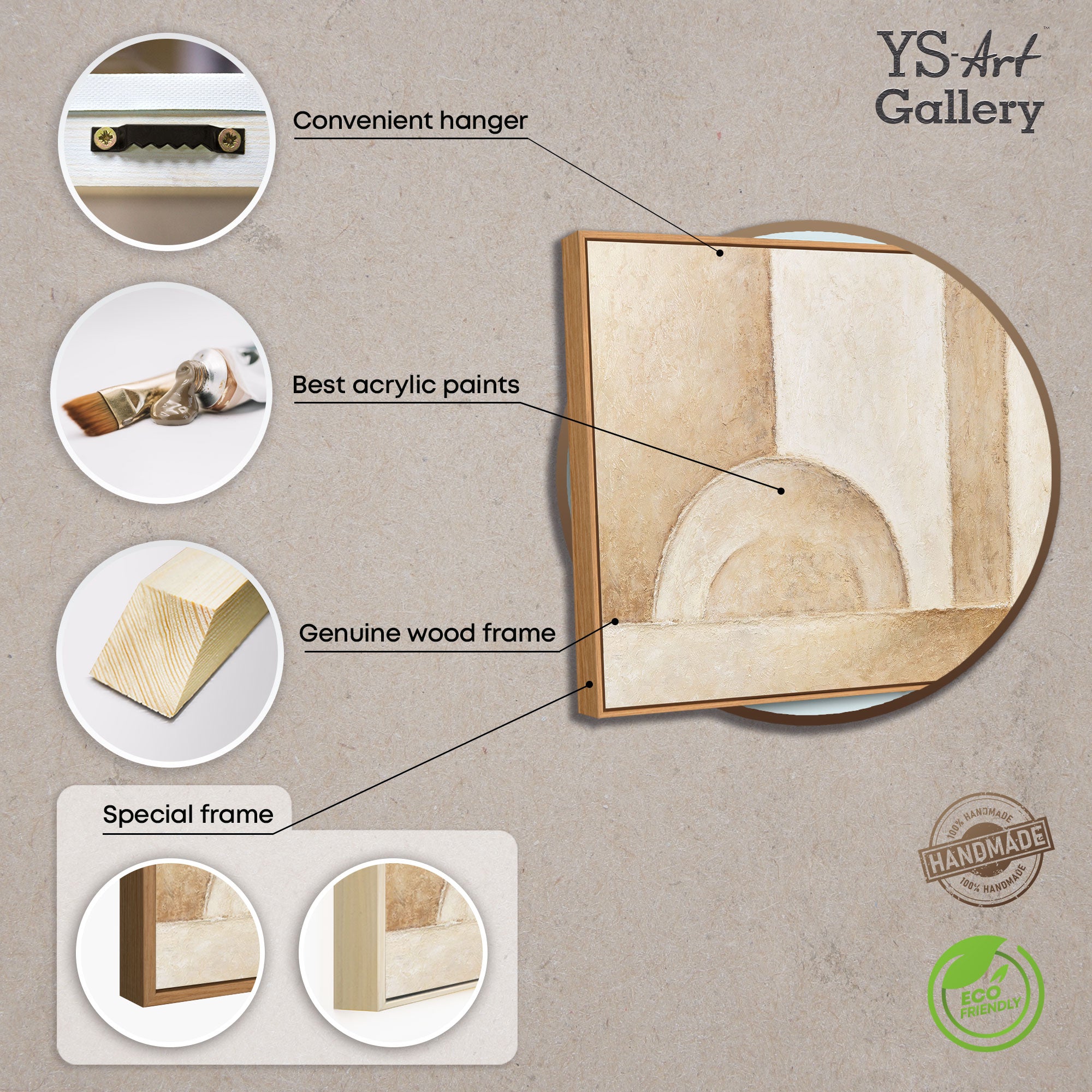 Tuo selkeää eleganssia ja arkkitehtonista harmoniaa kotiisi tällä käsinmaalatulla canvas taulu -teoksella. Geometriset muodot pehmeissä beigen ja hiekan sävyissä yhdistyvät moderniin, minimalistiseen sommitelmaan, joka huokuu rauhaa ja tasapainoa.