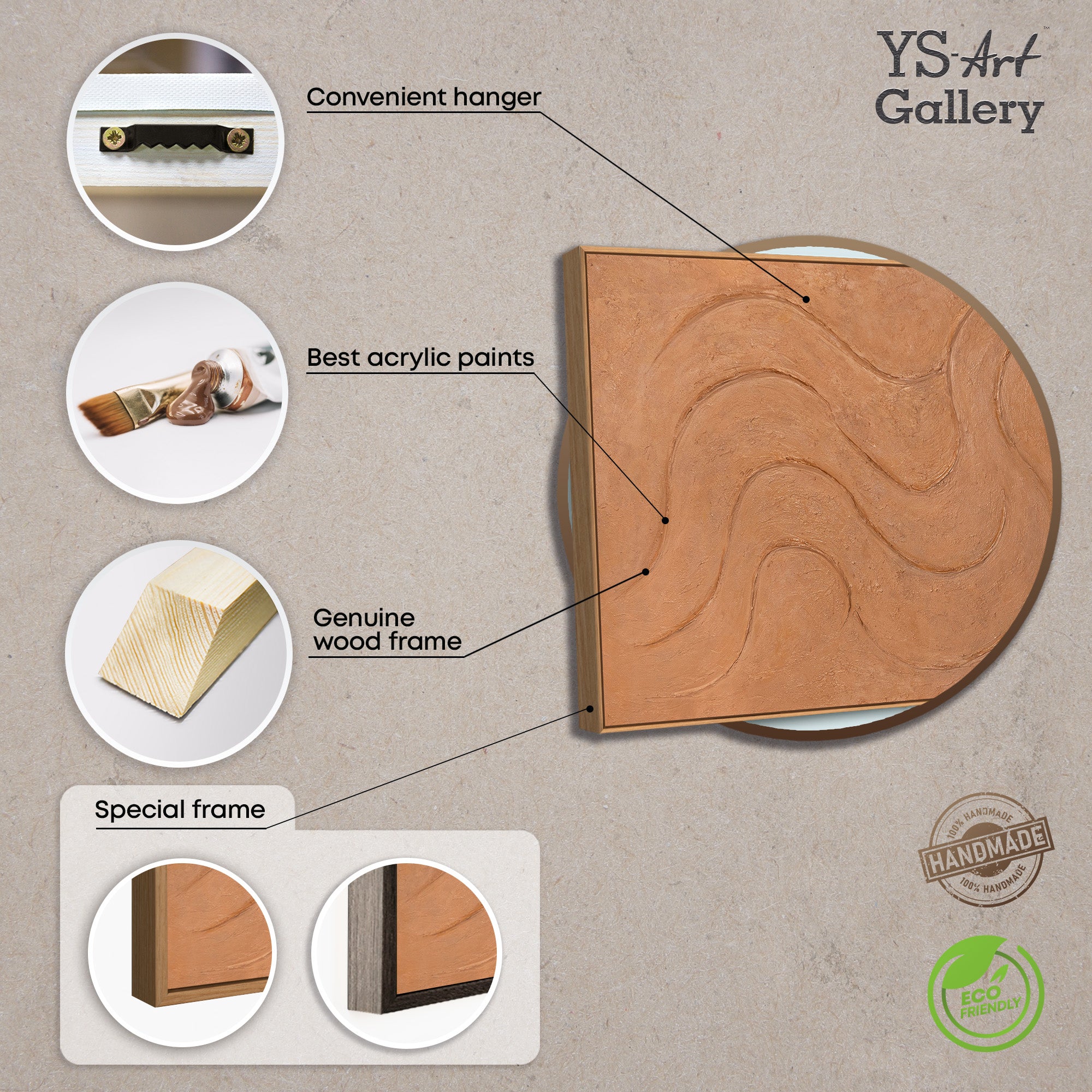Tälle abstraktille taideteokselle on ominaista lämpimät maanläheiset ja terrakotan sävyt sekä kevyesti teksturoitu pinta. Virtaavat viivat kulkevat rytmisesti kankaan läpi luoden seesteisen, orgaanisen liikkeen. Teksturoitu akryylimaali lisää syvyyttä ja saa pinnan tuntumaan elävältä hallitsematta sitä visuaalisesti.