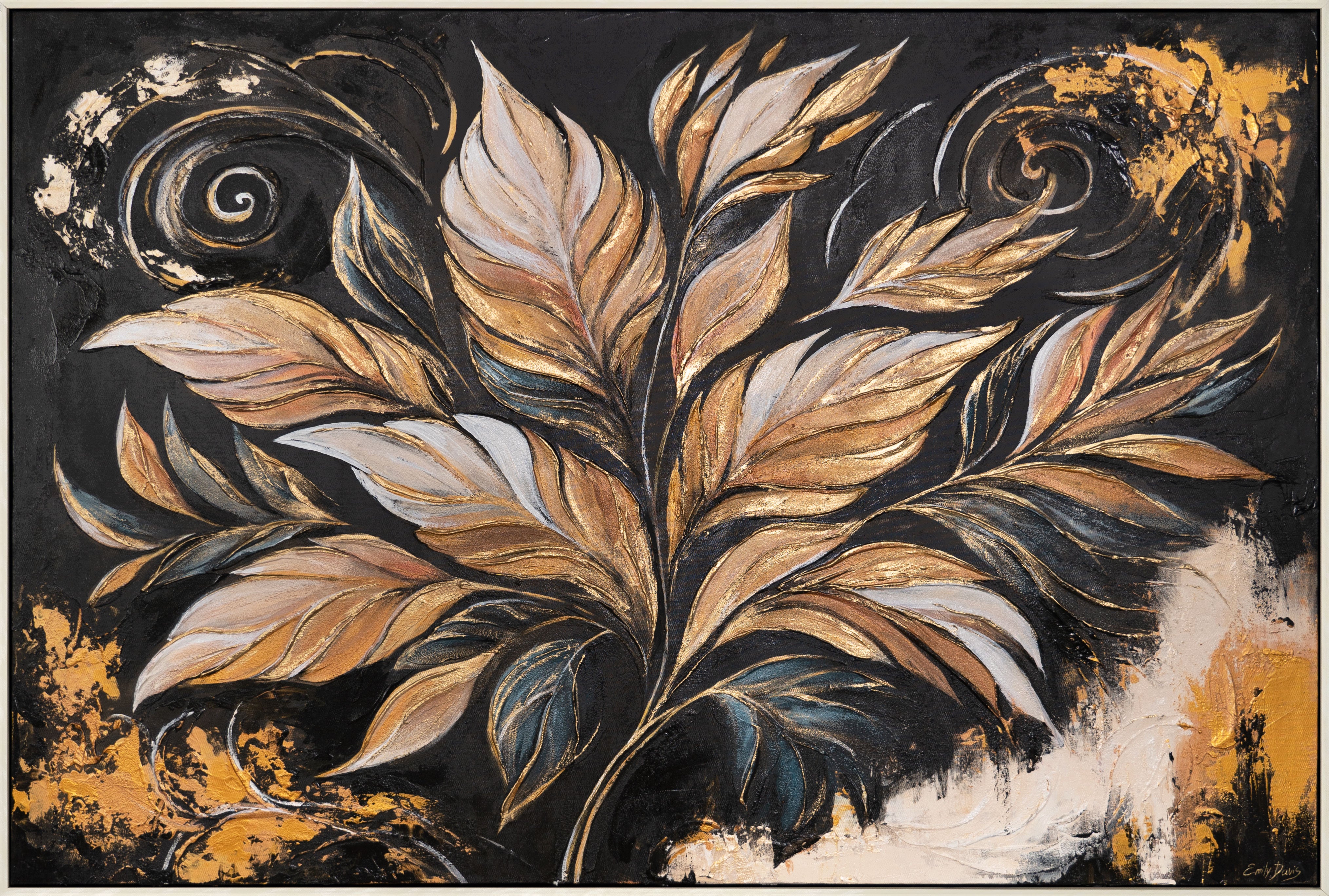 Käsinmaalattu maalaus taulut „Kultaiset Lehdet“ yhdistää elegantit lehtikuviot voimakkaisiin kultakorostuksiin syvänmustalla taustalla. Dynaamiset muodot ja kiiltävät tekstuurit antavat abstrakti taide -teokselle ylellisen ilmeen.