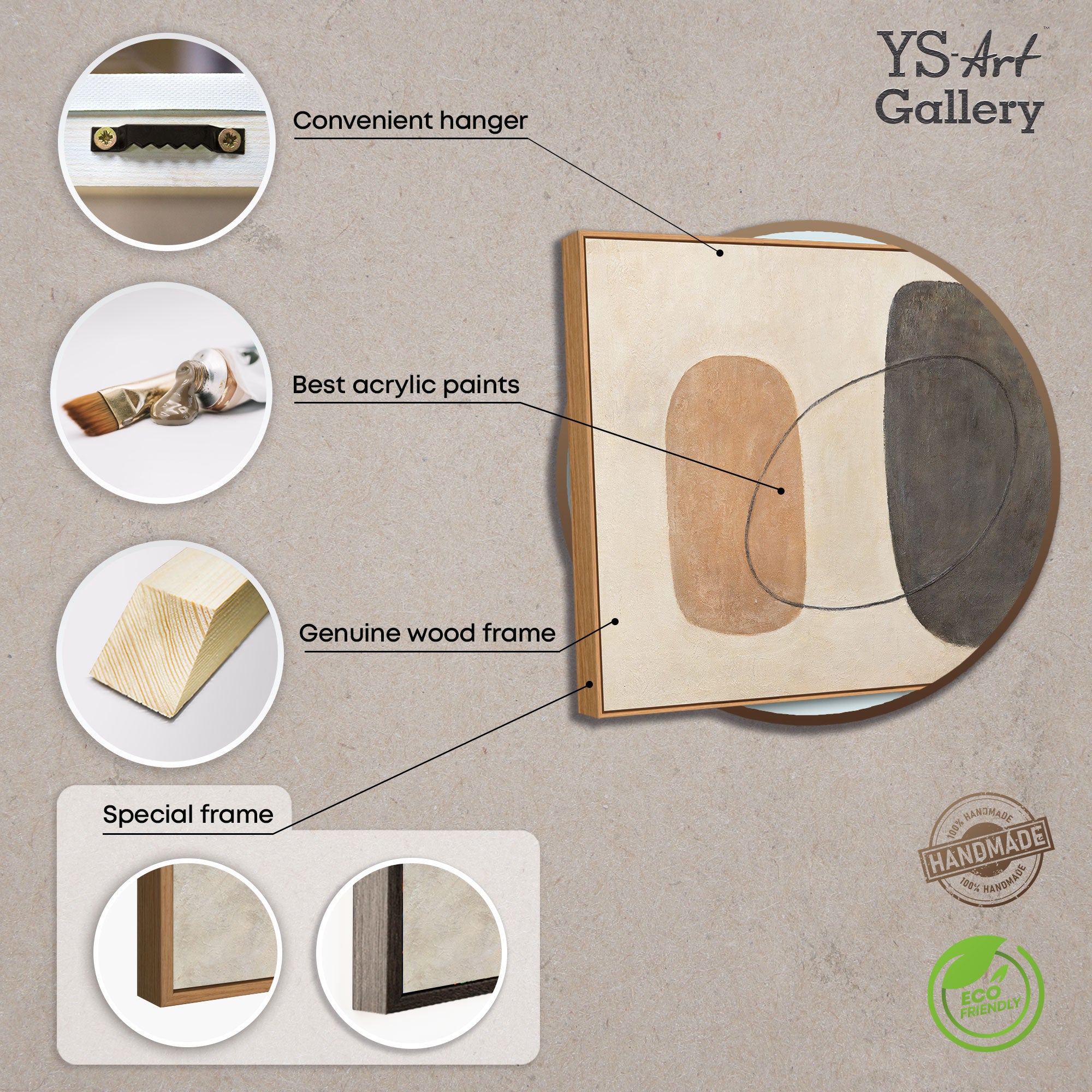 Tuo rauhaa ja tasapainoa kotiisi tällä käsinmaalatulla canvas taulu -teoksella. Harmoninen yhdistelmä pehmeitä beigen ja ruskean sävyjä, joita korostaa syvä harmaa, antaa teokselle minimalistista eleganssia. Päällekkäiset muodot symboloivat kontrasteja ja samalla yhtenäisyyttä, mikä tuo maalaukseen erityistä syvyyttä.
