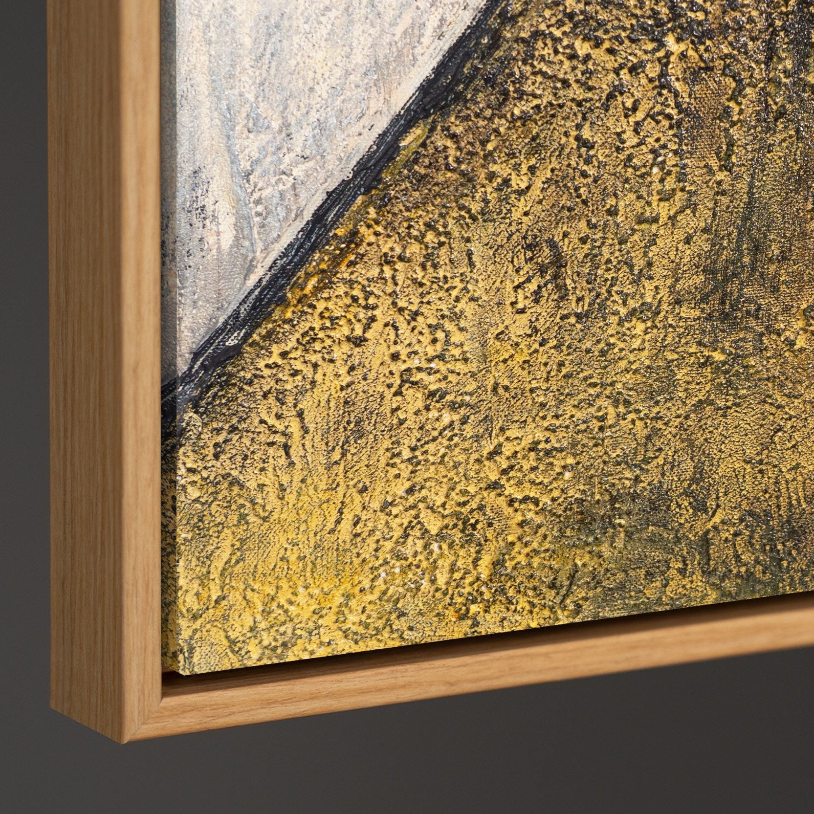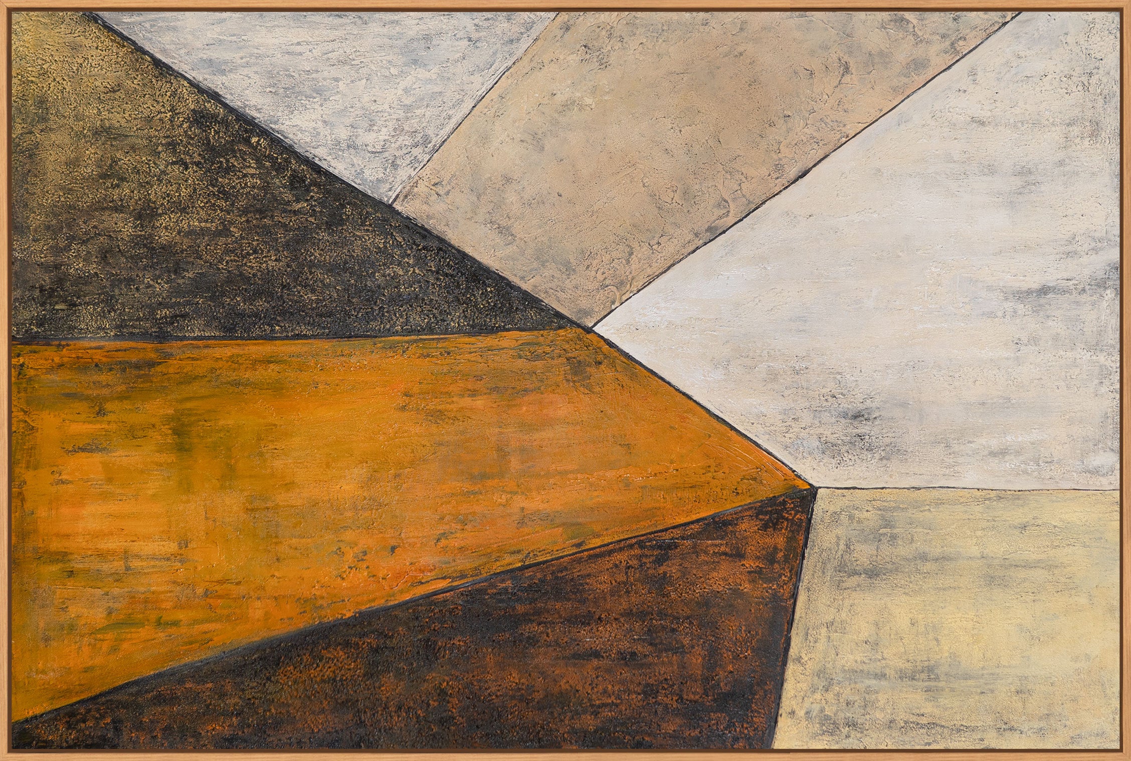"Pintojen kohtaaminen" on käsinmaalattu abstrakti akryylimaalaus, jossa on selkeästi rajatut alueet ja dynaaminen geometrinen sommittelu. Lämpimät okran ja beigen sävyt kohtaavat tummat aksentit ja vaaleat tekstuurit luoden tasapainoisen visuaalisen vaikutelman.