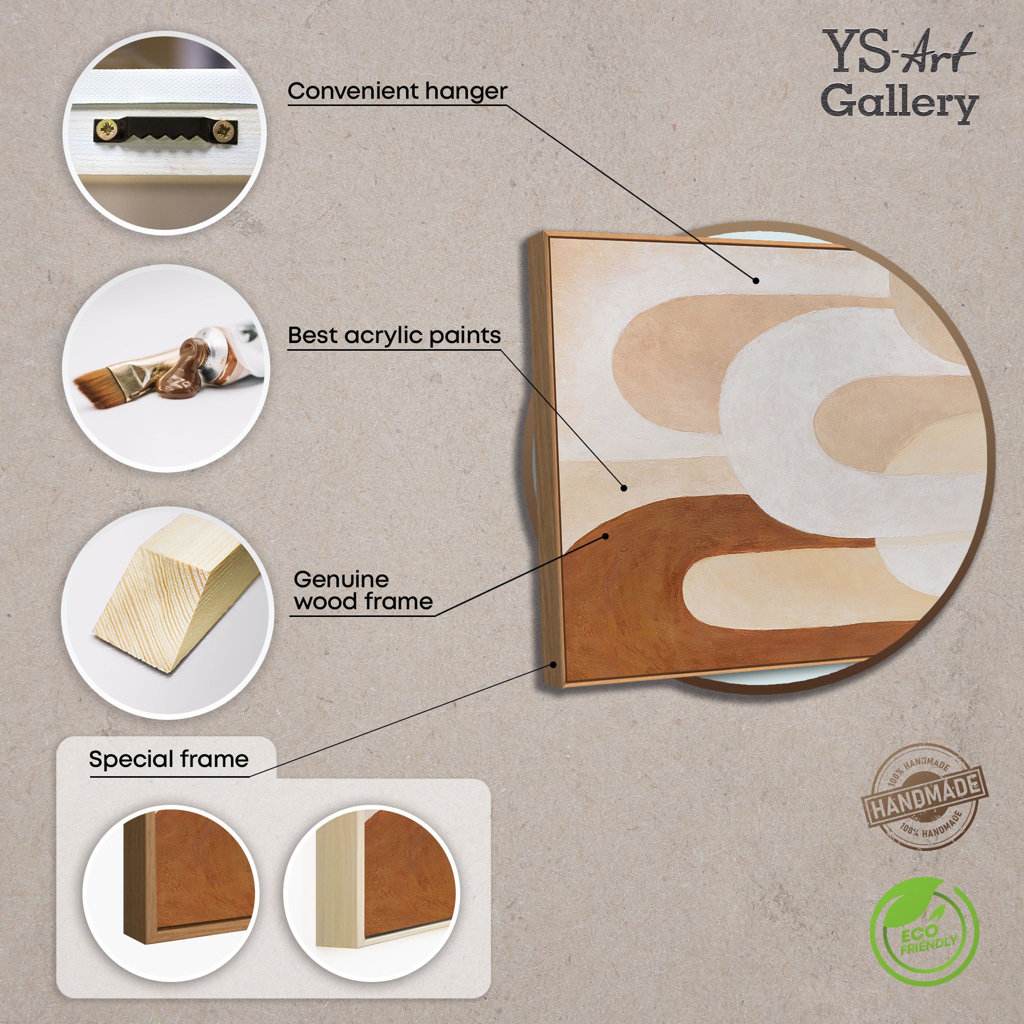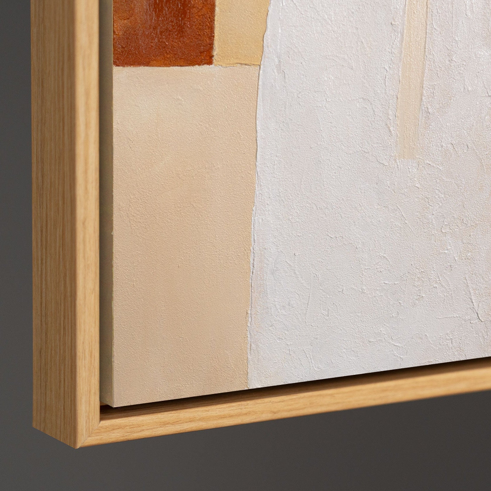 Tämä käsinmaalattu kangas esitetään kehystettynä ja sopii moderniksi seinätaiteeksi monenlaisiin sisustuskonsepteihin. Neutraalin väripalettinsa ja ajattoman tyylinsä ansiosta taideteos integroituu harmonisesti erilaisiin sisustuksiin.