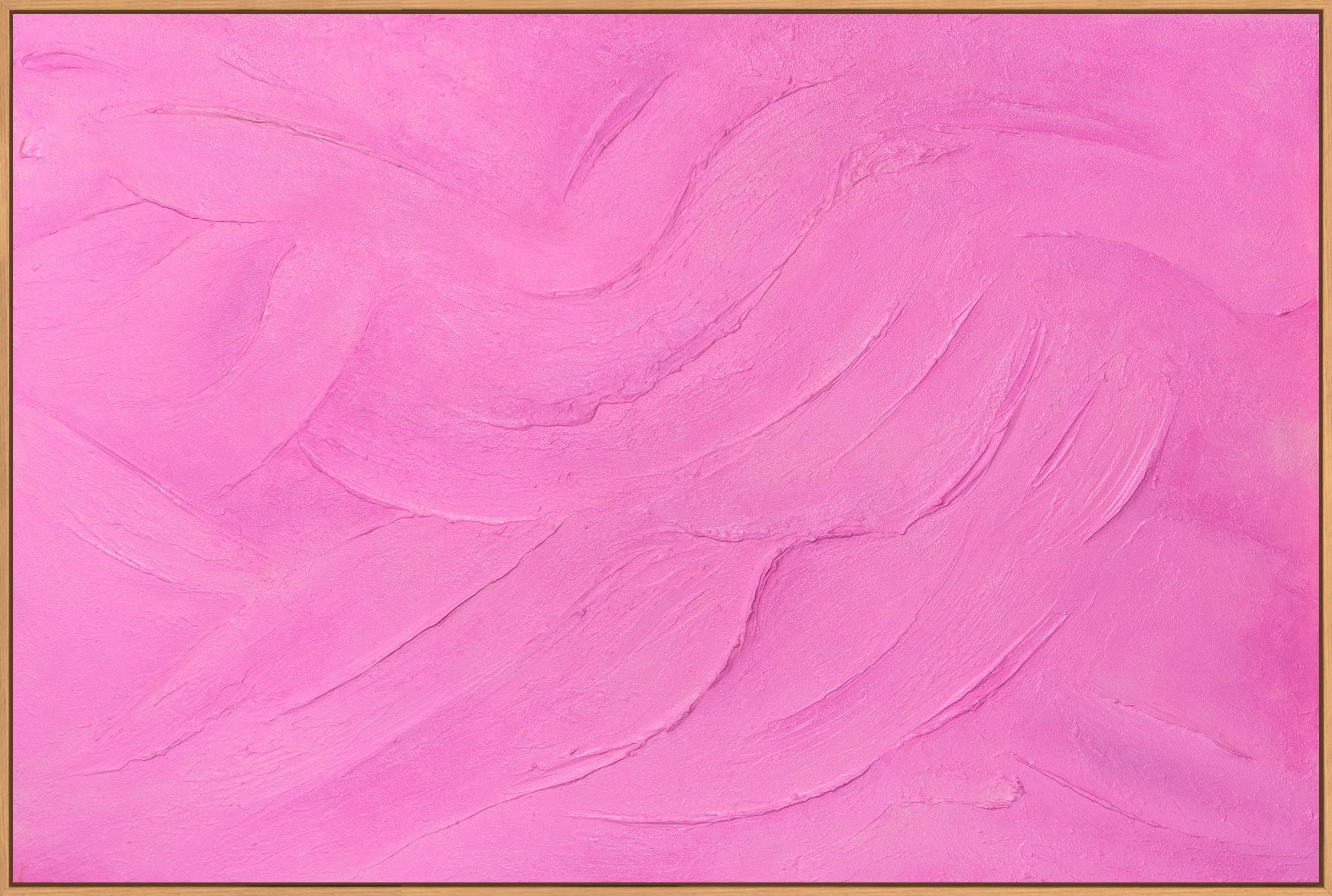 Abstraktissa taideteoksessa "Sugar Veil" on hienosti teksturoitu pinta eloisissa vaaleanpunaisen ja ruusun sävyissä. Akryylimaali näyttää pehmeältä ja virtaavalta, kun taas käsinmaalatut palettiveitsen jäljet luovat hienovaraisen syvyyden ja eloisan tekstuurin. Värialueet näyttävät liikkuvan lempeästi luoden seesteisen, modernin visuaalisen vaikutelman.
