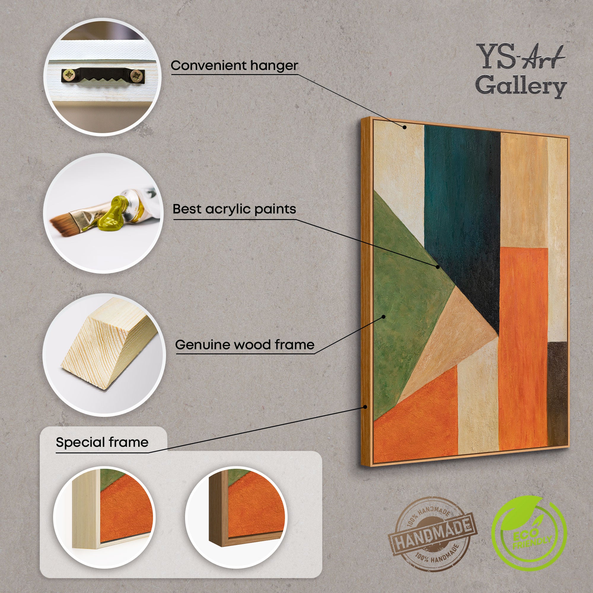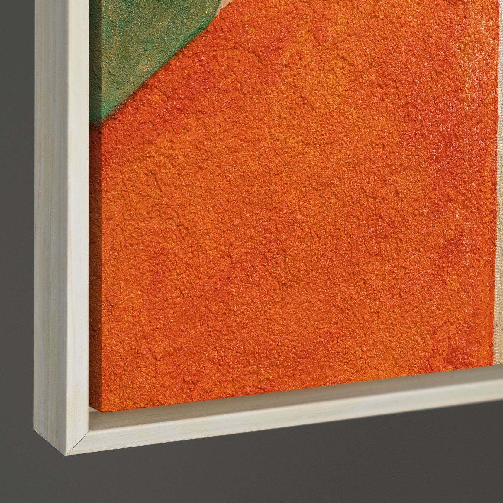„Ordnung und Bewegung“ vereint klare Linien mit lebendigen Farbakzenten. Geometrische Flächen in Orange, Grün, Schwarz und Beige bilden ein spannungsreiches Zusammenspiel aus Stabilität und Dynamik. Die Struktur des Acryls verleiht der Komposition Tiefe und taktile Ausdruckskraft.