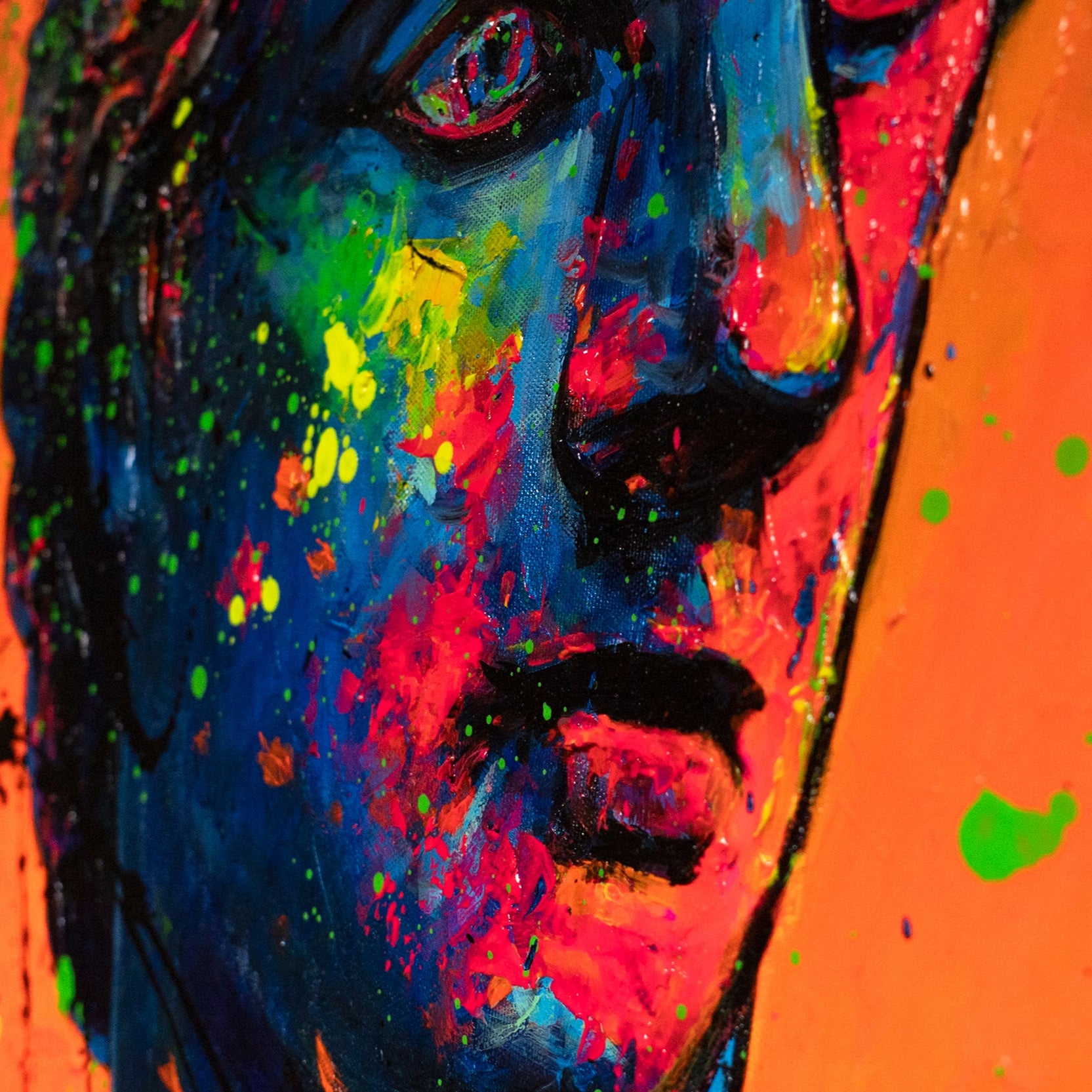 „Griechischer Vibe“ vereint klassische Skulptur mit moderner Street-Art. Auf leuchtendem Orange erscheint die antike Büste in intensiven Blau- und Rottönen, durchzogen von bunten Farbspritzern. Der plakative Schriftzug in grellem Grün verstärkt die rebellische Energie des Werkes. Jeder Pinselstrich ist handgemalt, jede Farbspur einzigartig.