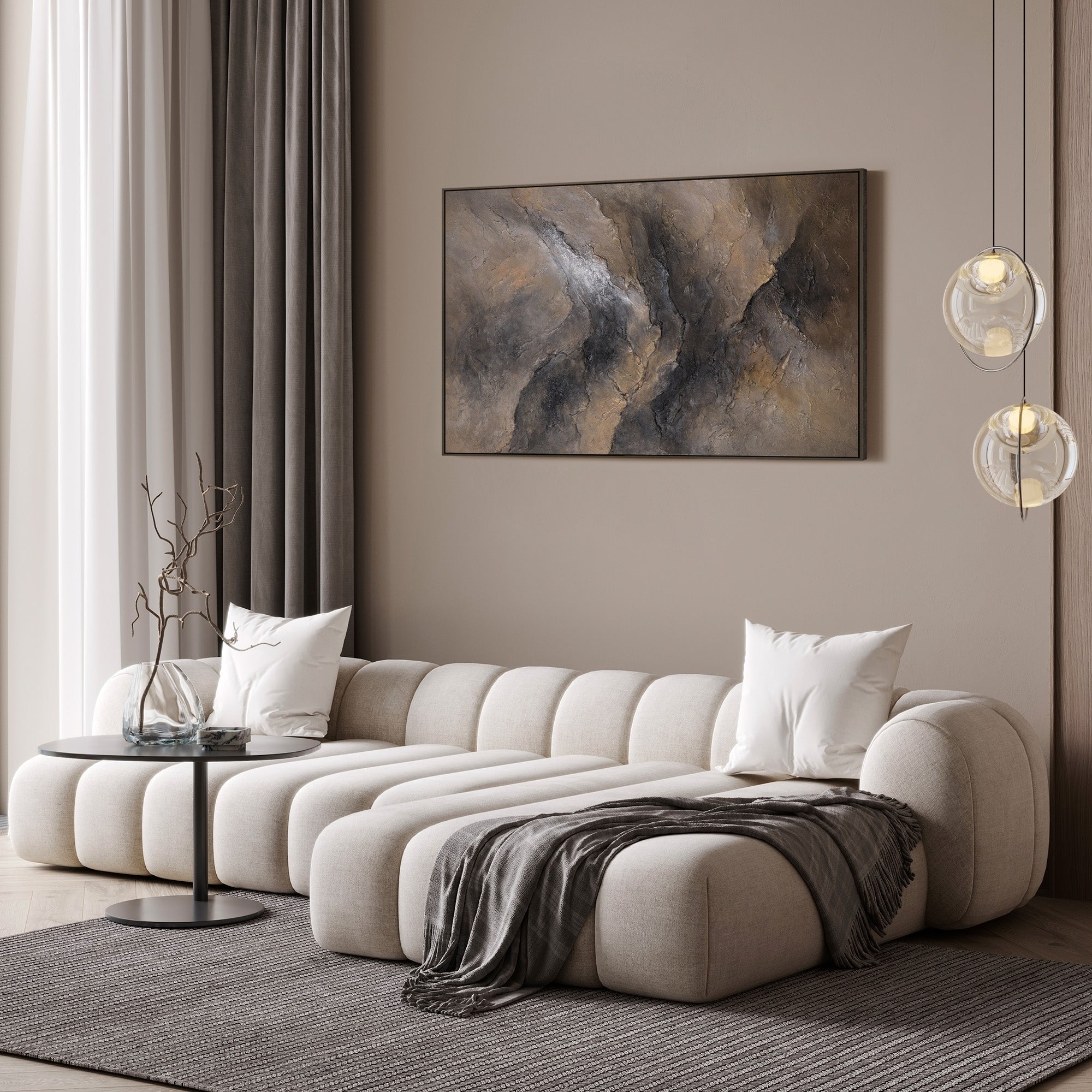„Dunkelheit und Morgendämmerung“ ist ein ausdrucksstarkes abstraktes Acrylgemälde, geprägt von tiefen Grau-, Braun- und warmen Erdtönen. Die vielschichtige, reliefartige Struktur erinnert an natürliche Gesteinsformationen und Übergänge zwischen Schatten und Licht. Feine Kontraste und raue Oberflächen verleihen dem Werk eine kraftvolle, erdige Präsenz und unterstreichen den handgemalten Charakter.