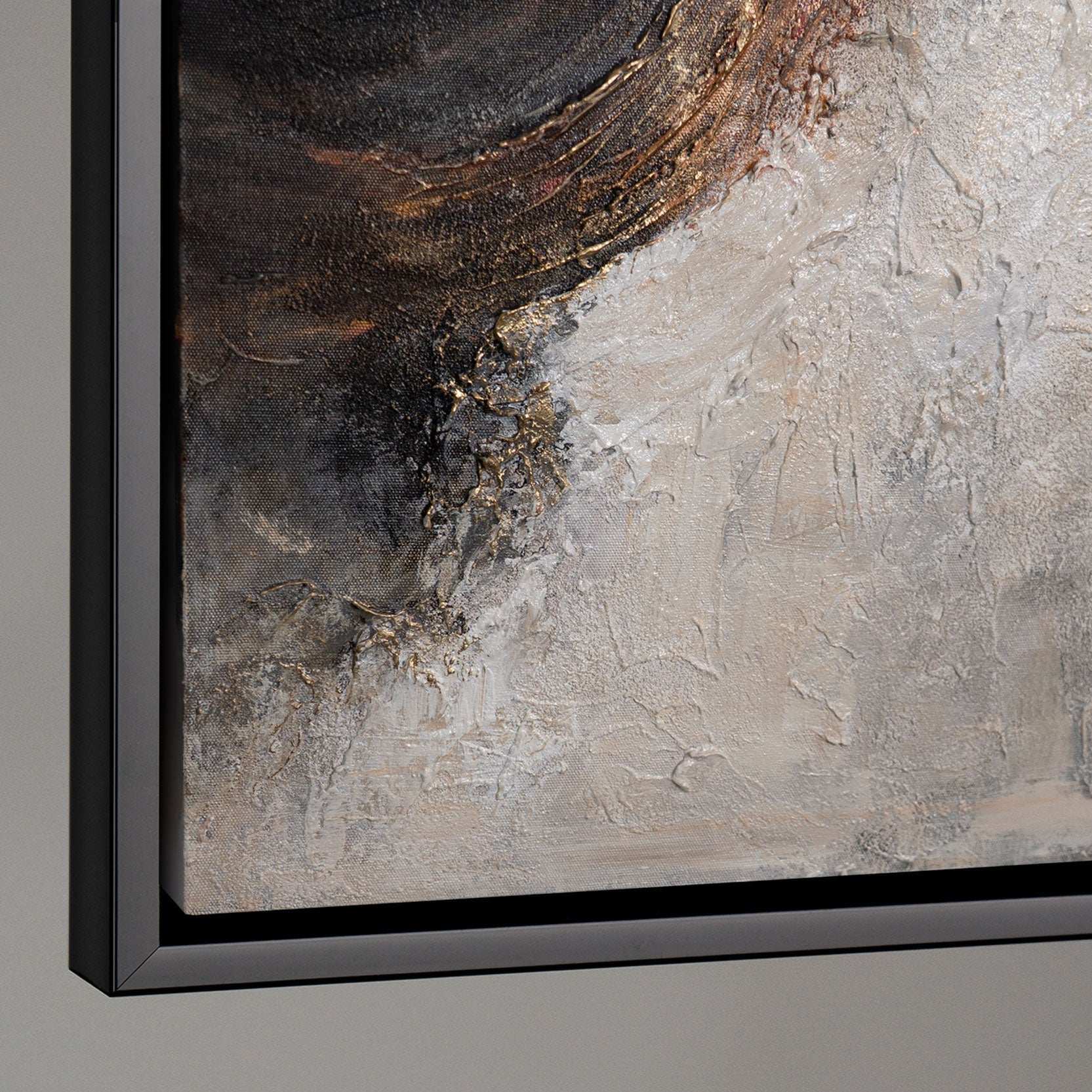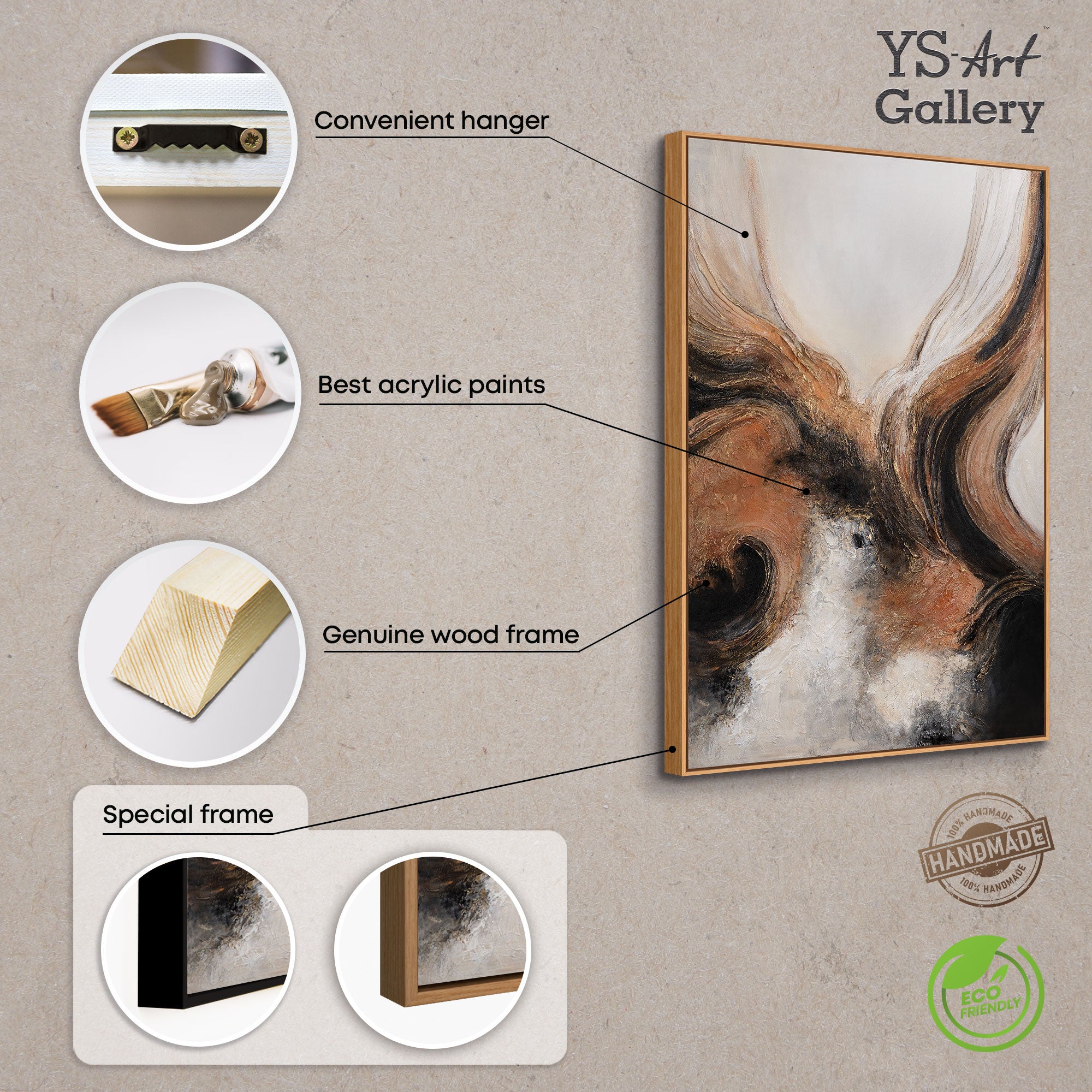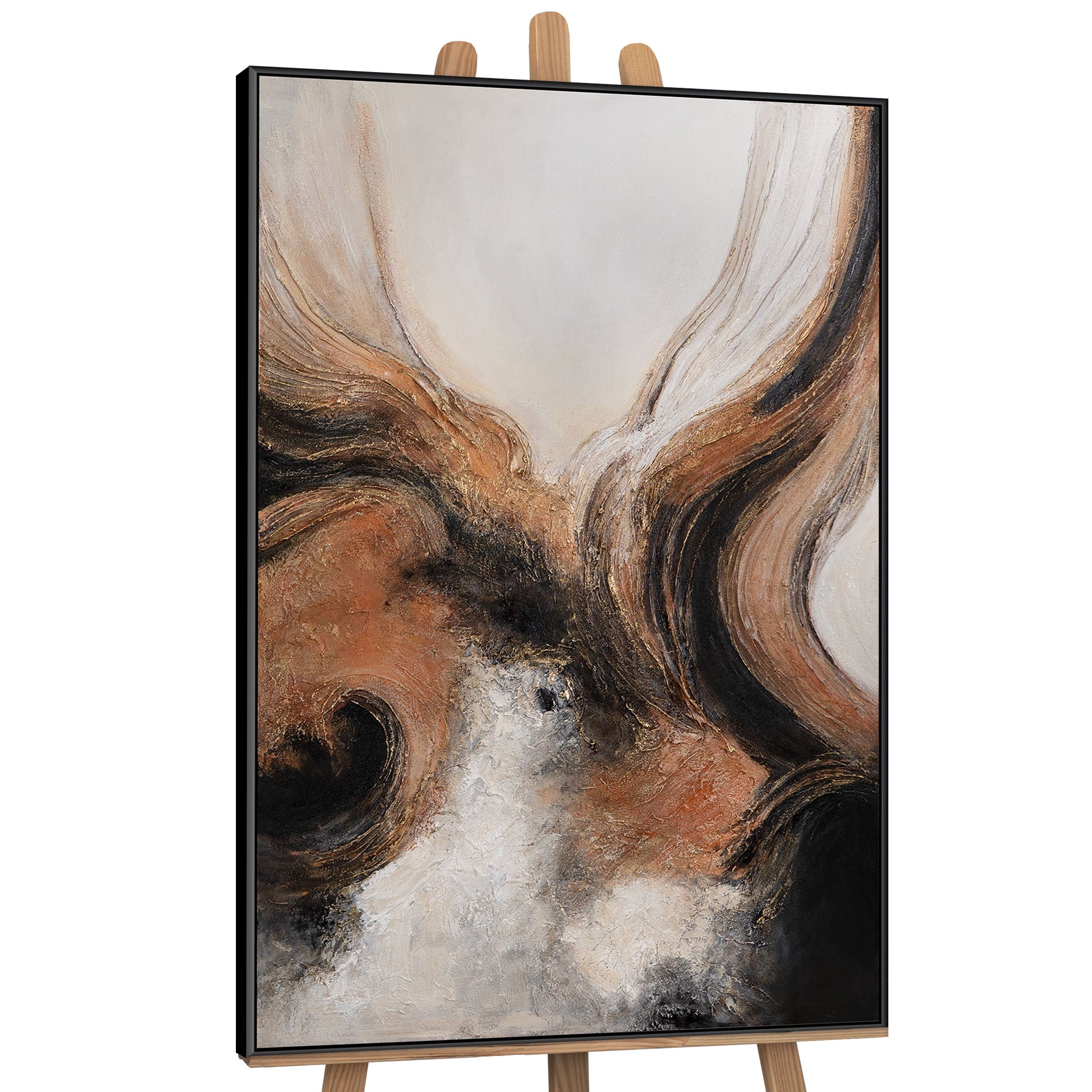„Elementti liikkeessä“ on käsinmaalattu akryylimaalaus, joka kiehtoo dynaamisella muotokielellään ja voimakkailla värivivahteillaan. Tummat mustat aksentit sulautuvat lämpimiin ruskean ja beigen sävyihin, kun taas rakenteellinen pinta luo syvyyttä ja elävyyttä. Reliefimäinen toteutus tuo liikkeen tuntua ja tekee teoksesta modernin seinätaiteen katseenvangitsijan.