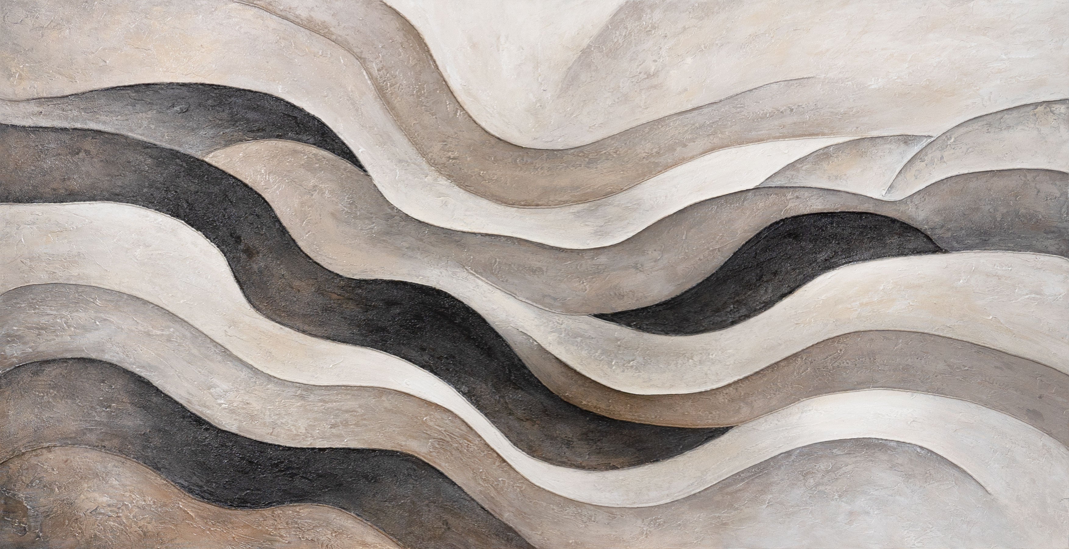 "Hiekkalainetta" on käsinmaalattu akryylimaalaus kankaalle, joka tekee vaikutuksen orgaanisilla muodoillaan ja hienolla reliefirakenteellaan. Pehmeissä sävyissä beigeä, kermaa, harmaata ja mustaa syntyy kaarevia linjoja, jotka muistuttavat luonnollisia dyynimaisemia. Jokainen siveltimen veto tuo syvyyttä ja liikettä sommitelmaan, jolloin syntyy harmoninen leikki valosta ja varjosta.