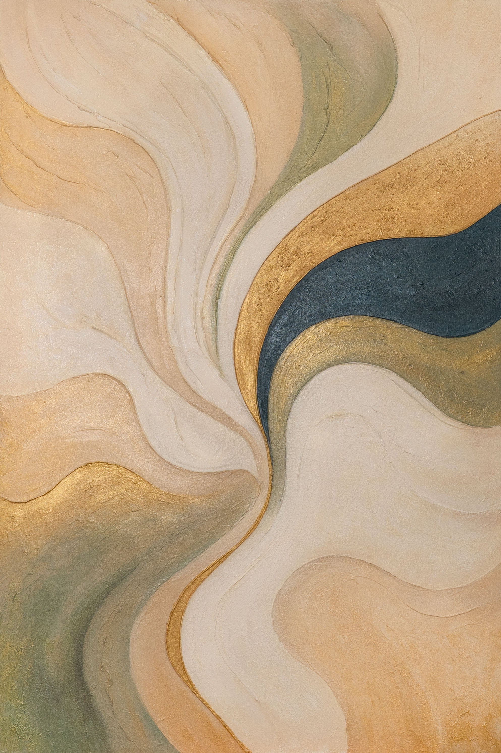 "Tuuletuksen kaiku" on harmoninen, käsinmaalattu akryylityö, joka lumoaa kaarevilla muodoillaan ja pehmeillä värisiirtymillä. Beige-, vihreä- ja sinisävyt sulautuvat toisiinsa ja saavat korostusta kultaisista yksityiskohdista, jotka antavat teokselle eleganssia ja loistokkuutta. Reliefimäinen rakenne korostaa syvyyttä ja elävyyttä, mikä tekee tästä abstrakti maalaus -teoksesta eksklusiivisen katseenvangitsijan.