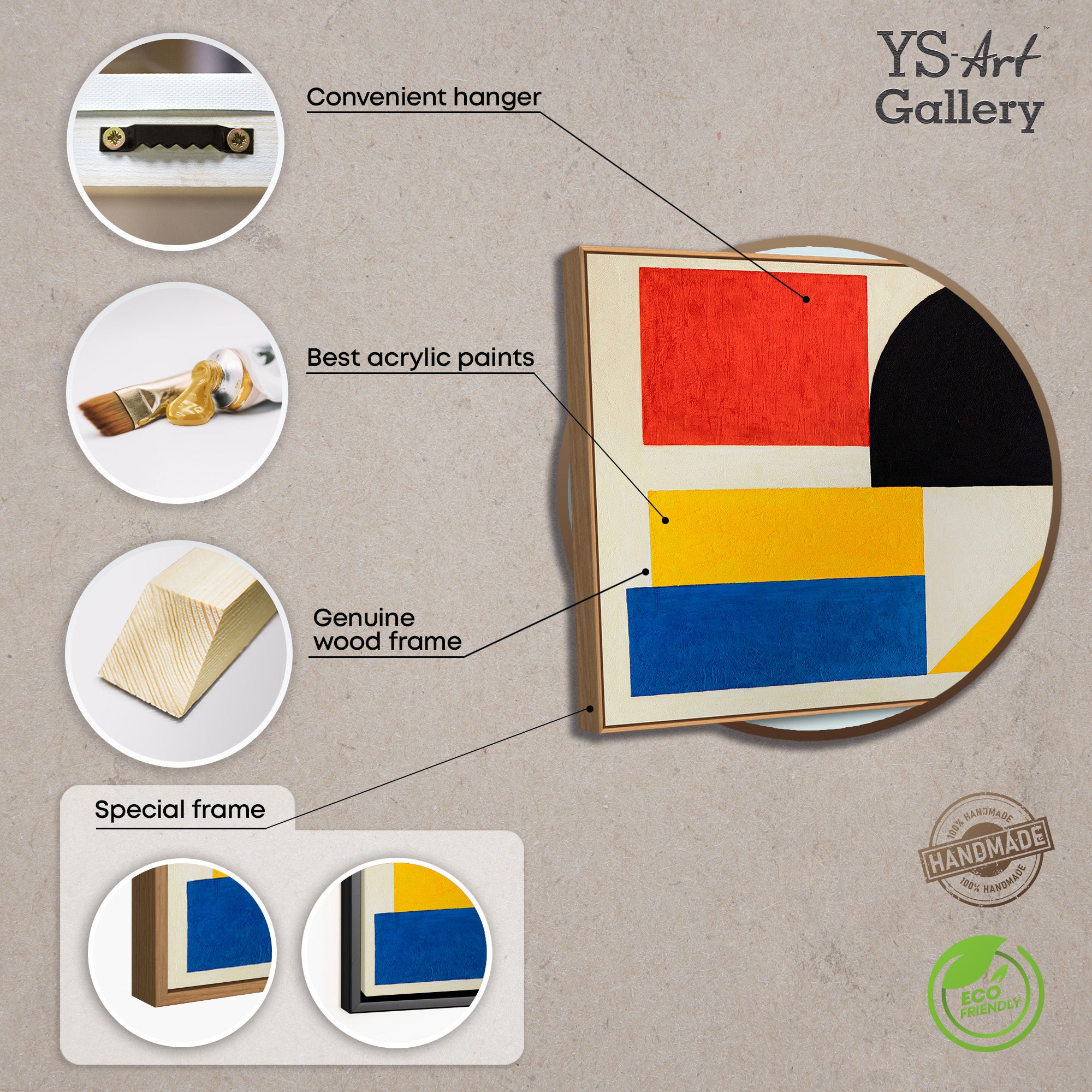 Tämä abstrakti maalaus kukoistaa selkeillä värikentillä ja vahvoilla kontrasteilla. Intensiiviset punaiset, keltaiset ja siniset kohtaavat syvän mustan ja rauhallisten vaaleiden alueiden. Geometrinen sommittelu näyttää tasapainoiselta mutta voimakkaalta, ja teksturoitu akryylipinta korostaa selvästi sen käsinmaalattua luonnetta.