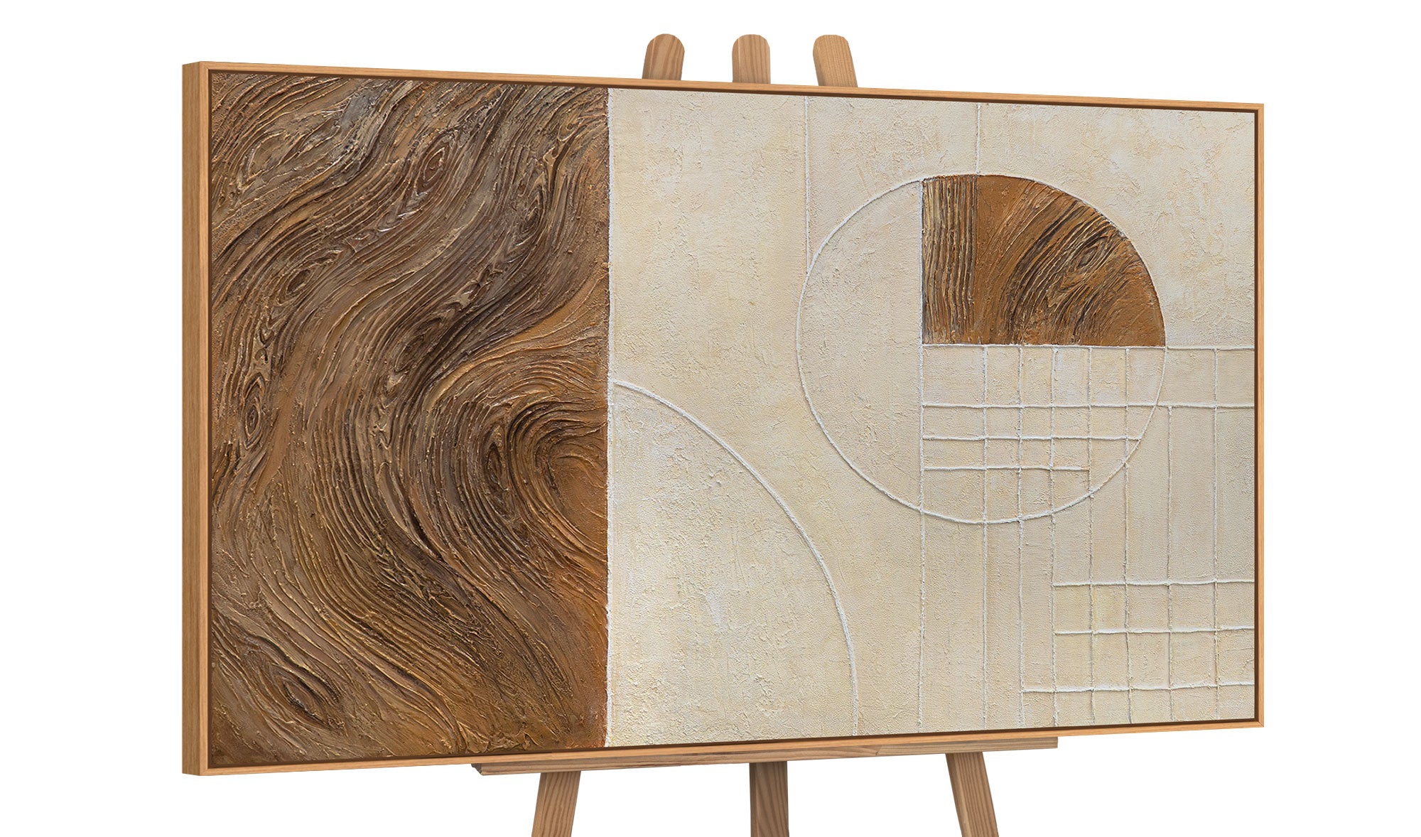 „Linjat ja Kehykset“ on kontrastien ja tasapainon leikki. Toisaalta luonnollinen puupinta lämpimissä ruskeissa sävyissä virtaa, ja toisaalta geometriset viivat ja ympyrät syntyvät rauhallisessa beigessä. Tämä kompositio yhdistää luonnon ja arkkitehtuurin, liikkeen ja tarkkuuden – teos, joka edustaa rauhaa ja dynamiikkaa yhtä aikaa.