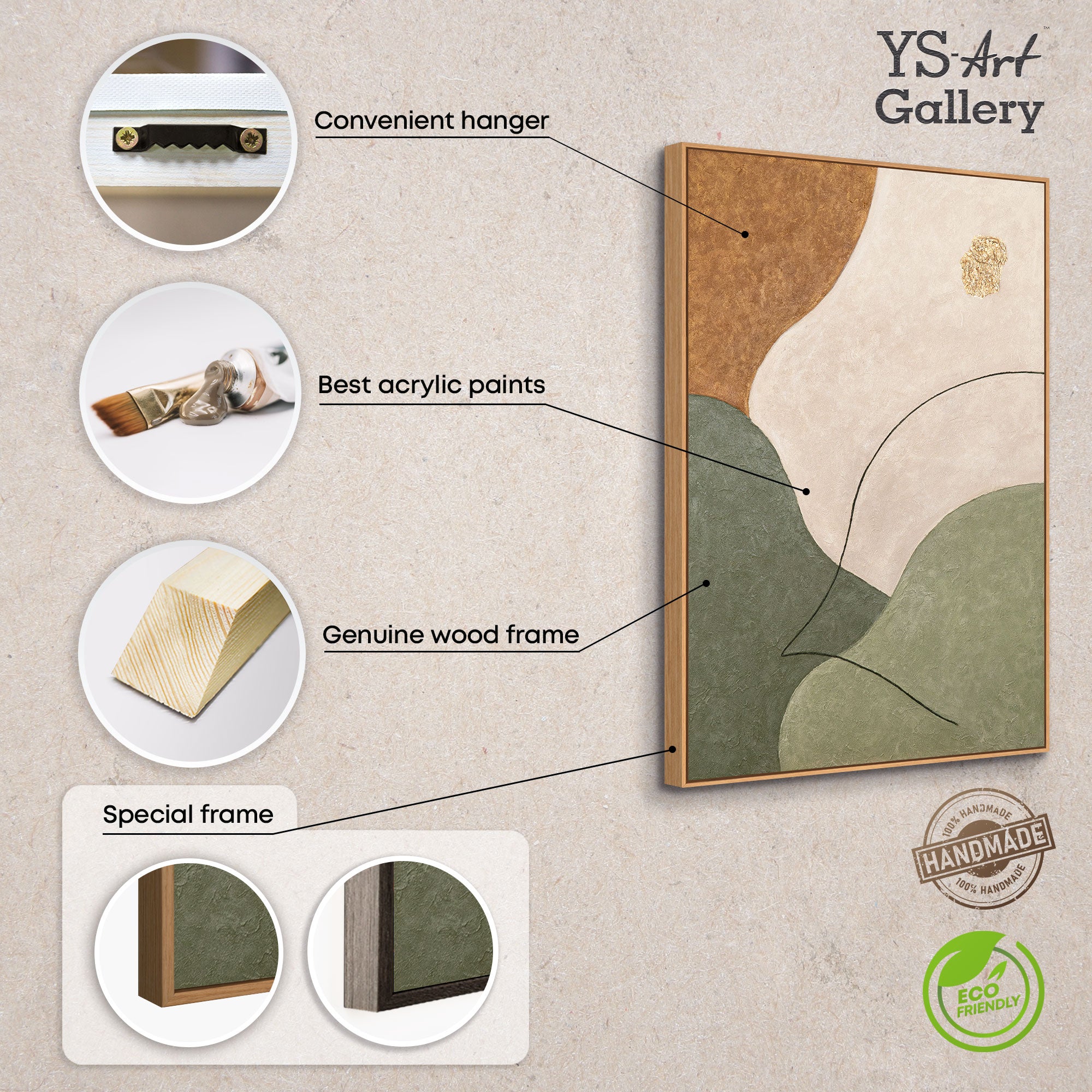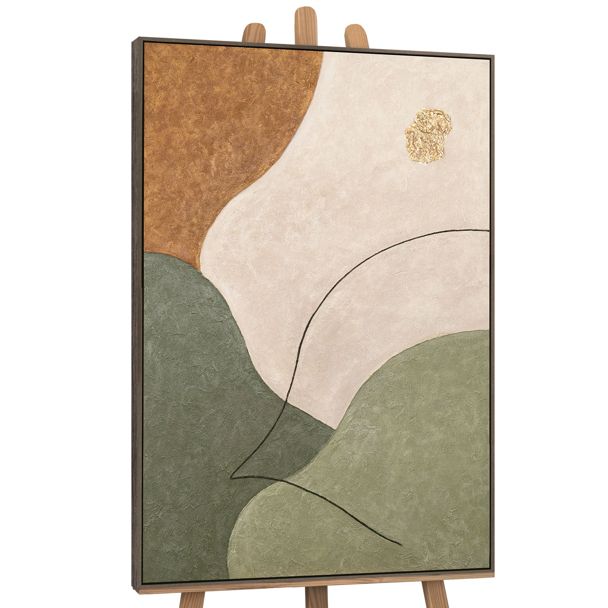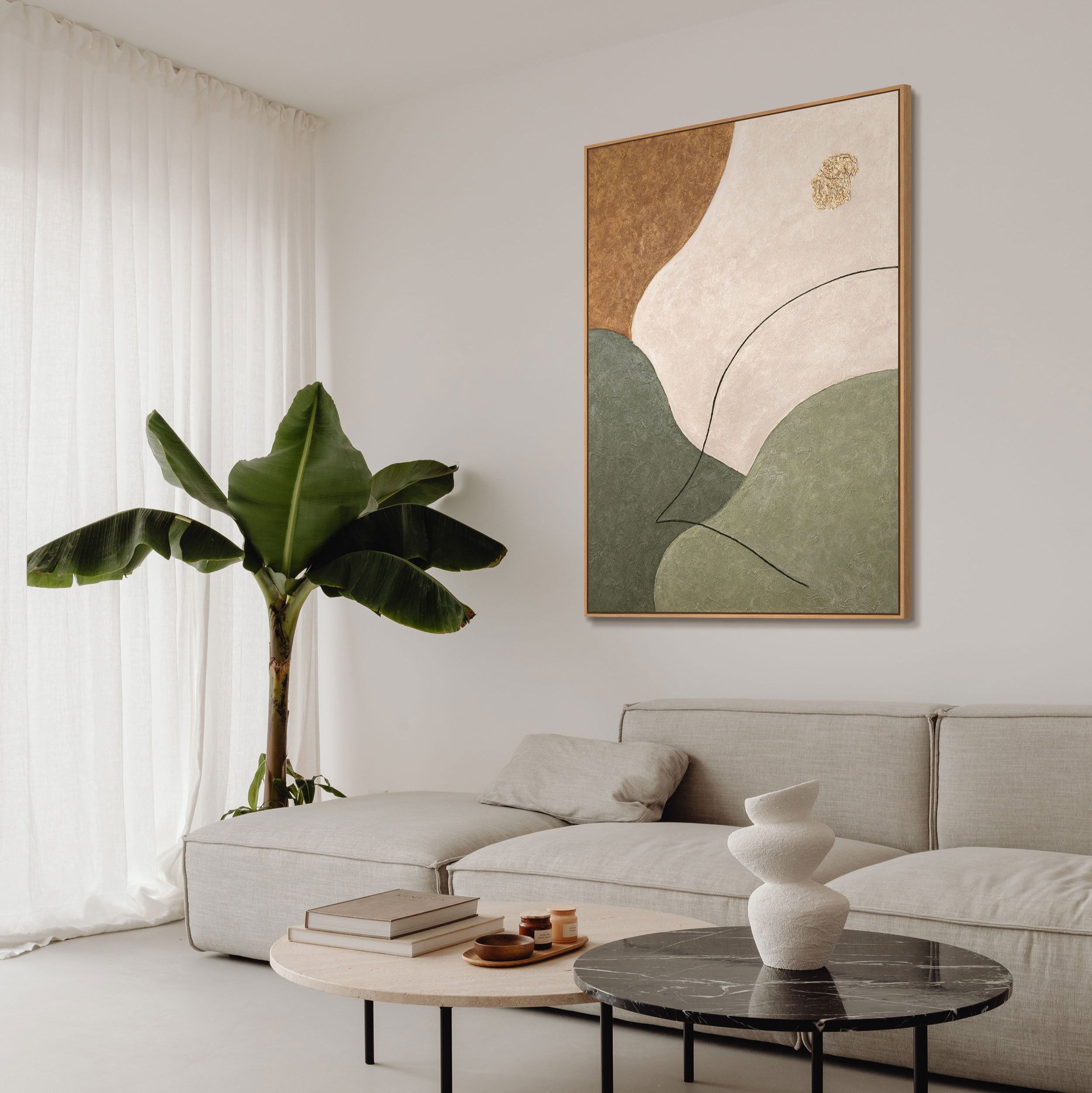 Tuo kotiisi eleganssia ja rauhaa tällä käsintehdyllä abstrakti taulu. Lämmin ruskea, pehmeä beige, rauhoittava vihreä ja kultainen korostus tekevät tästä abstrakti maalaus todellisen katseenvangitsijan.