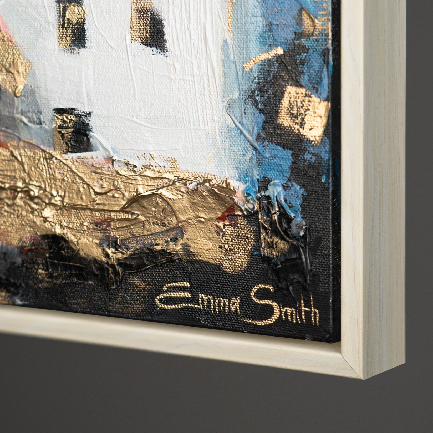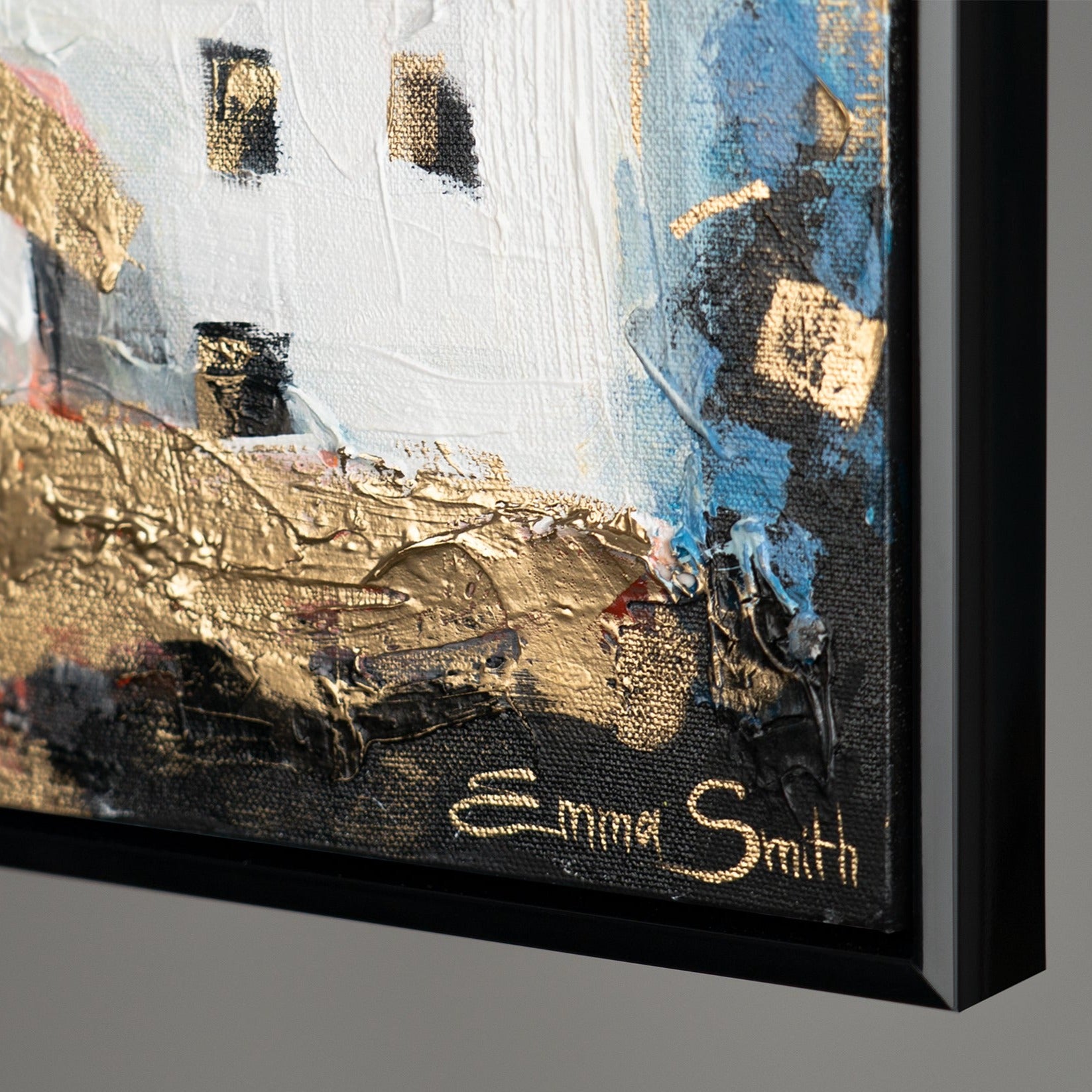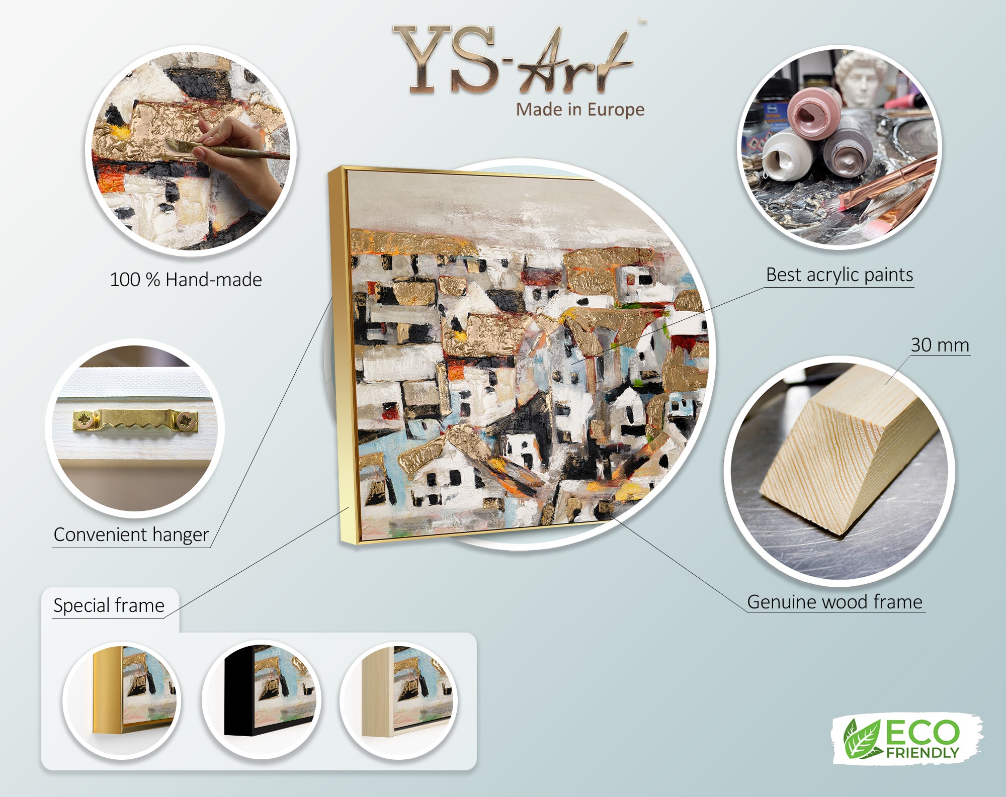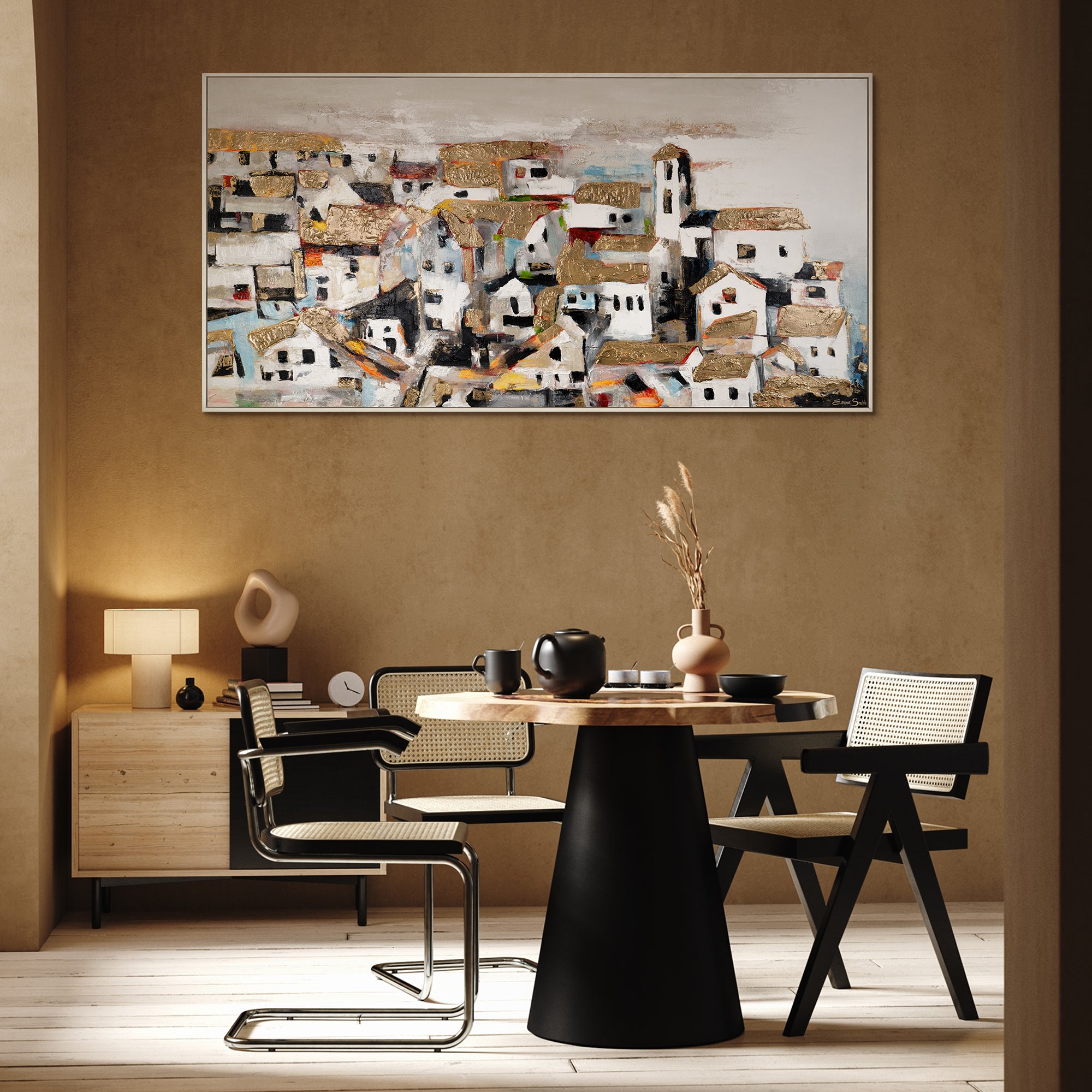 Rikastuta kotisi tai toimistosi tällä värikkäällä, abstraktilla taideteoksella, joka esittää maalauksellisen kaupunkimaiseman eloisin värein. Maalaus erottuu voimakkaiden värien ja ilmeikkäiden siveltimen vetojen ansiosta. Se on 100 % käsinmaalattu ja korostettu tyylikkäällä kehystyksellä.