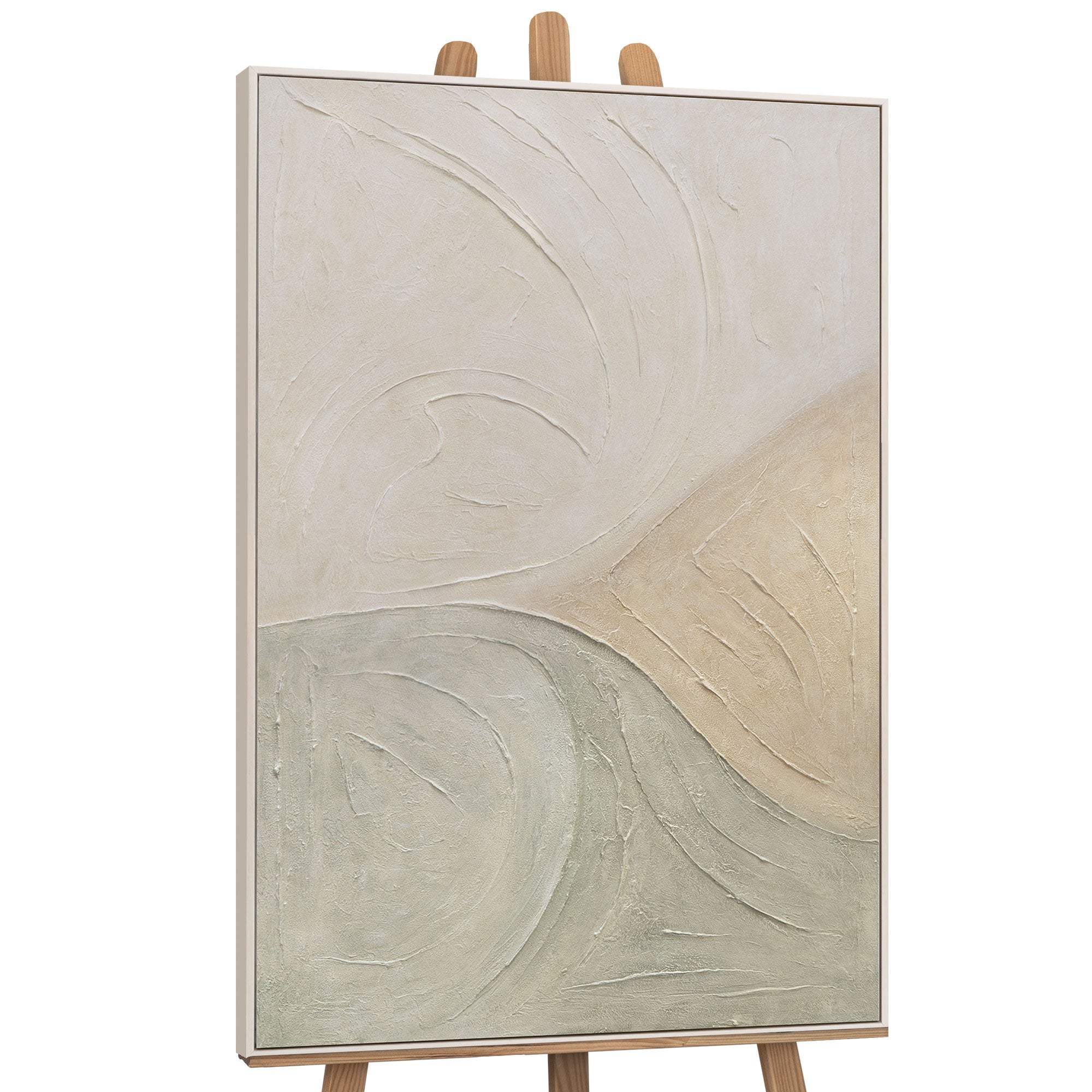 „Spuren des Regens“ bringt die stille Schönheit natürlicher Texturen auf die Leinwand. Zarte Linien und sanfte Farbflächen in Beige und Grün verschmelzen zu einer harmonischen Komposition, die an Wasserläufe und Windspuren erinnert. Die feine Struktur schafft Tiefe und lädt zum Innehalten ein.